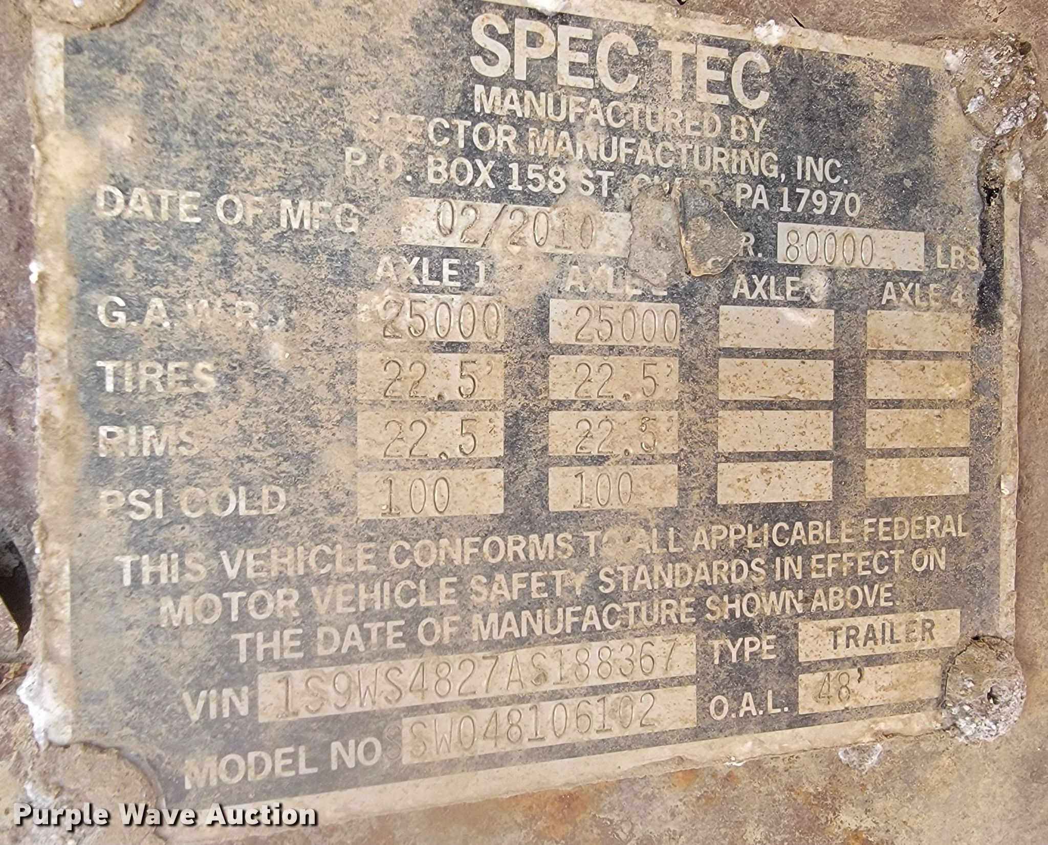 2010 Spectec SW048106102 walking floor trailer. VIN: 1S9WS4827AS188367. Dimensions Overall: 48' L x 102" W, Side height: 100". Features Body type: Steel, Floor: Walking floor, Roll tarp. Chassis Landing gear: Dual, Suspension: Spring, Brakes: Air, Axles: Tandem, GVWR: 80,000 lbs, GAWR: 25,000 lbs. Tires Steel wheels, Size: 295/75R22.5. Notes Tarp damaged. South Dakota title. Title distribution may be delayed up to 14 days from verification of funds. City of Yankton. 700 Levee Street. Yankton, SD 57078