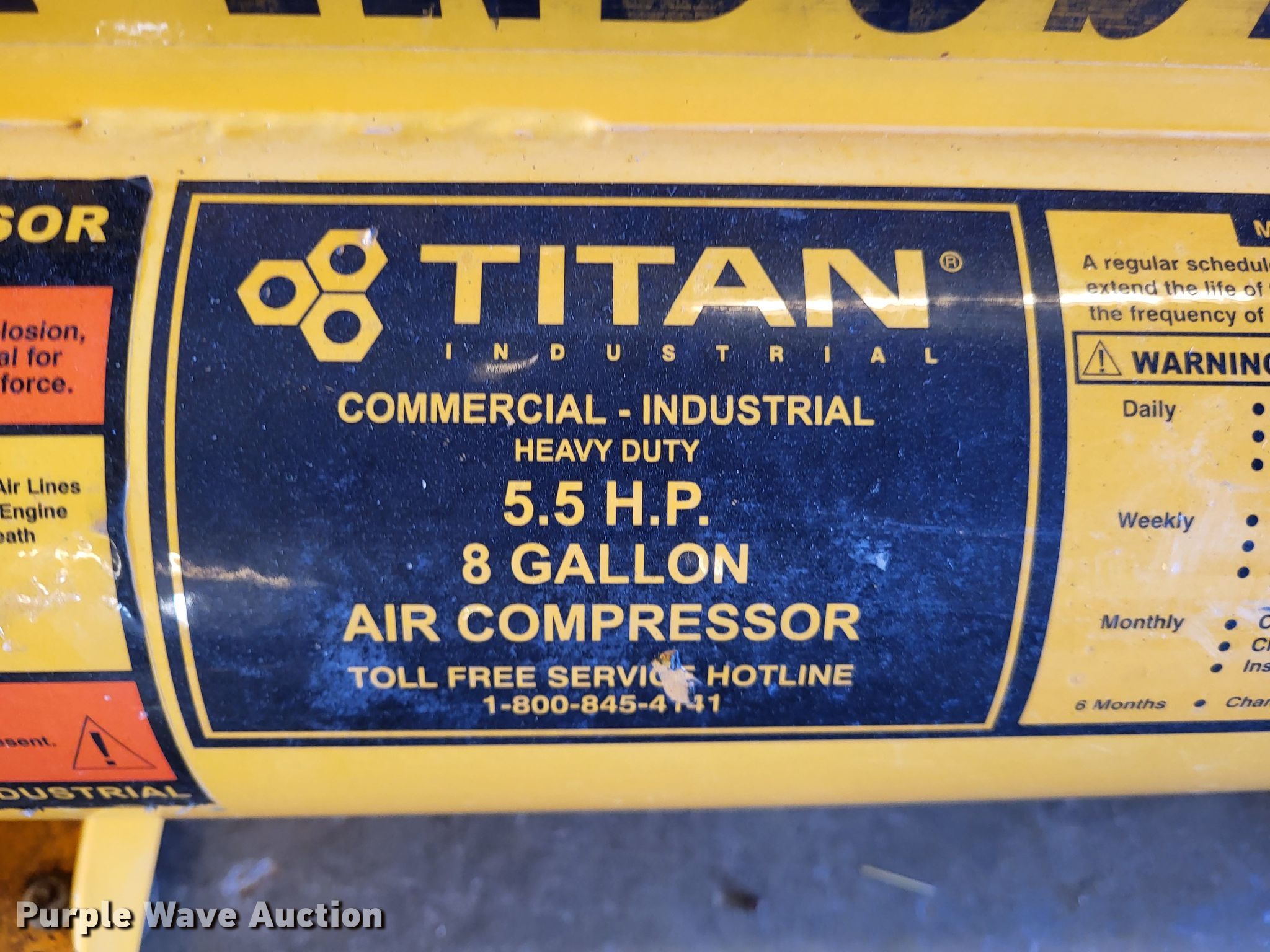 Titan Industrial TAC-2T air compressor. Serial: TAC12354. Engine LCT, Fuel type: Gas, HP: 5.5. Features Air compressor Tank capacity: 8 gallons. Ste. Genevieve County, MO. 13432 River Auxvasses Church Road. Ste. Genevieve, MO 63670