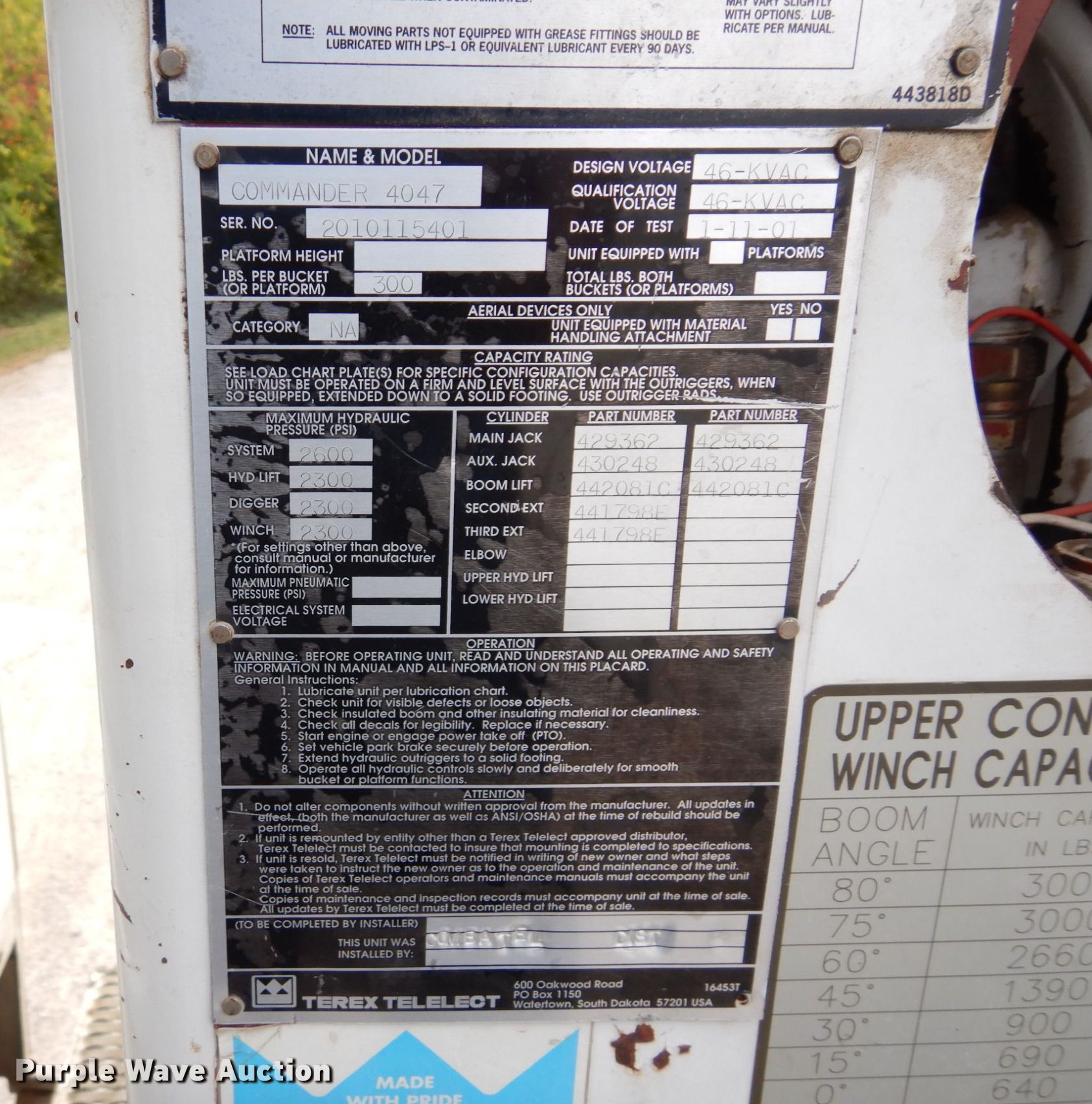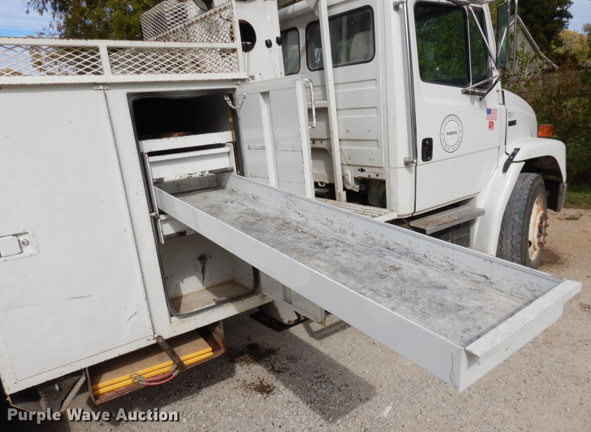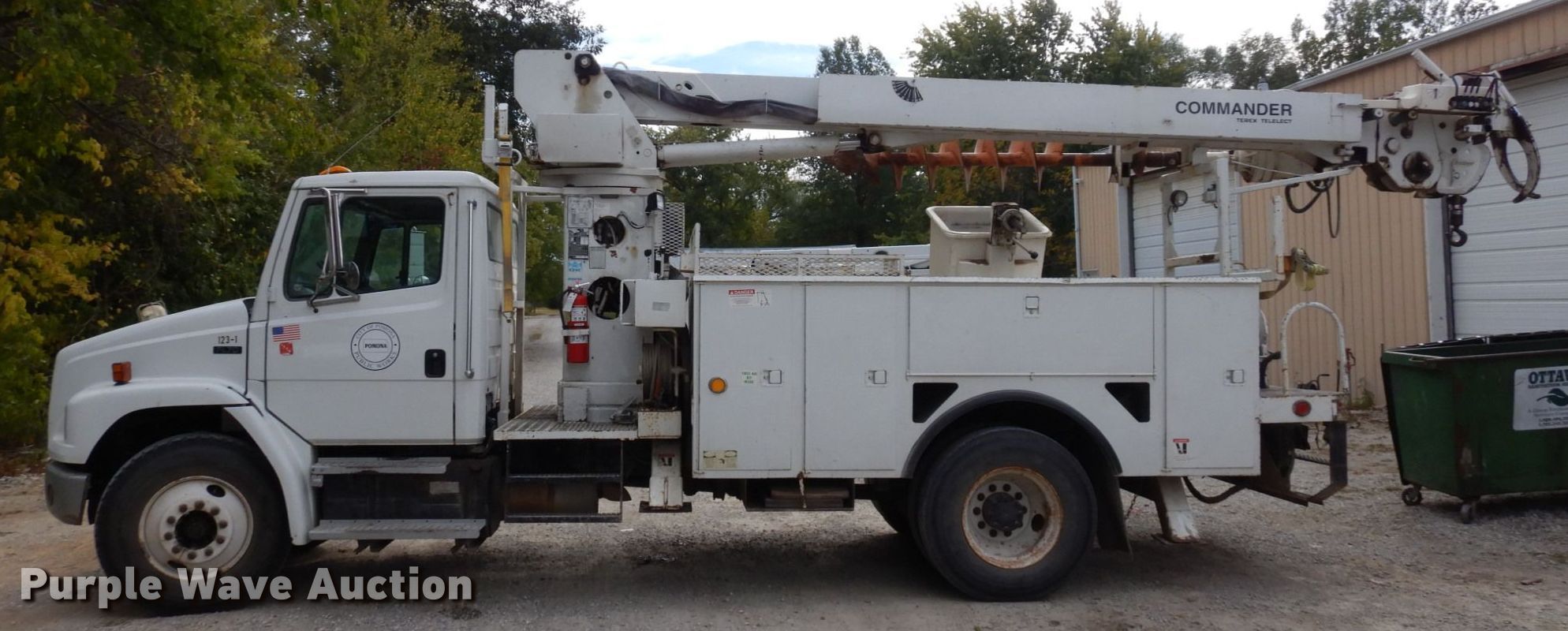 2001 Freightliner FL70 digger derrick truck. Miles: 74,683 on odometer, Hours: 622 on meter, VIN: 1FVABTAK41HJ07124. Engine Caterpillar 3126, Serial: 8YL89517, Displacement: 7.2L, Cylinders: 6, Fuel type: Diesel, HP: 230. Transmission Allison, Automatic. Chassis Differential lock: Inter-axle, Axles: Single, Suspension: Spring, Brakes: Air, PTO, GVWR: 33,000 lbs. Interior AC, Heat, Heated mirrors, Cruise control, Brake controller. Features Bed Terex Telelect, Serial: TNO5865, 13' L x 7' 10" W, Boom Commander 4047, Serial: 2010115401, Boom length: 48', Maximum lift capacity: 300 lbs, Boom type: Articulating, Insulated, Telescopic, Man basket, Boom controls Ground, Platform/ basket, Material handler, Pole guide, Auger Diameter: 20".. Tires Size: 11R22.5. Notes Hydraulic leak Dielectric oil replaced with hydraulic oil. Kansas title. City of Pomona. 219 Jefferson Street. Pomona, KS 66076