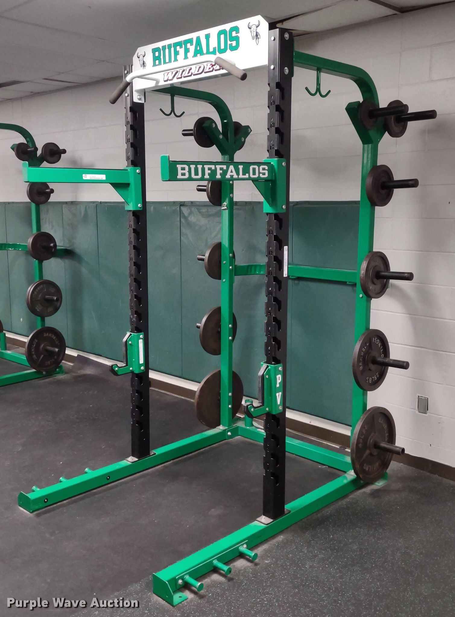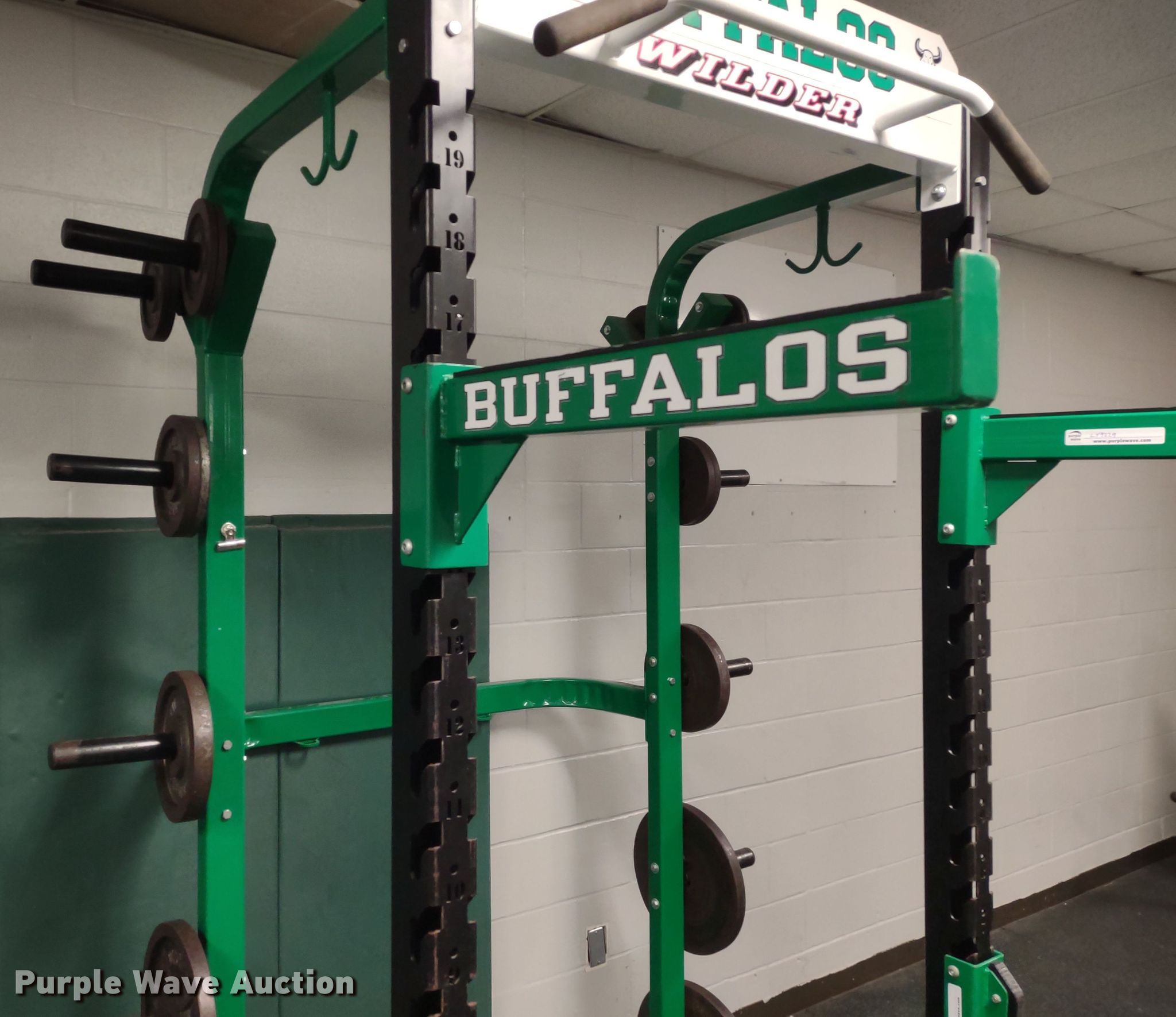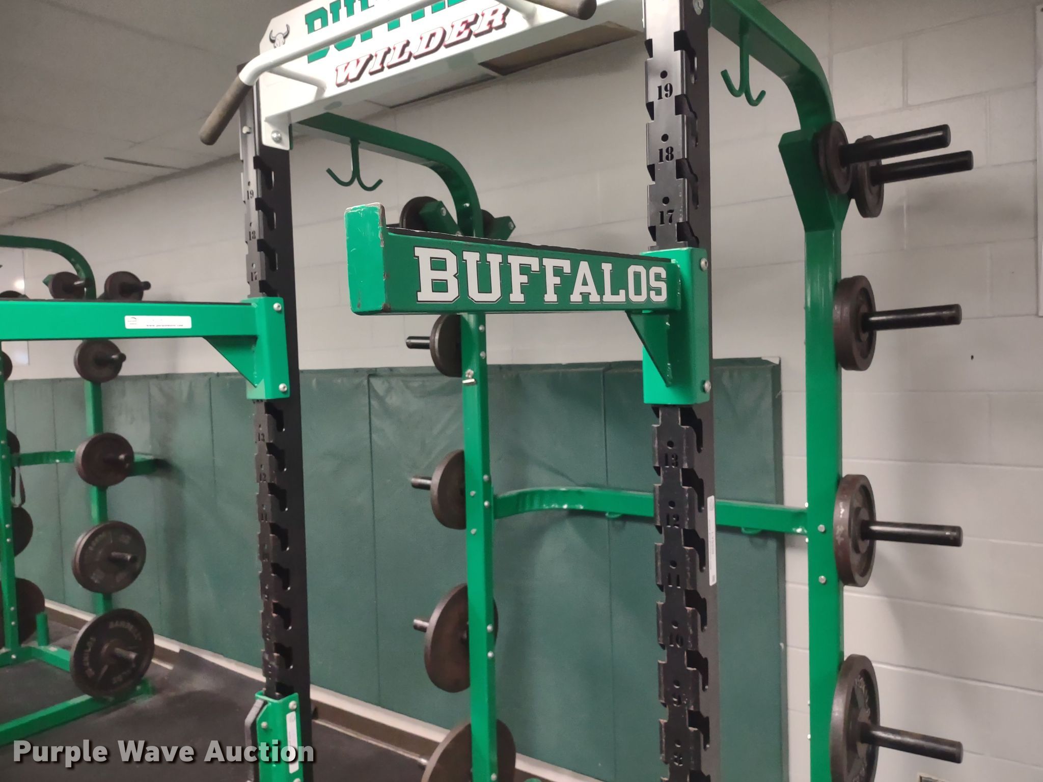 Purple Wave is selling a used Sporting Goods in Kansas. This item is a Wilder power rack with the following: 69" L x 69" W x 103" H, Bar Catch Attachment, Spot Bar Attachment, Weights, (2) 45lbs, (2) 35lbs, (2) 25lbs, (4) 10lbs, (4) 5lbs, (4) 2.5lbs
