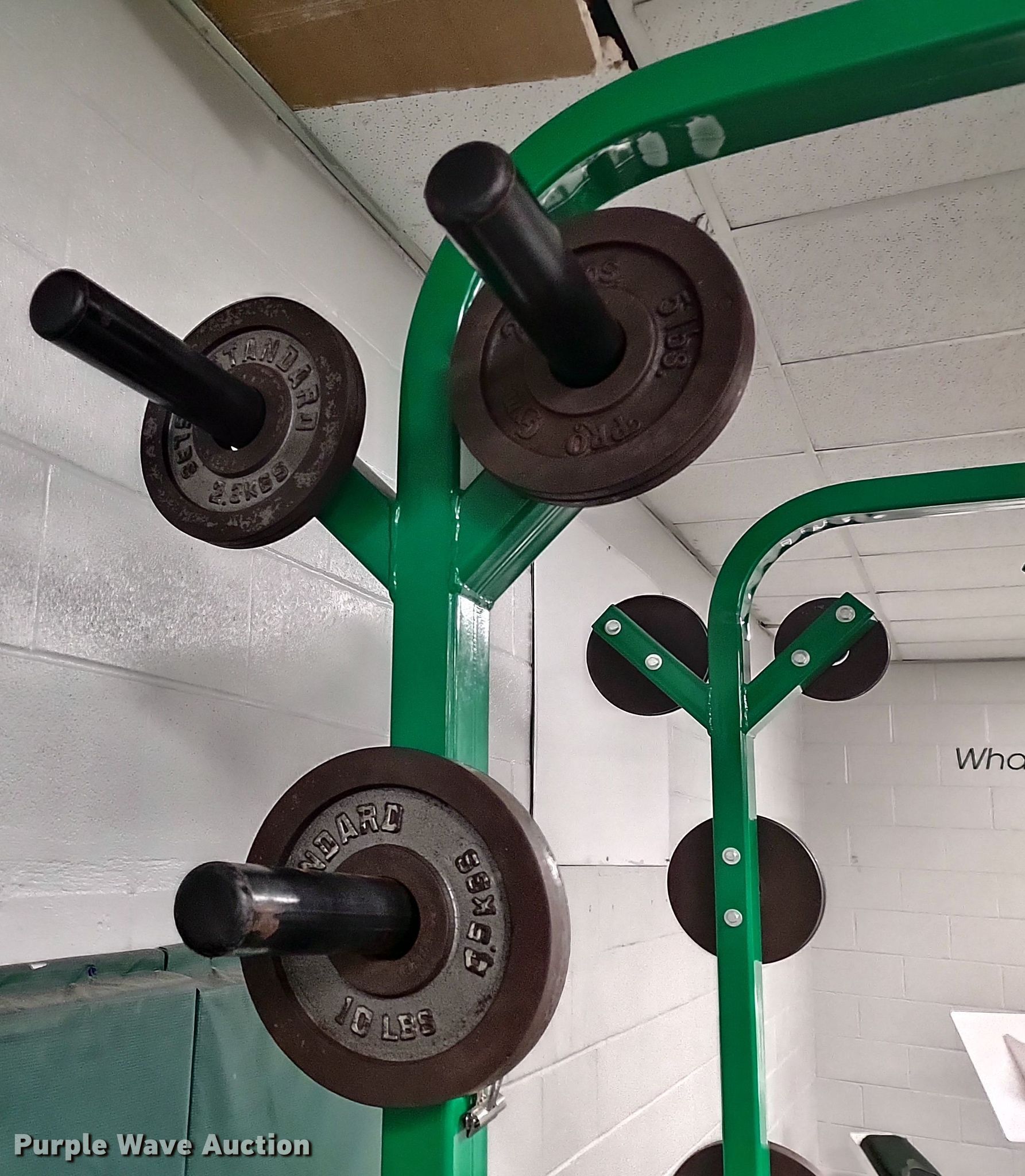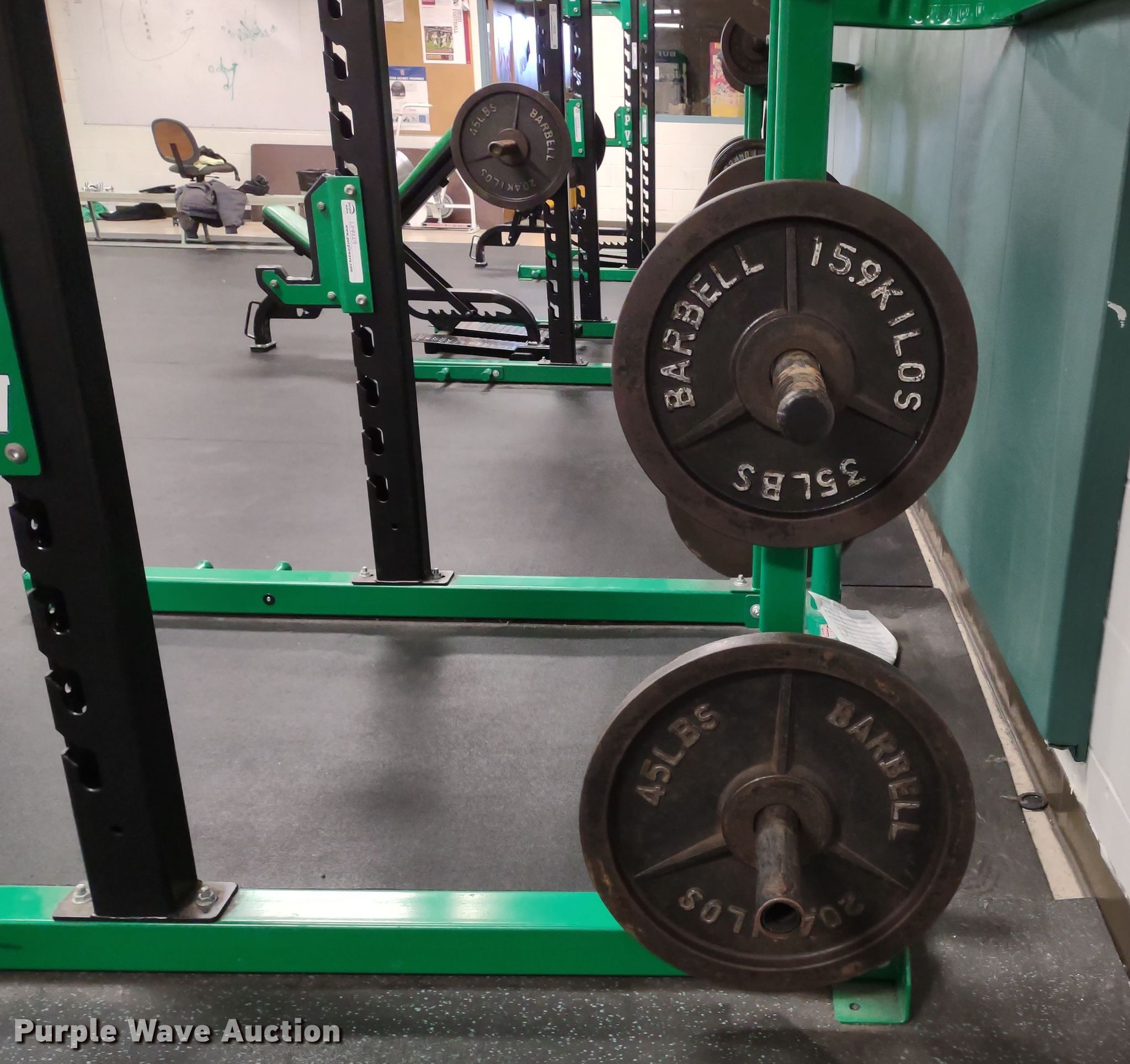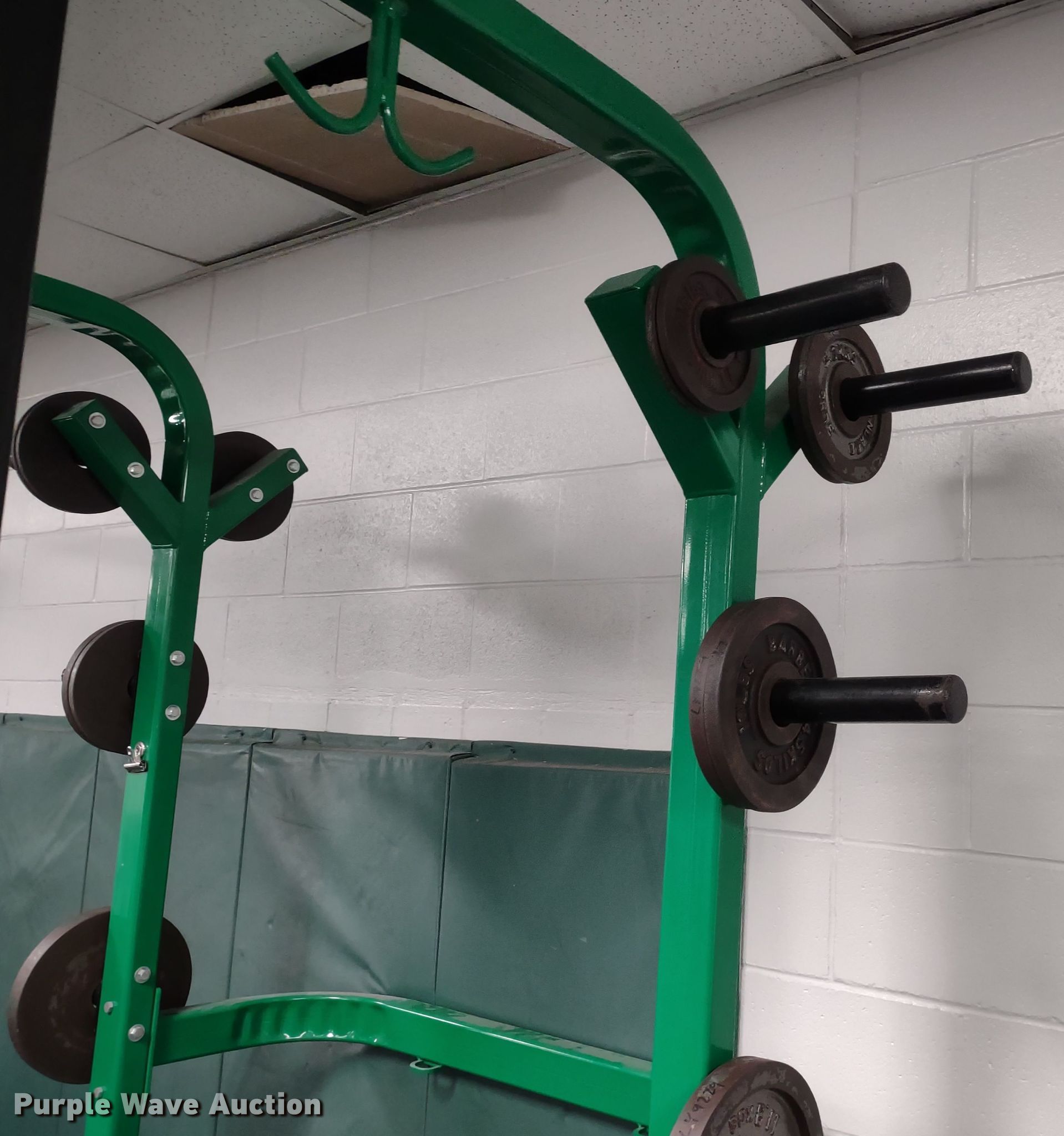 Purple Wave is selling a used Sporting Goods in Kansas. This item is a Wilder power rack with the following: 69" L x 69" W x 103" H, Bar Catch Attachment, Spot Bar Attachment, Weights, (2) 45lbs, (2) 35lbs, (2) 25lbs, (4) 10lbs, (4) 5lbs, (4) 2.5lbs