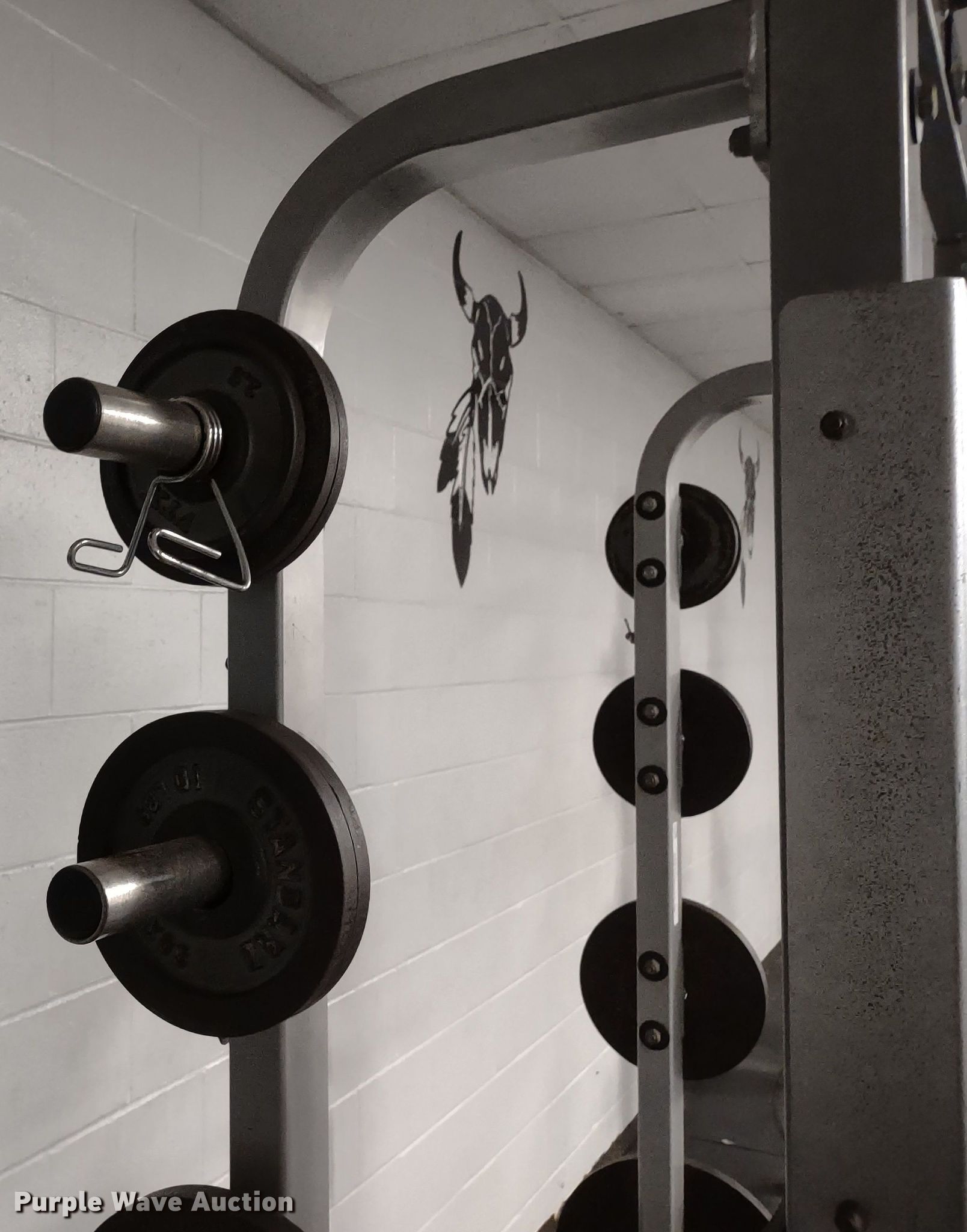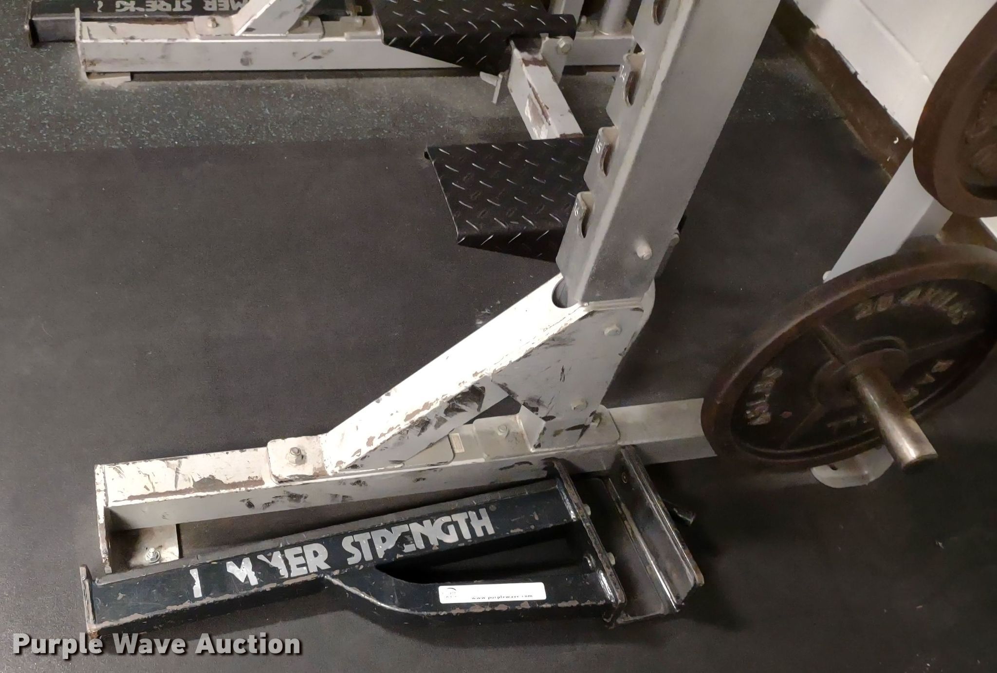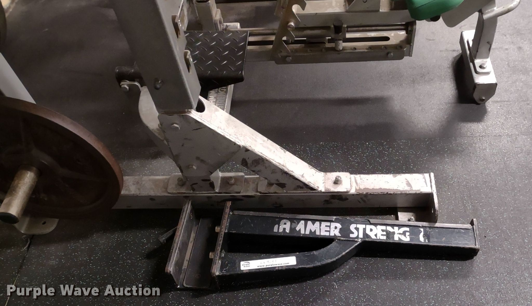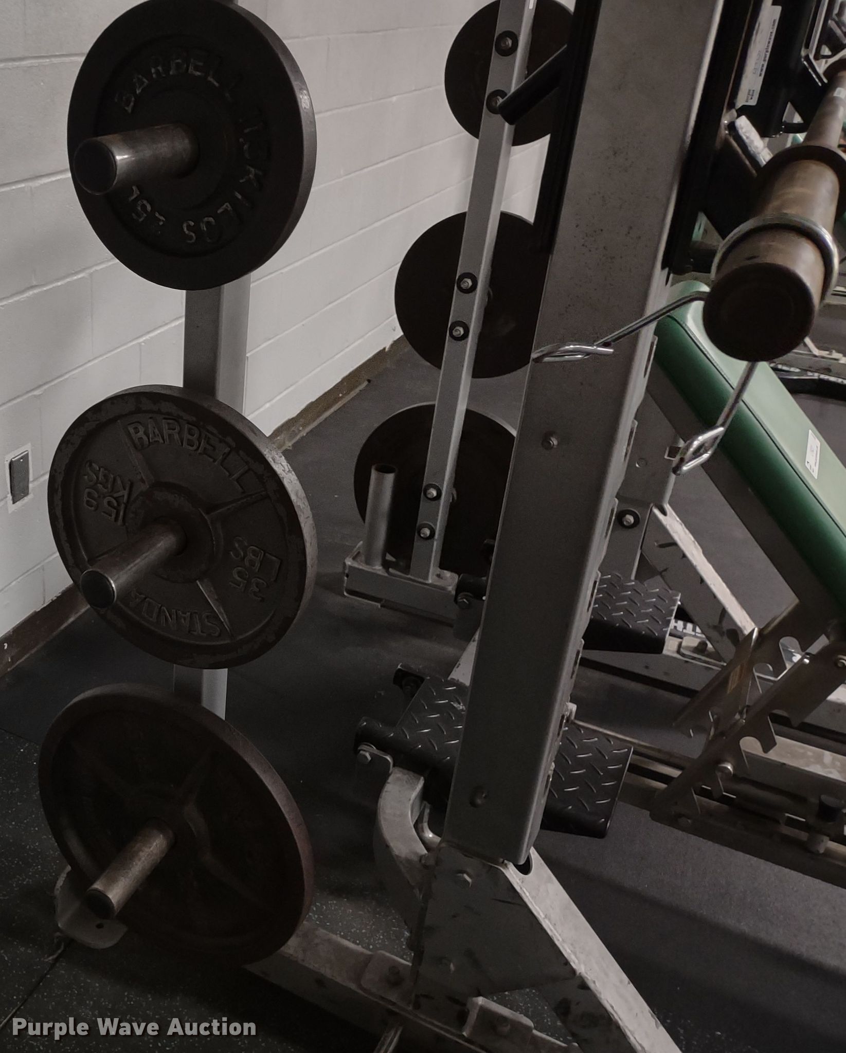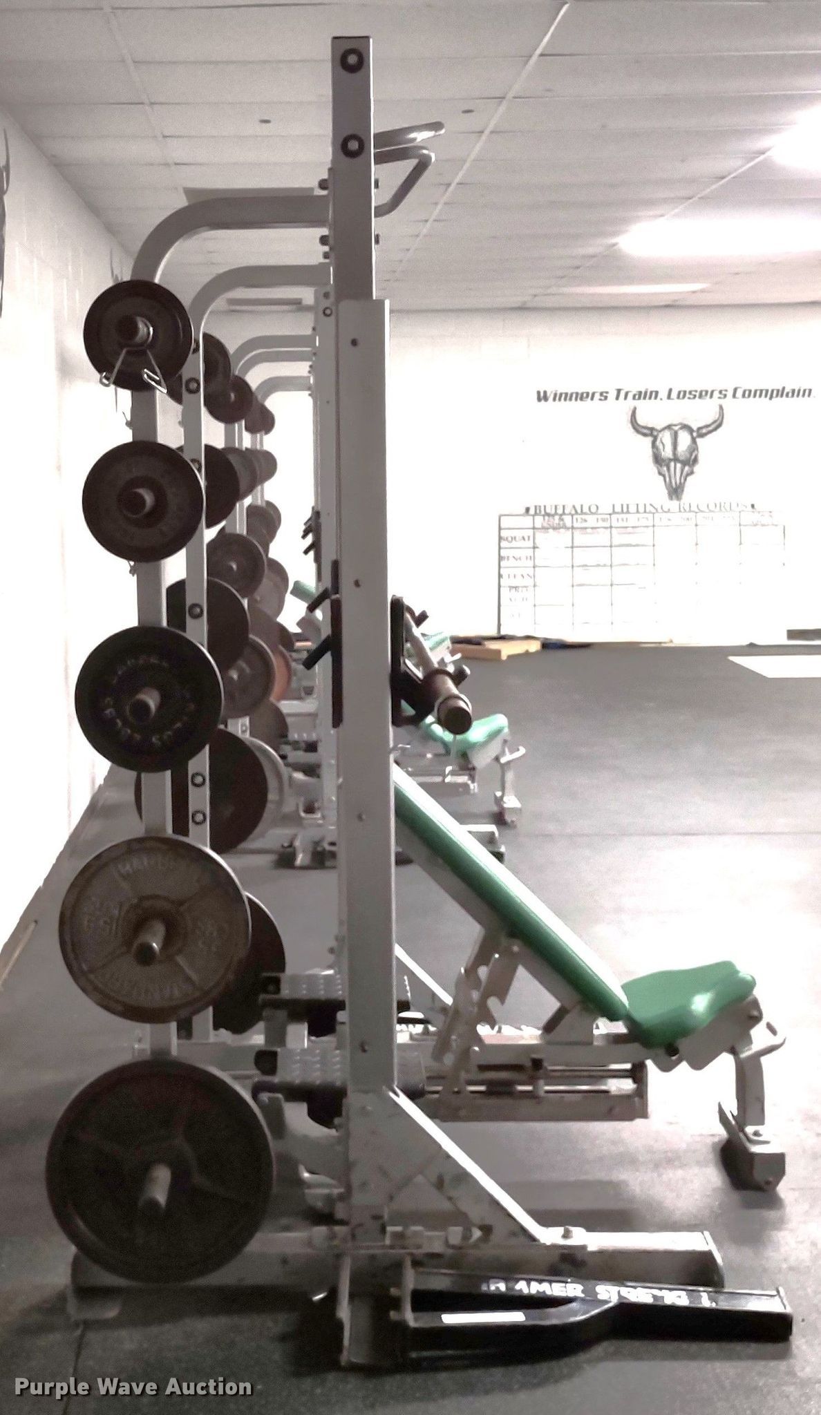 Purple Wave is selling a used Sporting Goods in Kansas. This item is a Hammer Strength power rack with the following: 51' L x 65" W x 96" H, Bench, Barbell, Bar Catch Attachment, Spot Bar Attachment, Weights, (2) 45lbs, (2) 35lbs, (2) 25lbs, (4) 10lbs, (2) 5lbs, (2) 2.5lbs