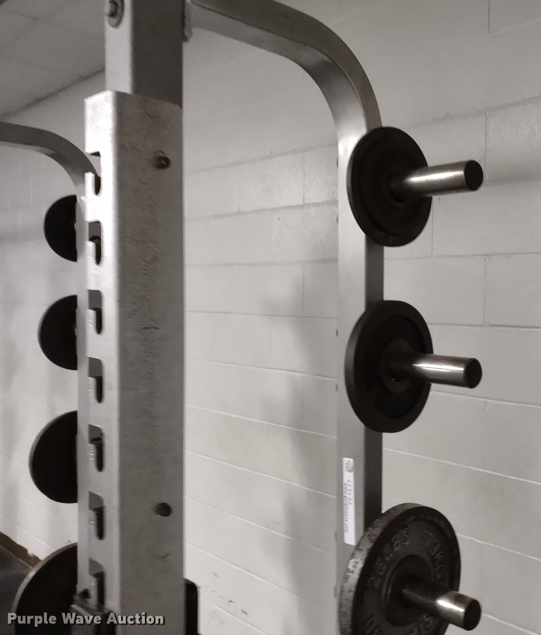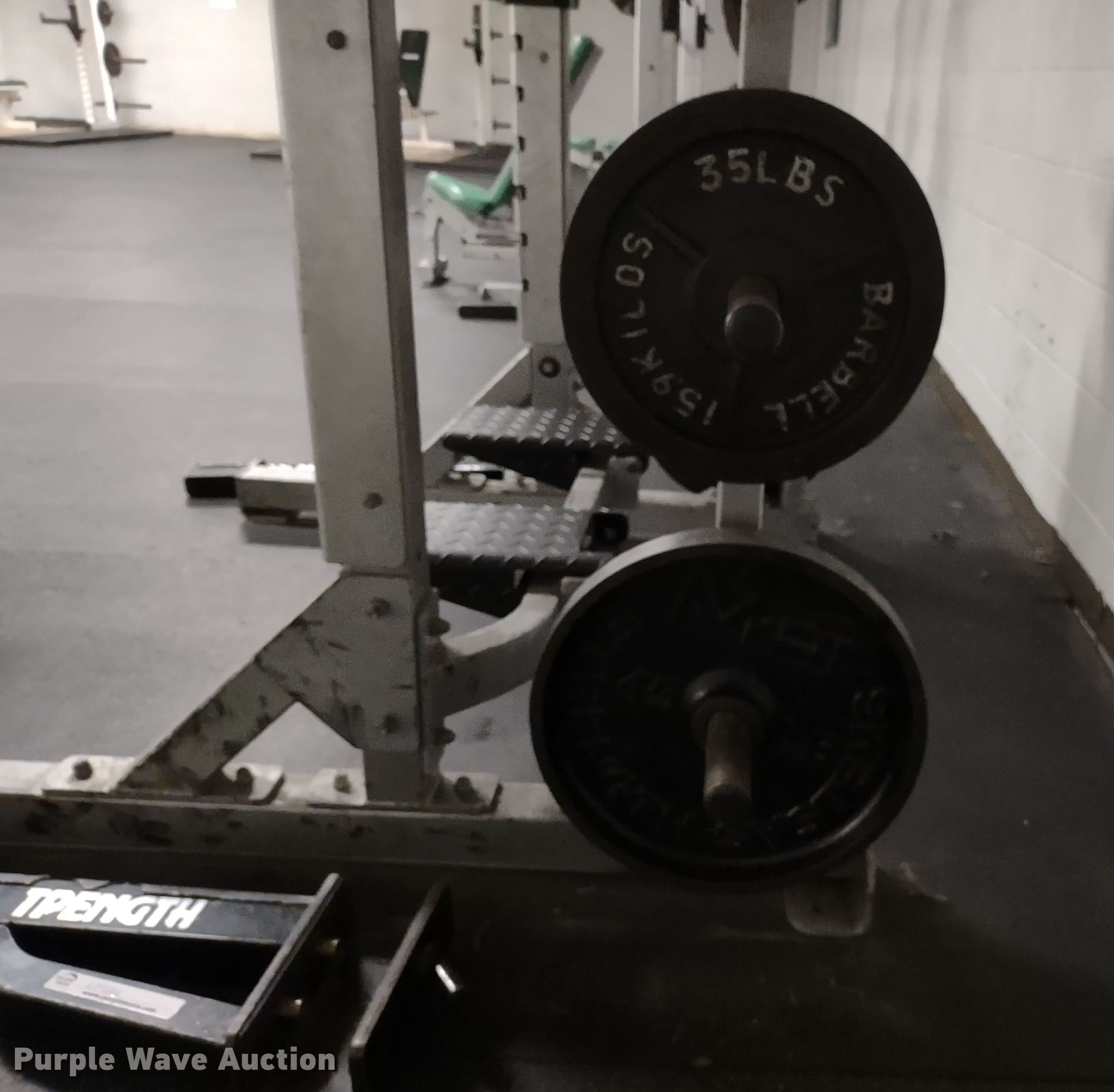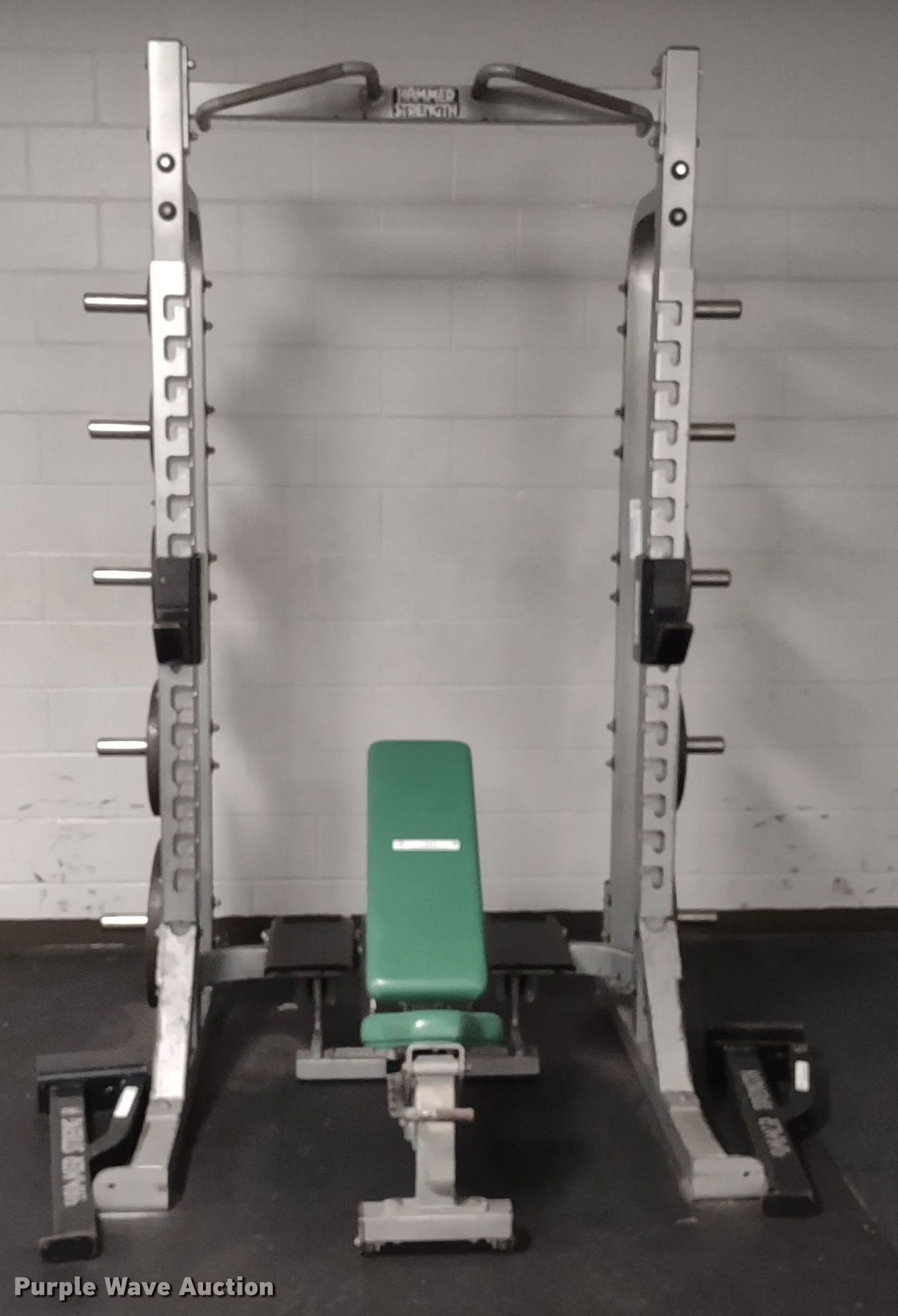 Purple Wave is selling a used Sporting Goods in Kansas. This item is a Hammer Strength power rack with the following: 51' L x 65" W x 96" H, Bench, Bar Catch Attachment, Spot Bar Attachment, Weights, (2) 45lbs, (2) 35lbs, (2) 25lbs, (2) 10lbs, (2) 5lbs, (2) 2.5lbs