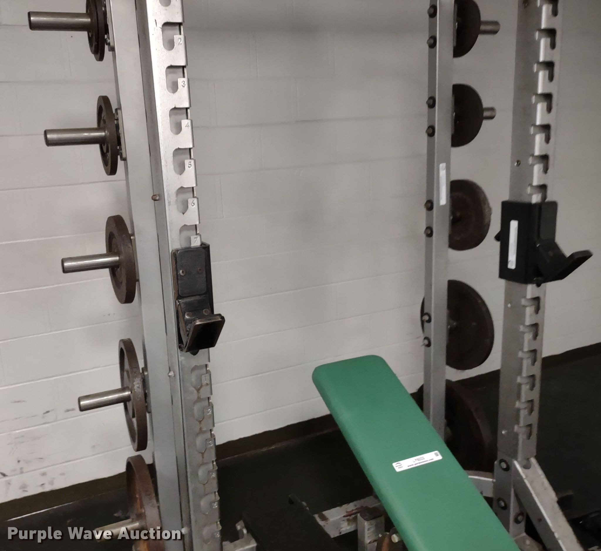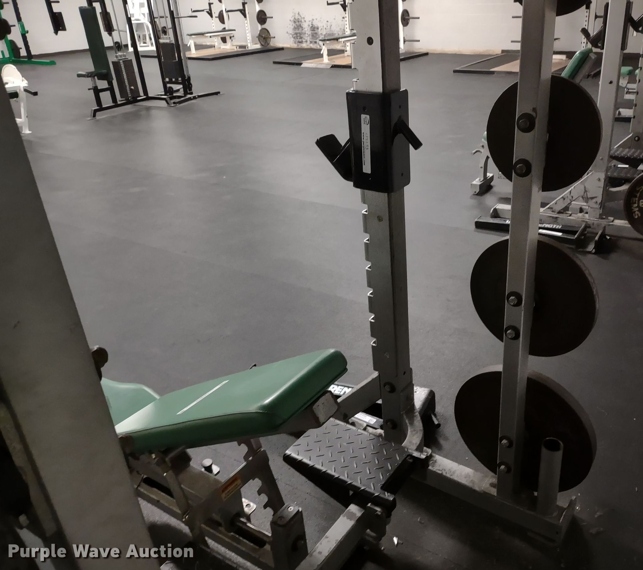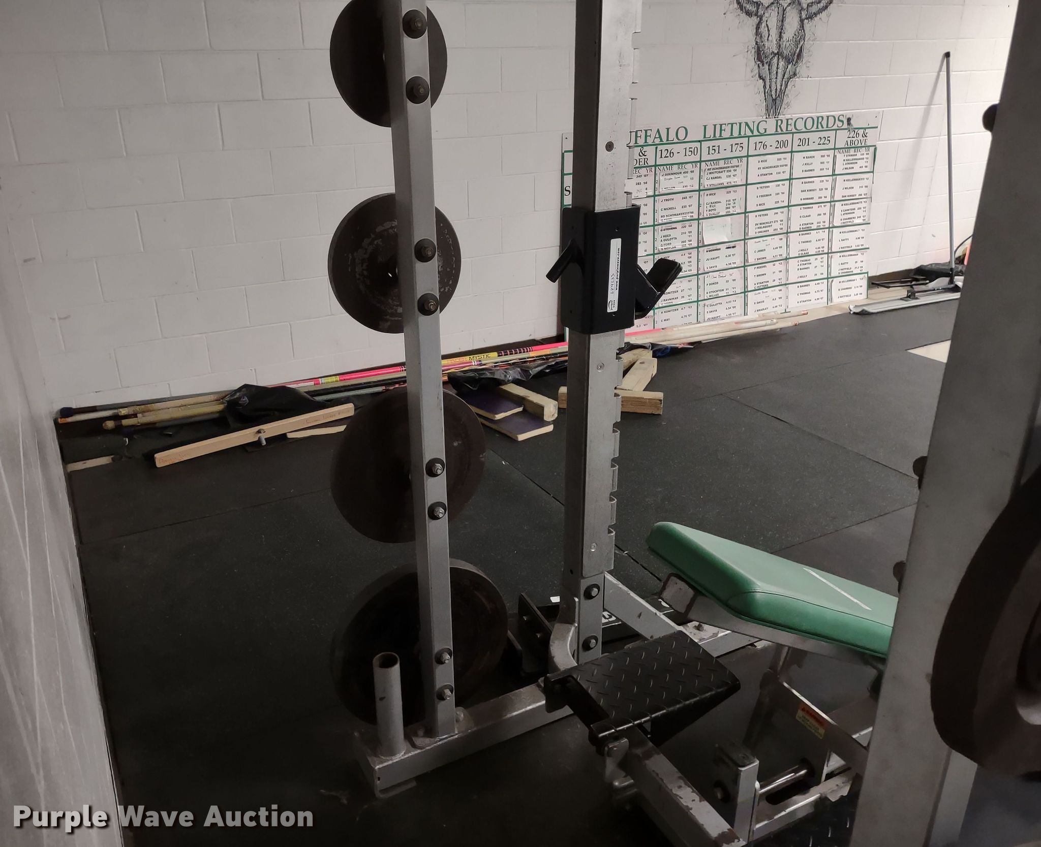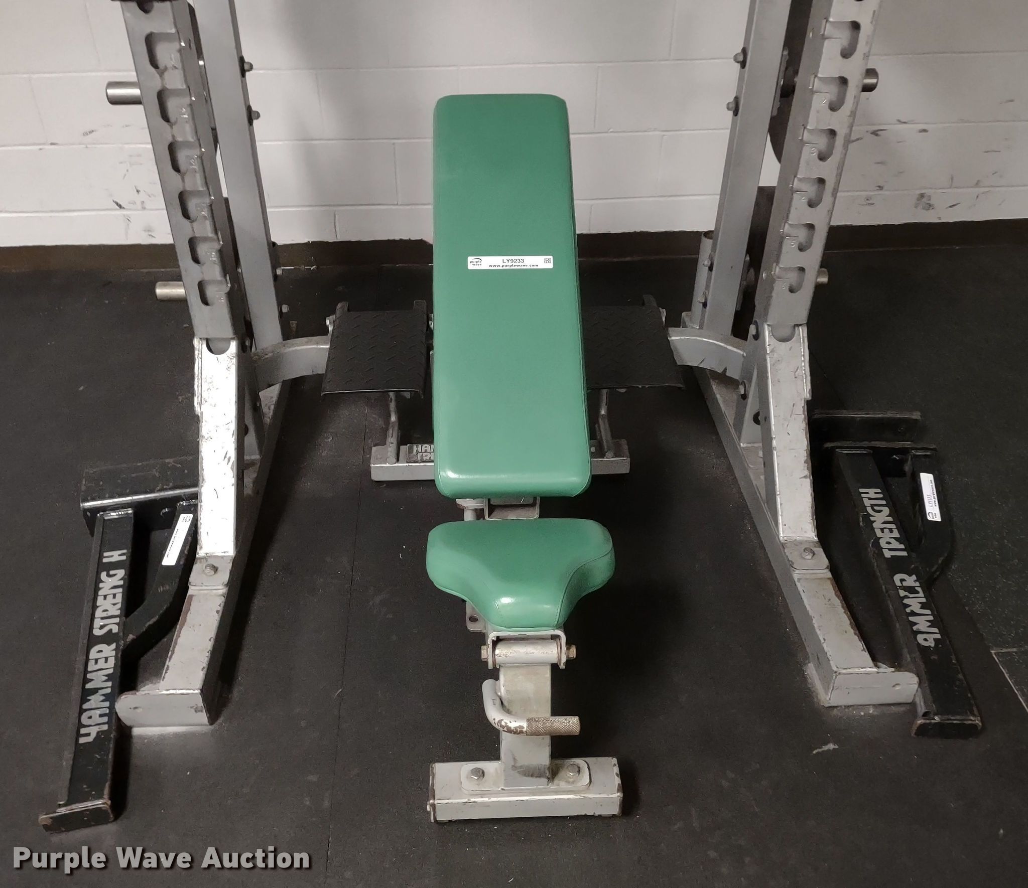Purple Wave is selling a used Sporting Goods in Kansas. This item is a Hammer Strength power rack with the following: 51' L x 65" W x 96" H, Bench, Bar Catch Attachment, Spot Bar Attachment, Weights, (2) 45lbs, (2) 35lbs, (2) 25lbs, (2) 10lbs, (2) 5lbs, (2) 2.5lbs