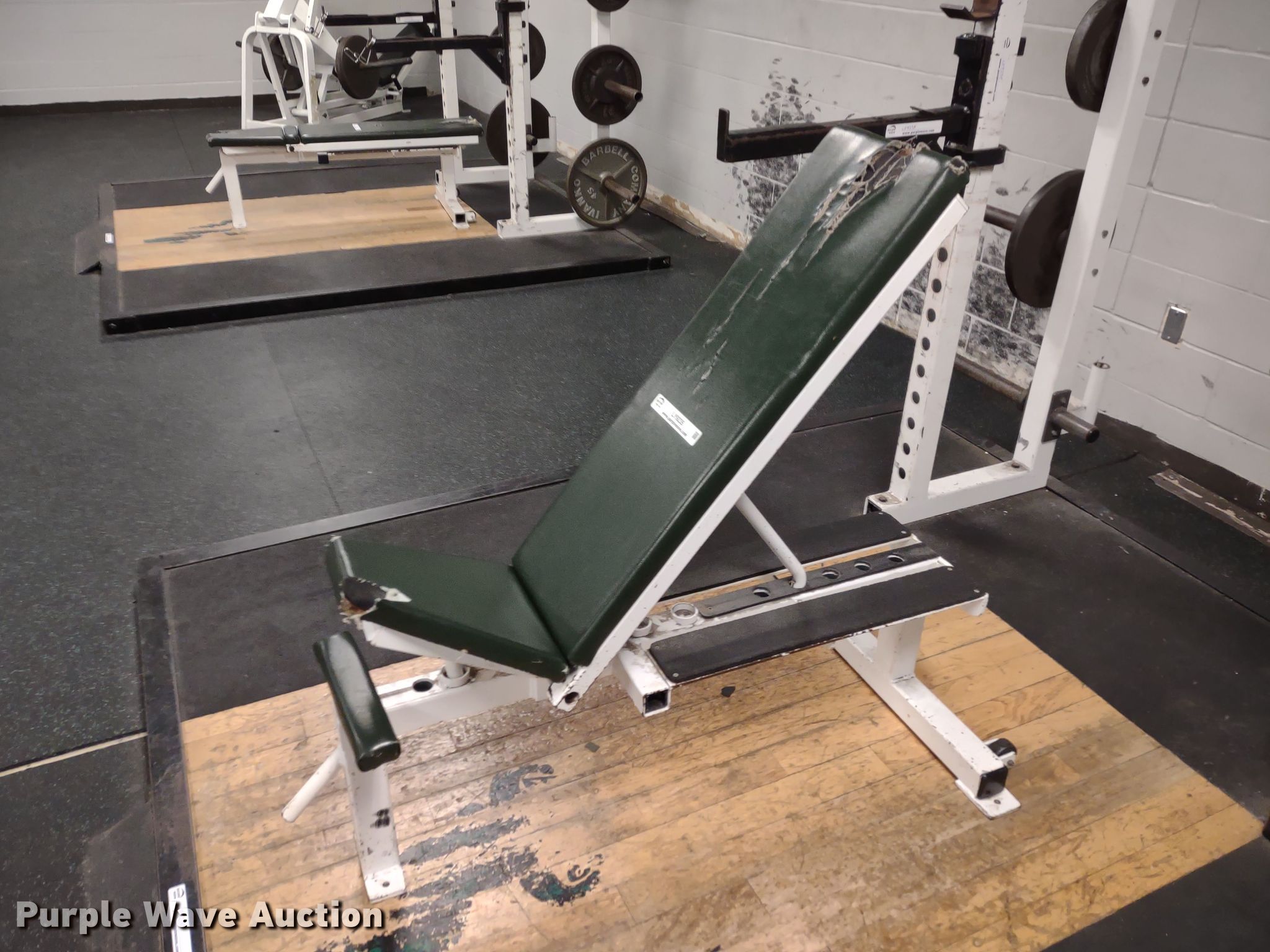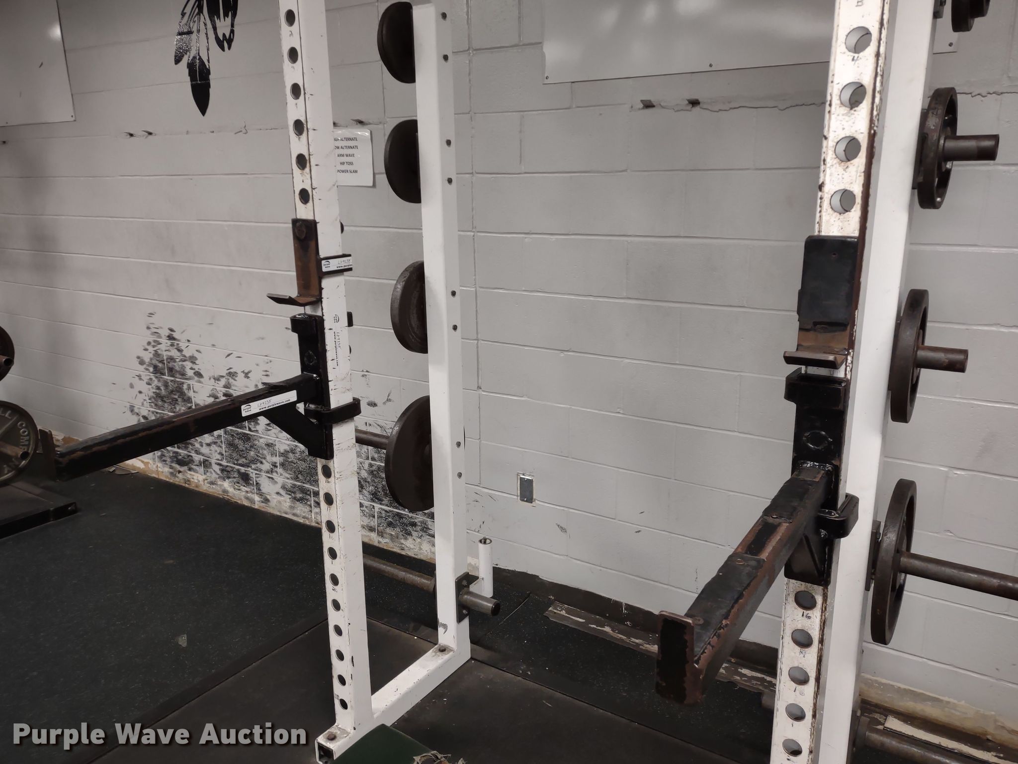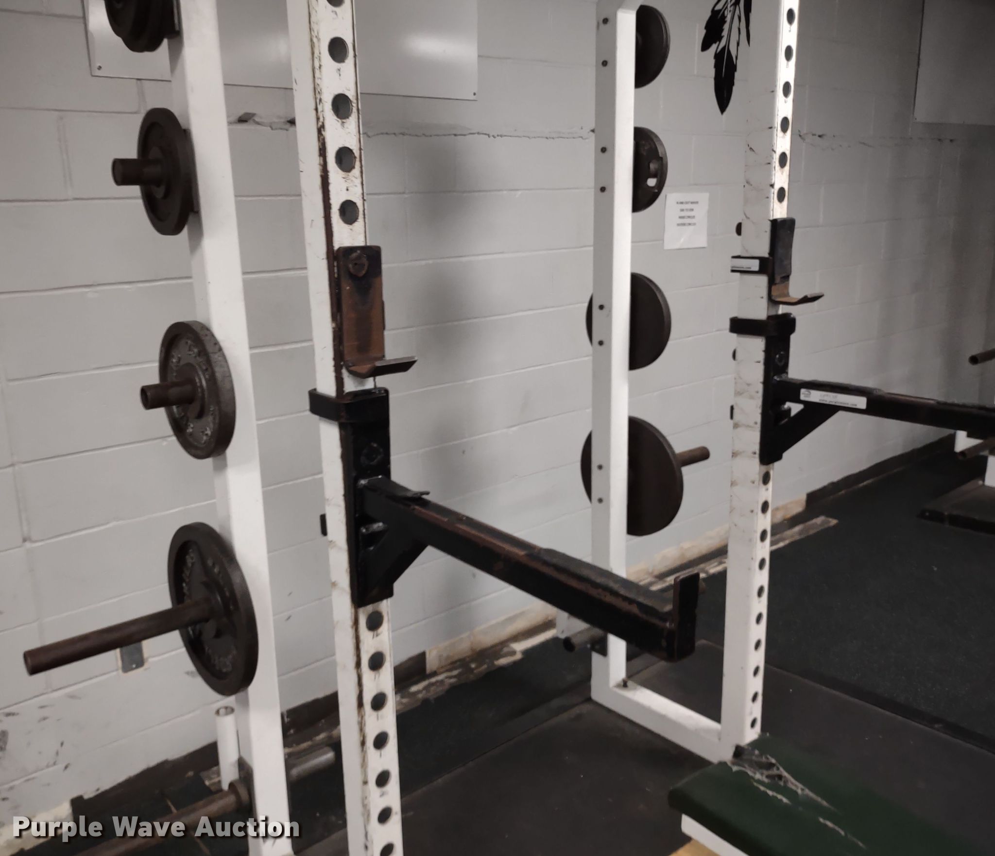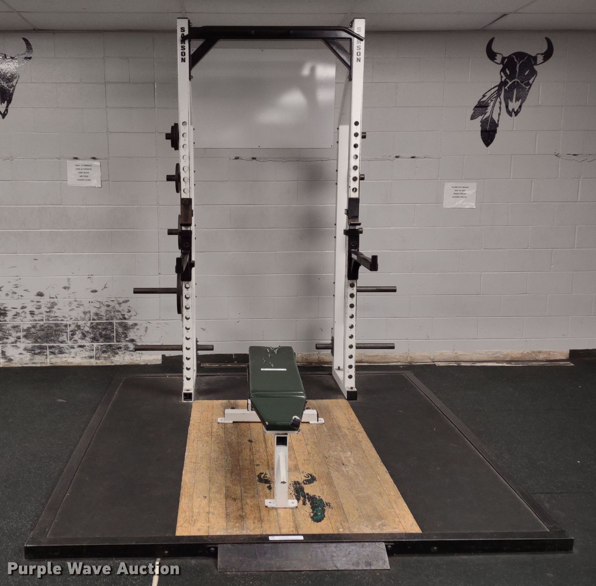 Purple Wave is selling a used Sporting Goods in Kansas. This item is a Samson power rack with the following: 30" L x 83" W x 105" H, Platform: 8' x 8' 6", Bench, Bar Catch Attachment, Spot Bar Attachment, Weights, (2) 35lbs, (2) 25lbs, (2) 10lbs, (4) 5lbs, (4) 2.5lbs