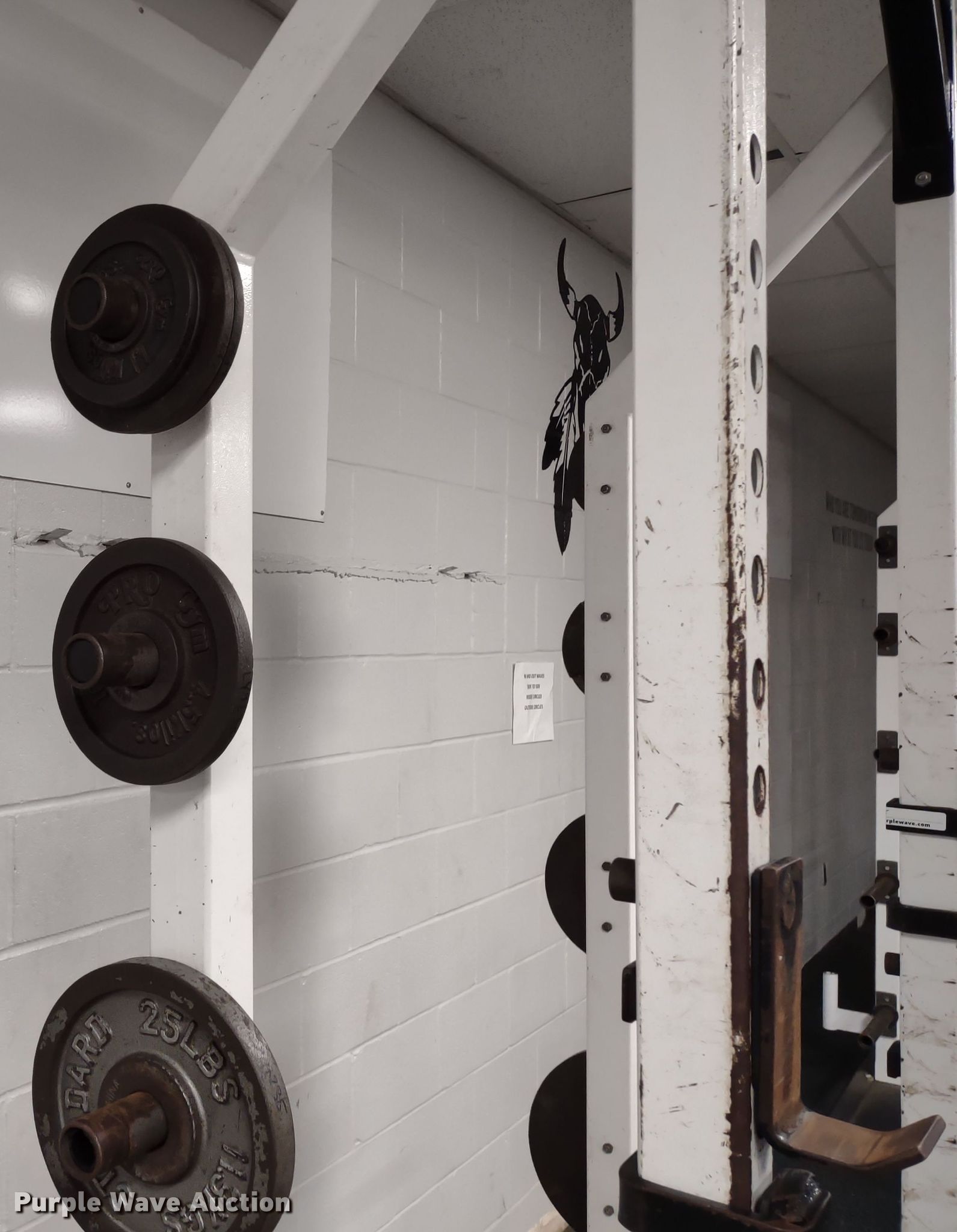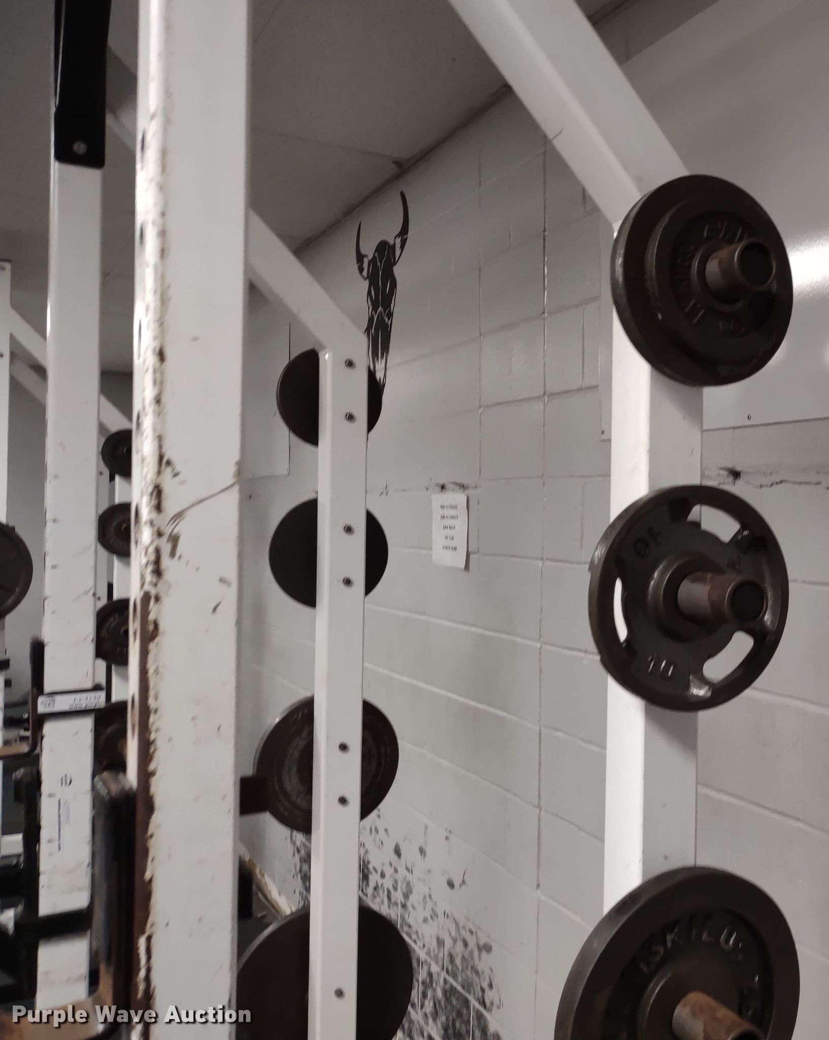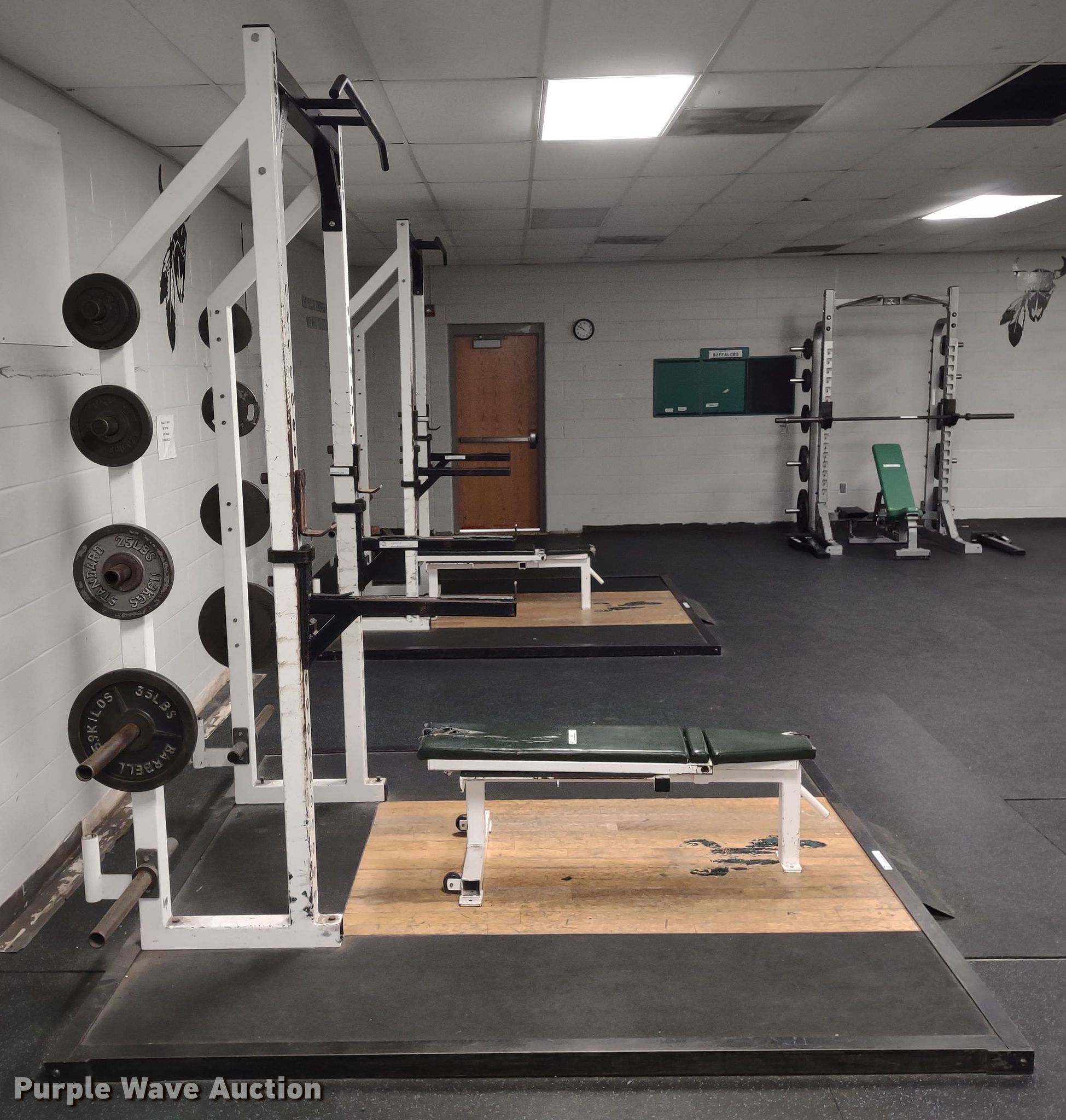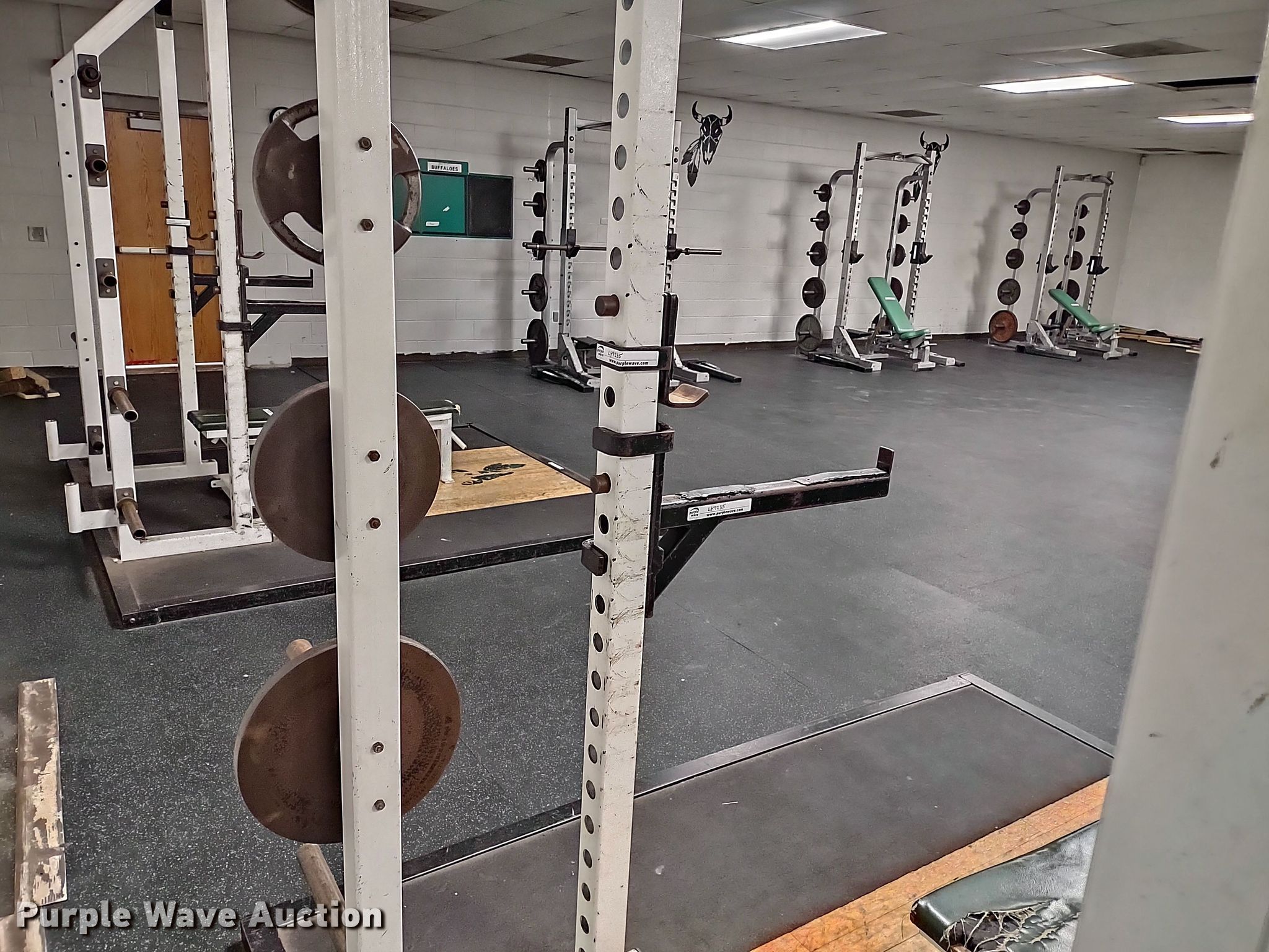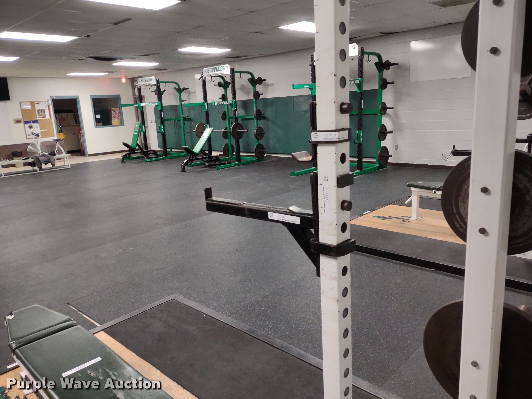 Purple Wave is selling a used Sporting Goods in Kansas. This item is a Samson power rack with the following: 30" L x 83" W x 105" H, Platform: 8' x 8' 6", Bench, Bar Catch Attachment, Spot Bar Attachment, Weights, (2) 35lbs, (2) 25lbs, (2) 10lbs, (4) 5lbs, (4) 2.5lbs