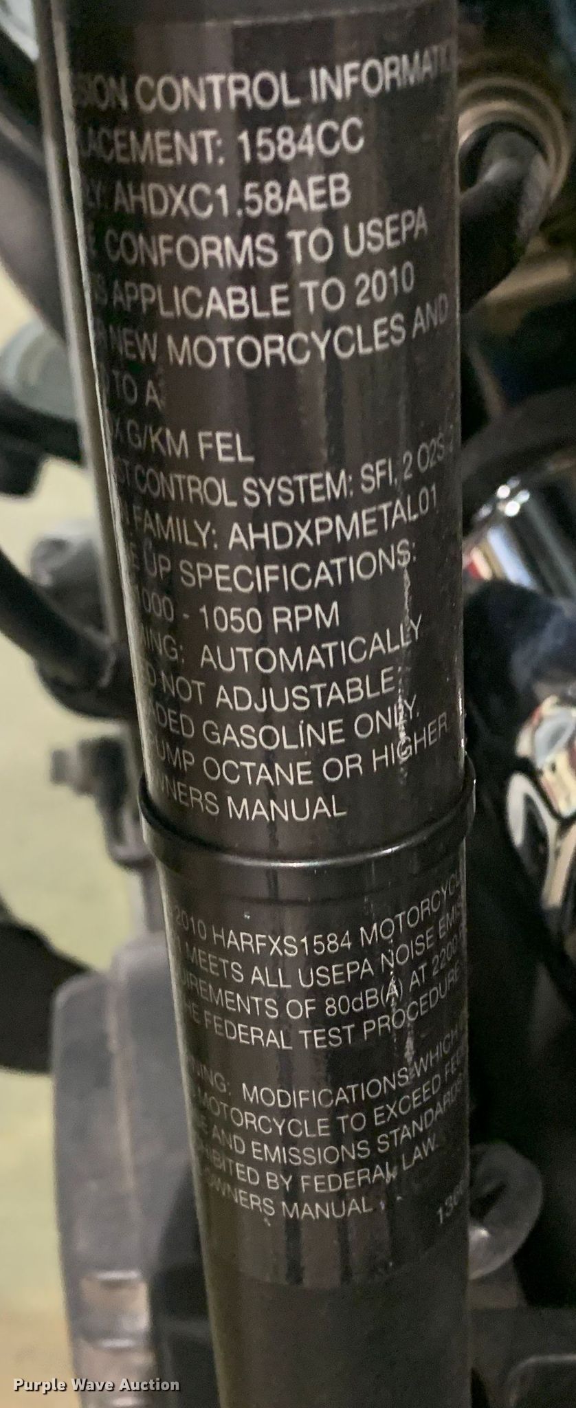 2010 Harley Davidson FLSTFB motorcycle. Miles: 10,825 on odometer, VIN: 1HD1JN516AB044301. Engine Displacement: 1584 cc, Cylinders: 2, Fuel type: Gas. Transmission Manual. Tires Front: 140/75R17, Rear: 200/55R17. Missouri title. Board of Police Commissioners. Kansas City, MO 64152
