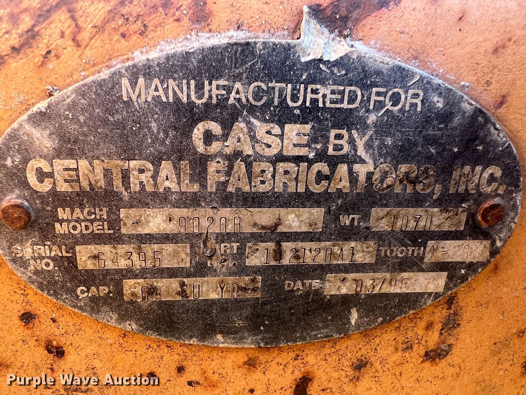 1998 Case 9020B excavator. Hours: 1,321 on meter, Serial: DAC0202292. Engine Case IH 4TA-390, Displacement: 3.9L, Cylinders: 4, Fuel type: Diesel, HP: 106, kW: 79. Transmission Hydrostatic, Three speed travel. Operators station Enclosed cab, AC, Heat. Features Auxiliary hydraulics, Boom Standard, Stick Stick length: 10', Bucket Central Fabricators, Inc. 9020B, Capacity: 0.64 cu.yd., Width: 30", Teeth: 4. Tracks Width: 23.5", Steel, Grouser pads: Triple. Notes Non-operational fuel gauge. Public Water Supply District. 14530 N Route U. Hallsville, MO 65255