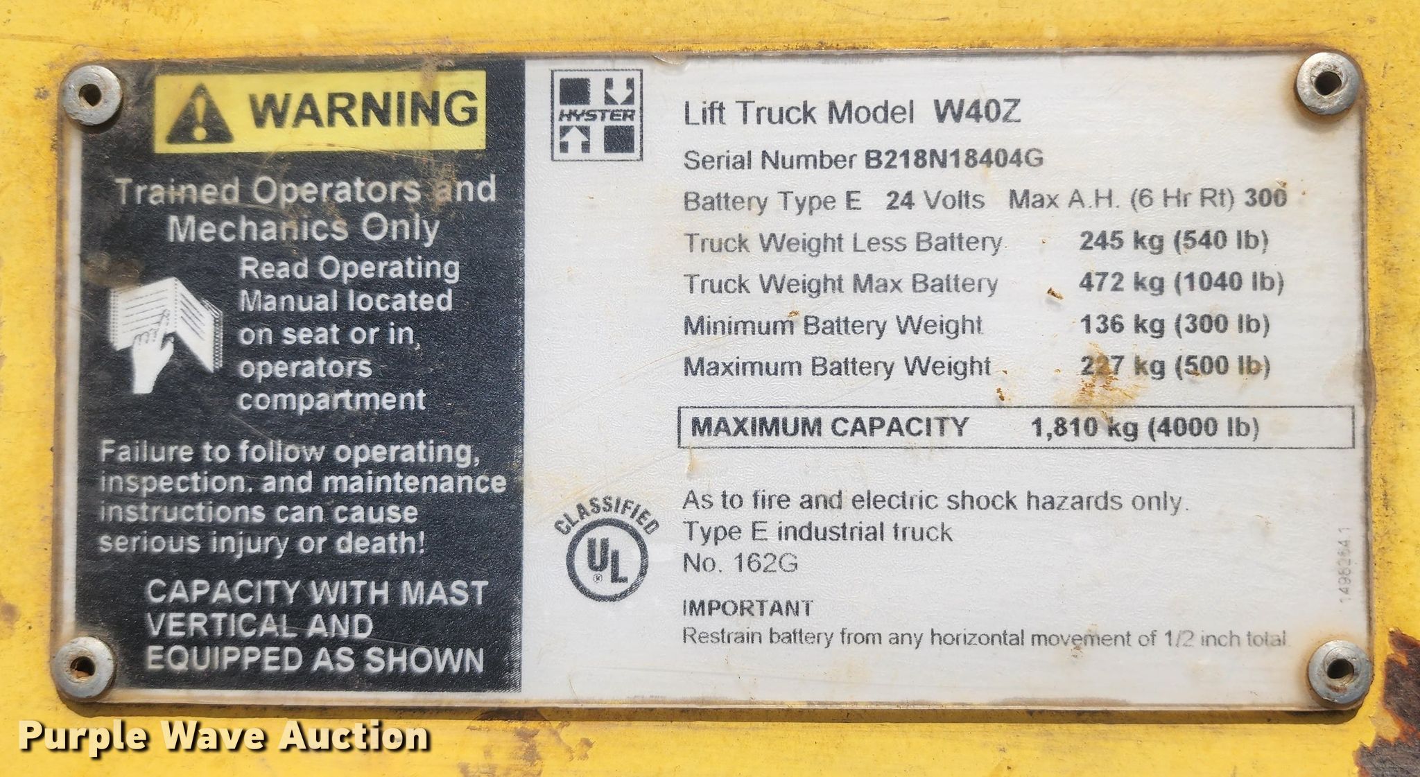 Hyster W40Z pallet jack. Serial: B218N18404G. Electric Motor Volts: 24. Features Maximum lift capacity: 4,000 lbs, Fork length: 48". BC Hardscapes. 134 NE US-69. Kansas City, MO 64119