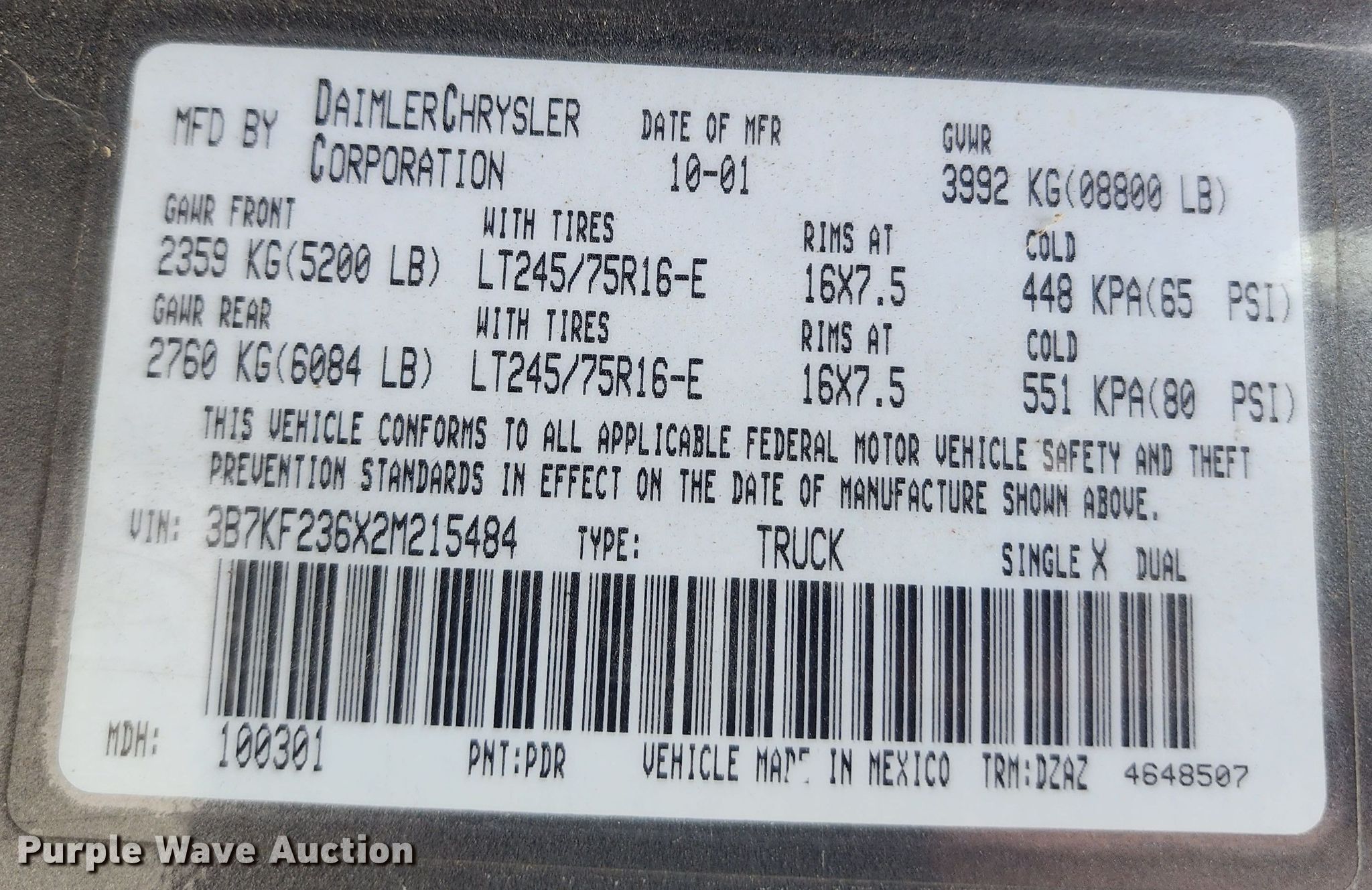 Purple Wave is selling a used 3/4 or 1 Ton Pickup or Van in Missouri. This item is a 2002 Dodge Ram 2500 Quad Cab pickup truck with the following: Miles: 210,470 on odometer, VIN: 3B7KF236X2M215484