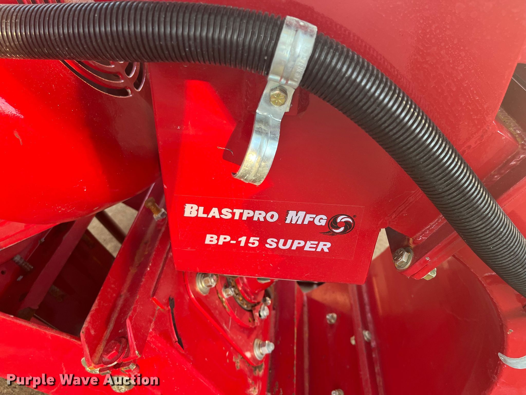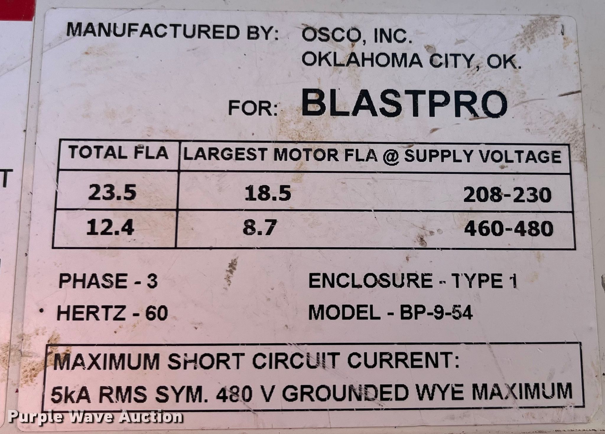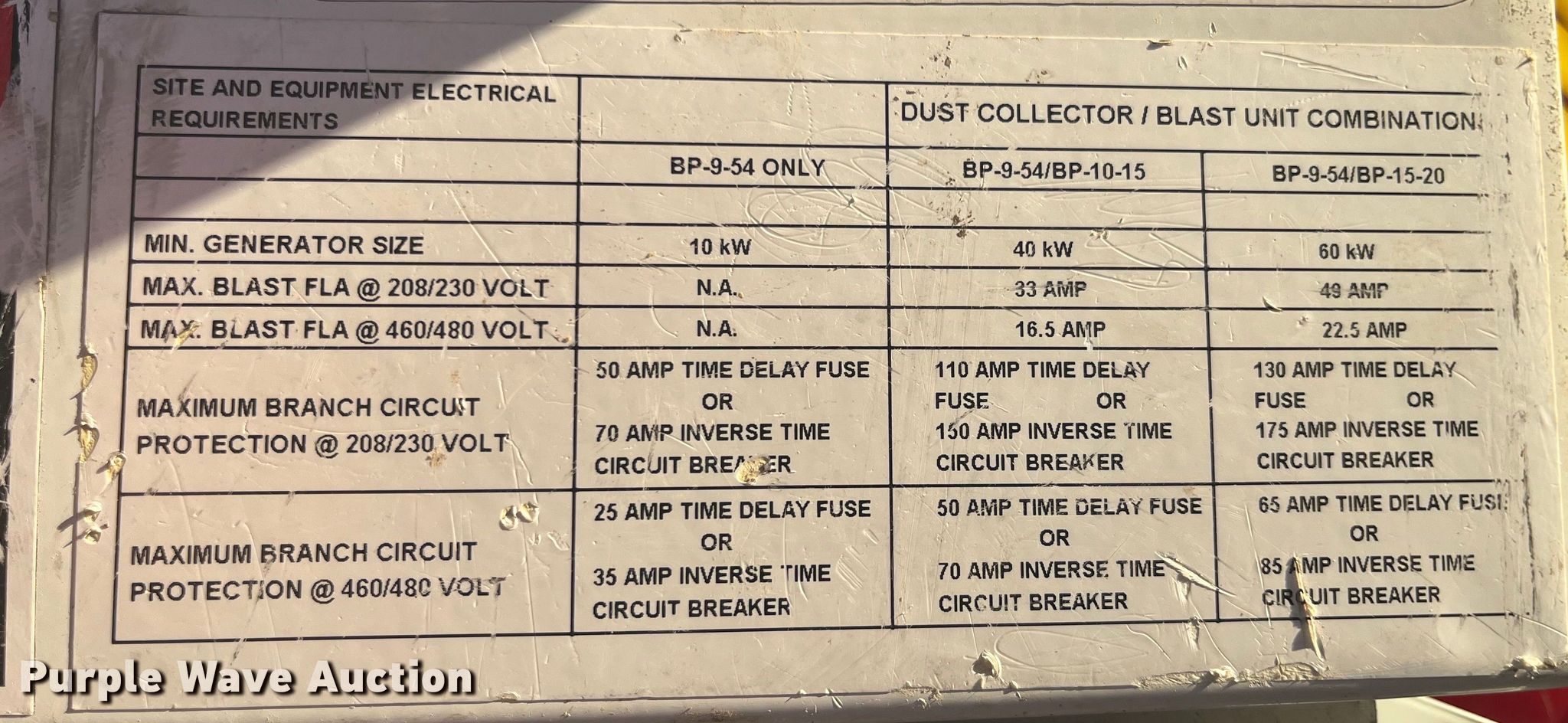 2016 Blastpro shot blaster system. BP-15 Super shot blaster. 350 hours on meter, 72" x 23" x 41", Electric motor 460V, Three phase, 20 HP, 15" blast width, 1,950 sq.ft. per hour production capacity, Serial: 3112. BP-9-54 dust collector Electric motor 460V, Three phase, 1,200 CFM, 50'L x 5" diameter hose, 23" water lift static pressure, Serial 4184. Wichita, KS 67204