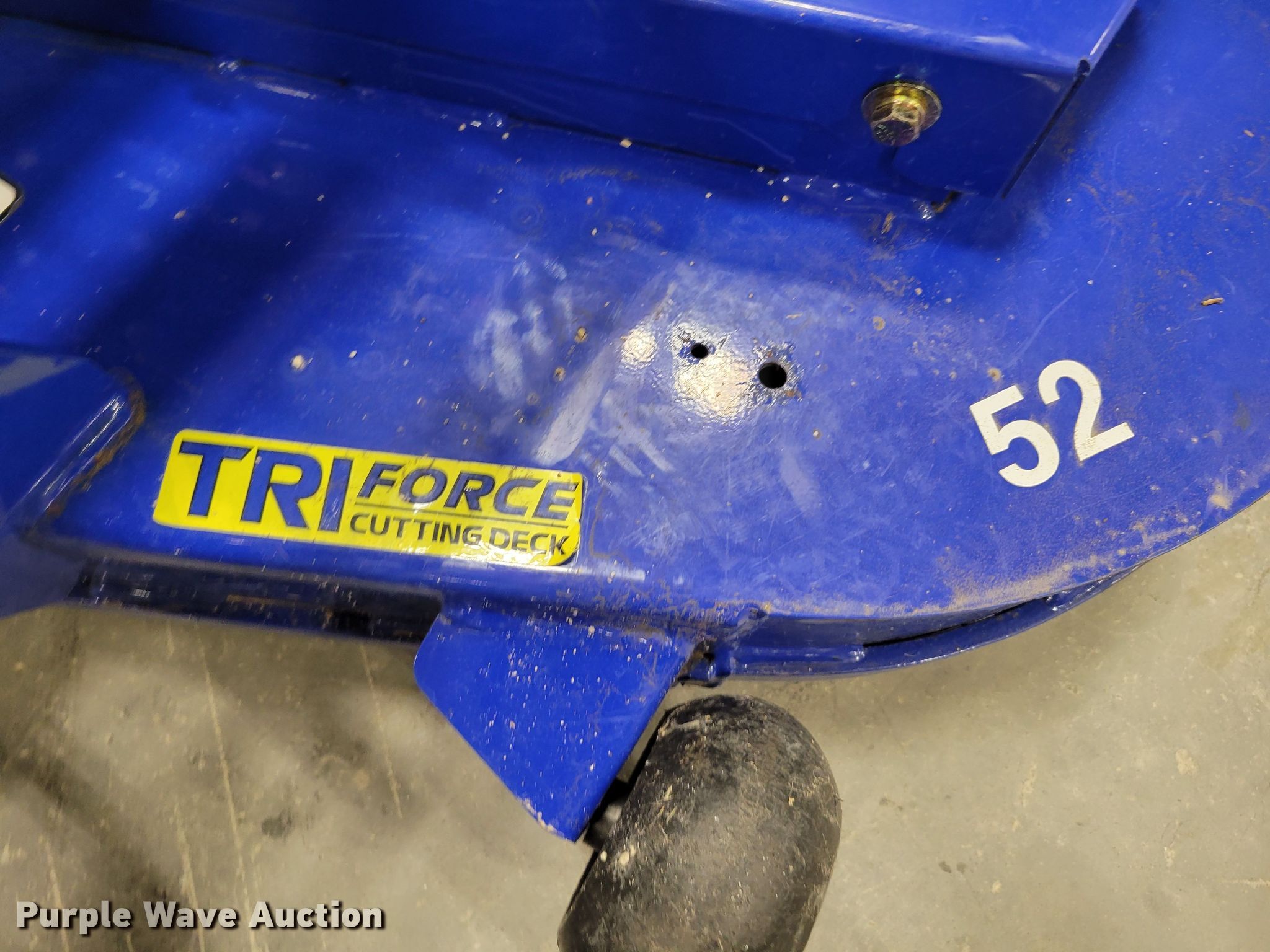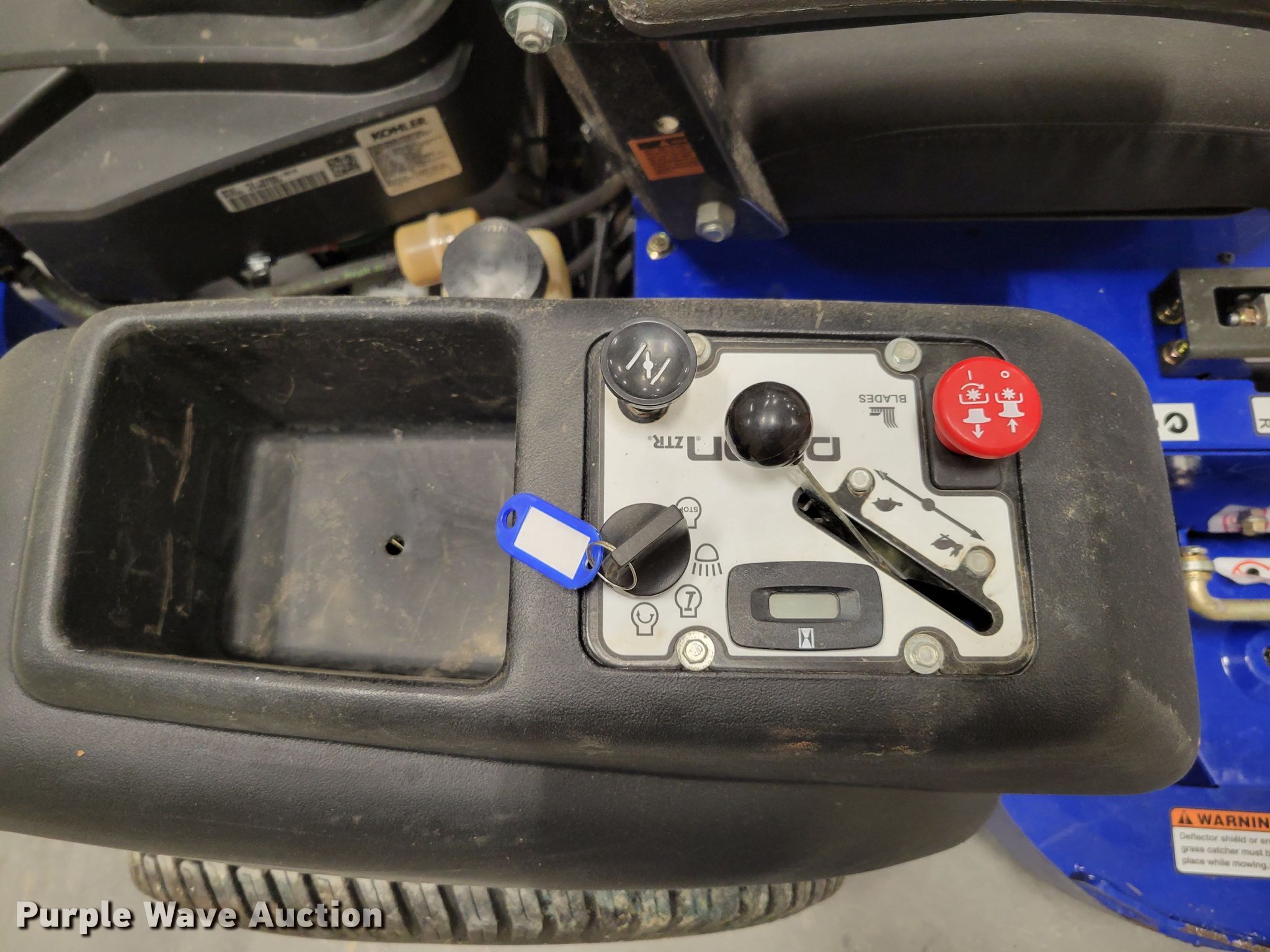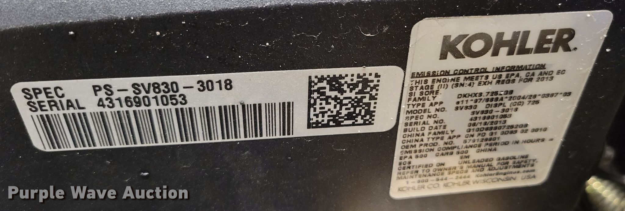 2013 Dixon Ultra 52 ZTR lawn mower. Hours: 66 on meter, Cutting width: 52", Serial: 111513B001060. Engine Kohler Courage Pro SV830, Displacement: 725 cc, Cylinders: 2, Fuel type: Gas, HP: 25. Transmission Hydrostatic. Features Mower deck Width: 52", TRI Force. Tires Front: 13x6.50-6, Rear: 23x9.50-12. Neuvirth Construction. 3400 Old Mormon Bridge Rd. Crescent, IA 51526