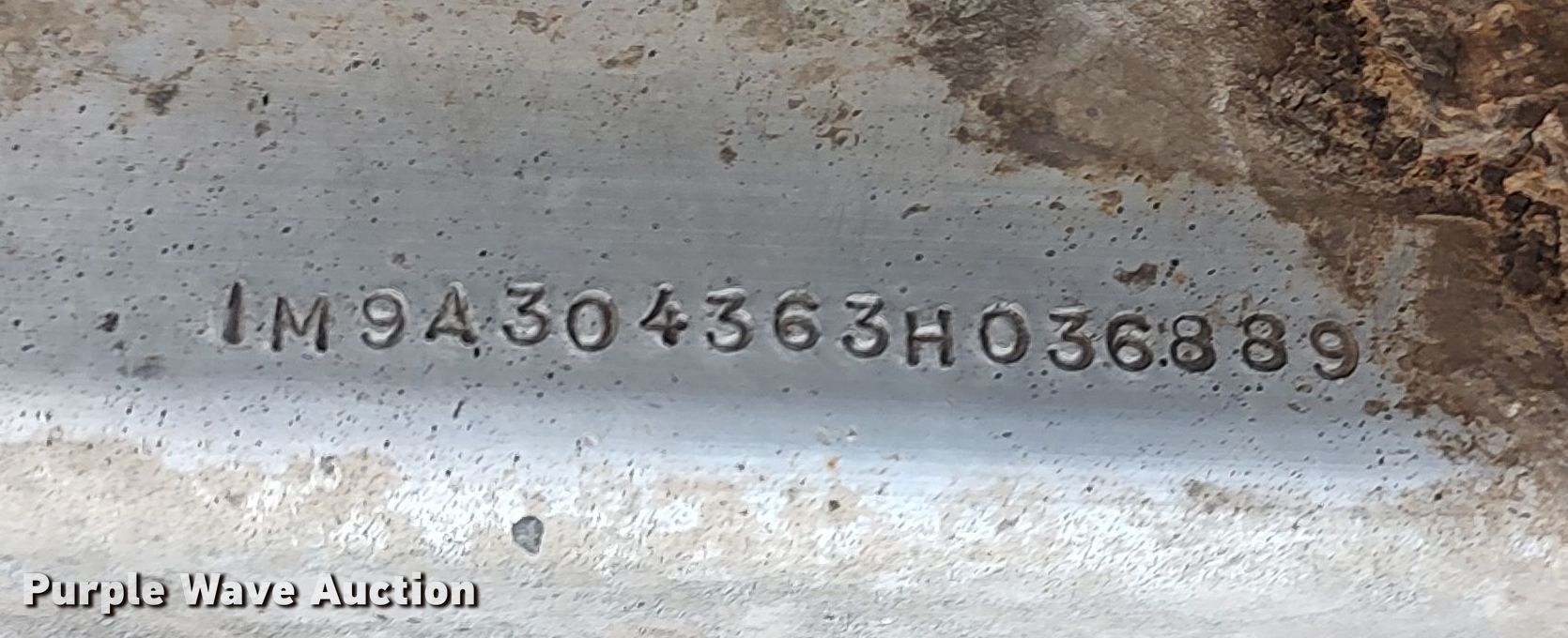 2003 Mate end dump trailer. VIN: 1M9A304363H036889, Claim #: 1-811067. Dimensions Overall: 30' L x 96" W, Side height: 60". Features Body type: Aluminum, Ram: Single, End gate: Air operated, Roll tarp. Chassis Landing gear: Dual, Suspension: Spring, Brakes: Air, Axles: Tandem. Tires Size: 11R22.5. Notes End gate damage. Insurance salvage unit. Oklahoma title. Title distribution may be delayed up to 14 days from verification of funds. Oklahoma Farm Bureau Insurance. Seminole, OK 74868