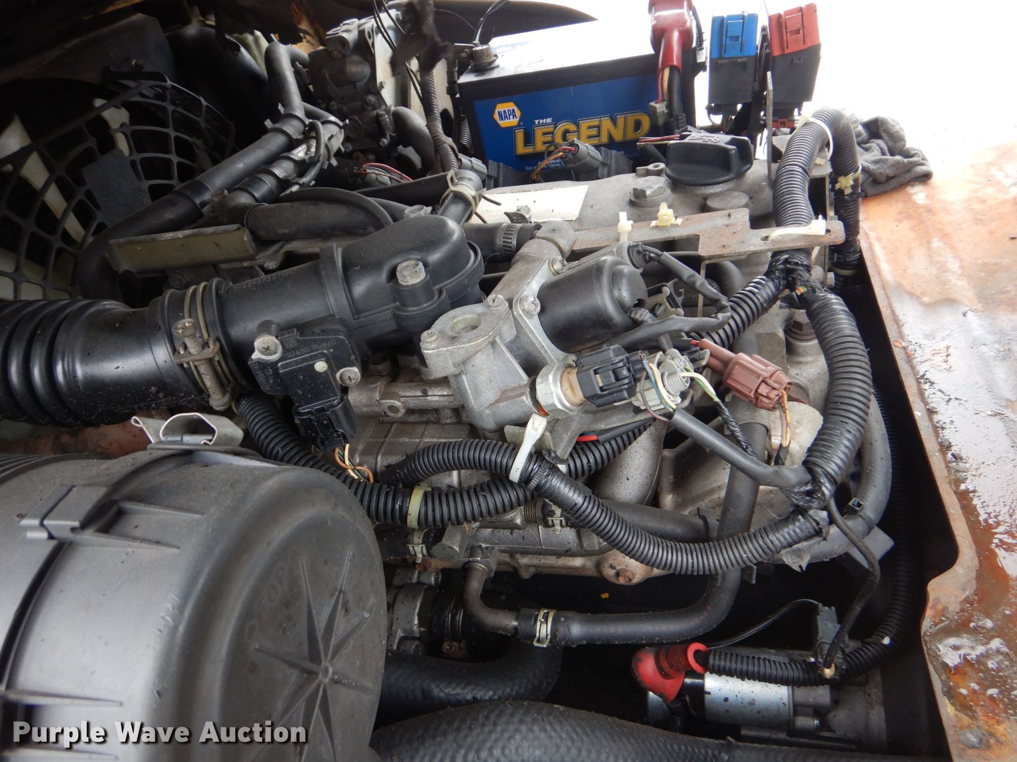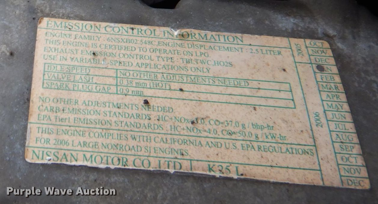 Caterpillar C5000 forklift. Hours: 27,101 on meter, Serial: AT9003527. Engine Nissan 6NSXB02, Displacement: 2.5L, Cylinders: 4, Fuel type: LPG LP bottle: Not included. Transmission Powershift. Operators station Canopy. Features Maximum lift capacity: 4,600 lbs, Maximum lift height: 199", Mast stages: 3, Side shift, Mast tilt, Fork length: 48". Tires Front: 21x7x15, Rear: 16x5x10.5, Solid. Notes Transmission leak. Rough Country Equipment,LLC. 609 North Main Street,. Edmonton, KY 42129