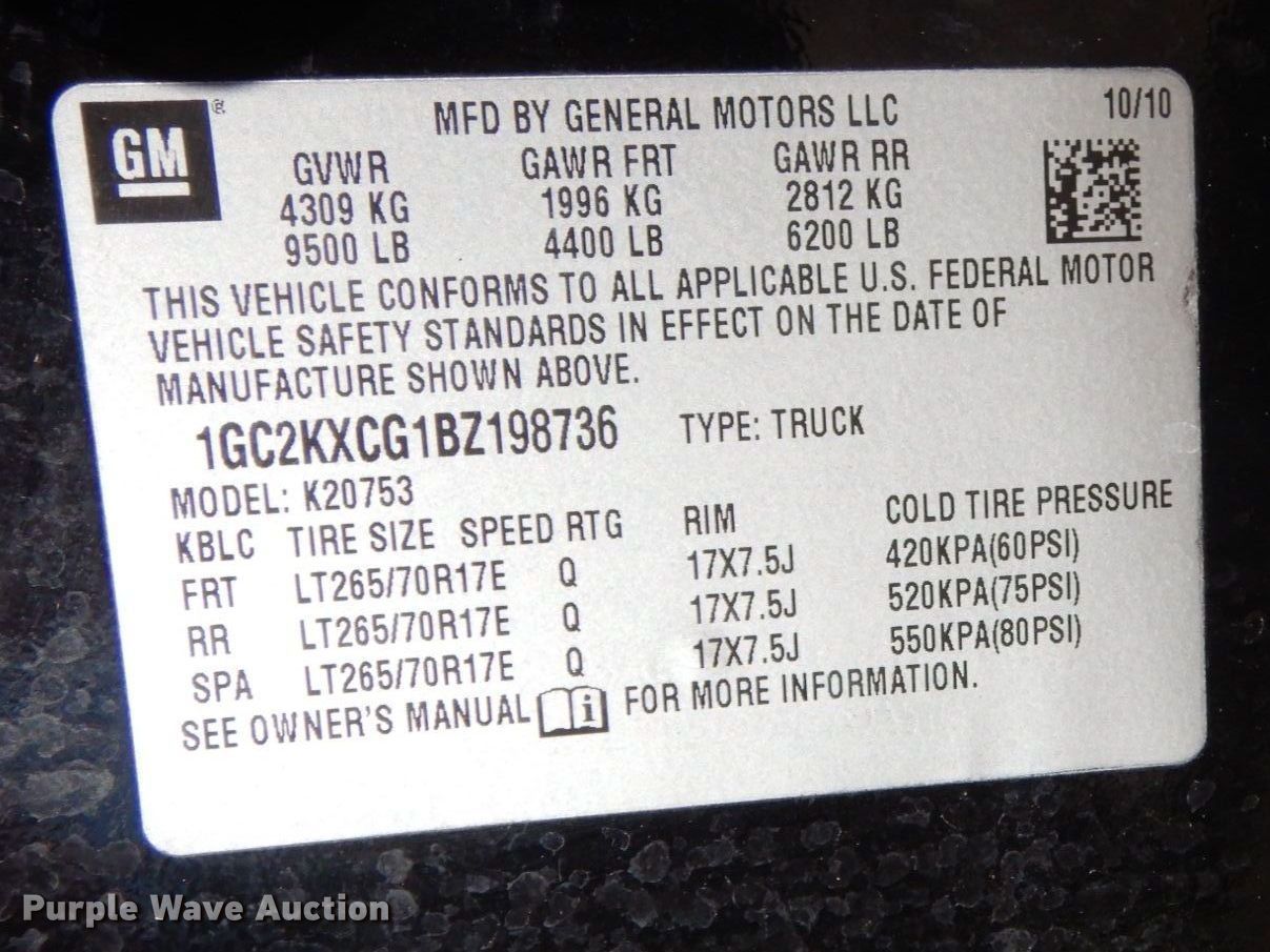 2011 Chevrolet Silverado 2500HD LT Ext. Cab pickup truck. Miles: 172,096 on odometer, VIN: 1GC2KXCG1BZ198736. Engine Displacement: 6.0L V8 OHV, Cylinders: 8, Fuel type: Gas. Transmission Automatic, Four wheel drive. Interior AC, Heat, Power windows, Power locks, Cruise control. Tires Size: 265/70R17. Minnesota title. Title distribution may be delayed up to 14 days from verification of funds. Maple Crest Landscape. 2425 Hwy 55. Medina, MN 55340