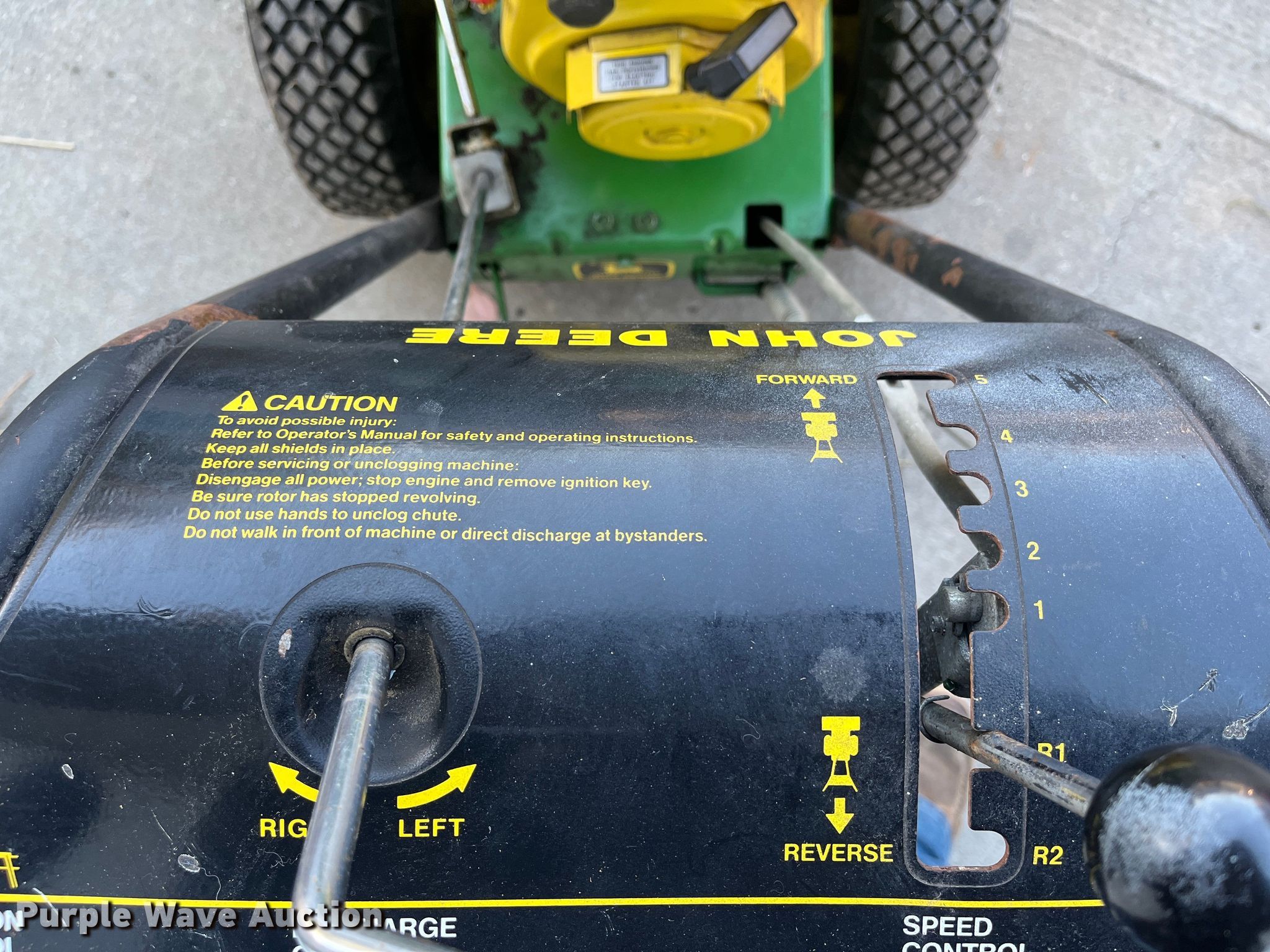 Purple Wave is selling a used Lawn and Garden in Missouri. This item is a John Deere 524 snow blower with the following: Serial: TY0524A002916, 24" W, Single cylinder gas engine, Pull start