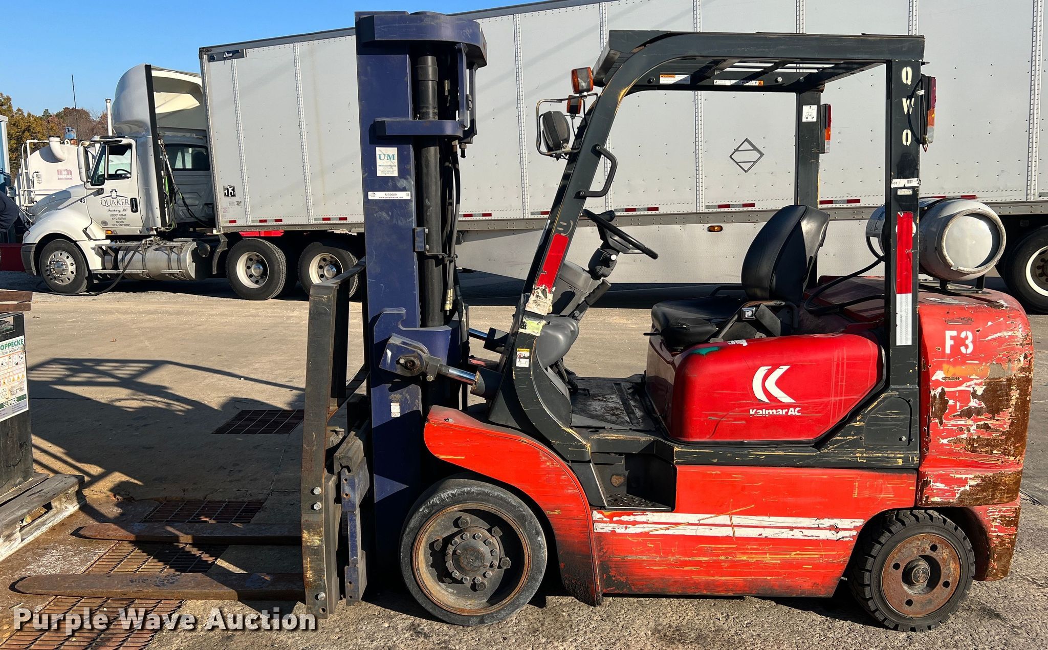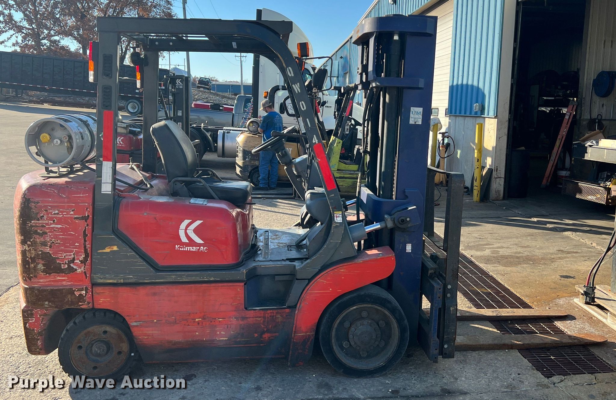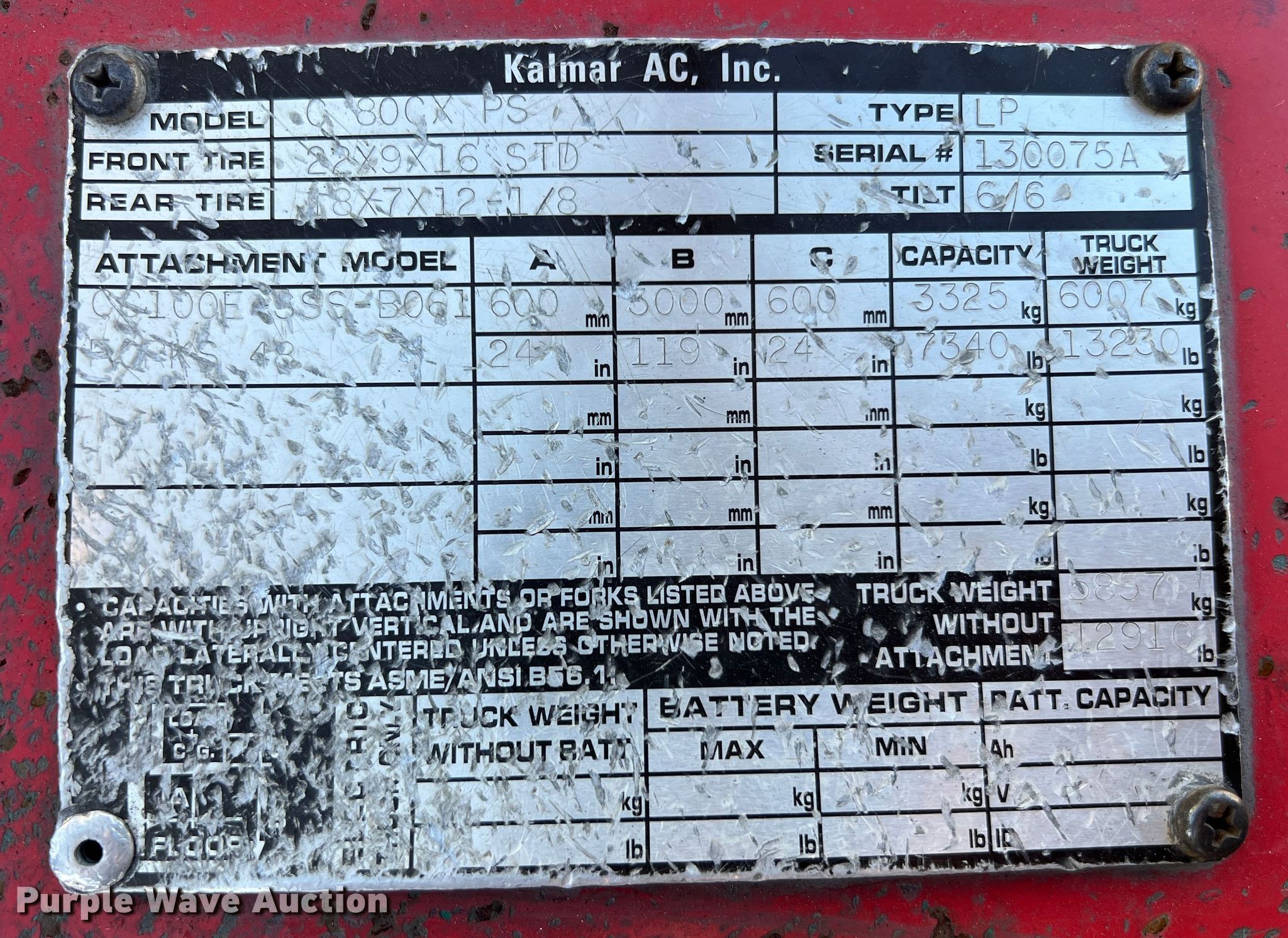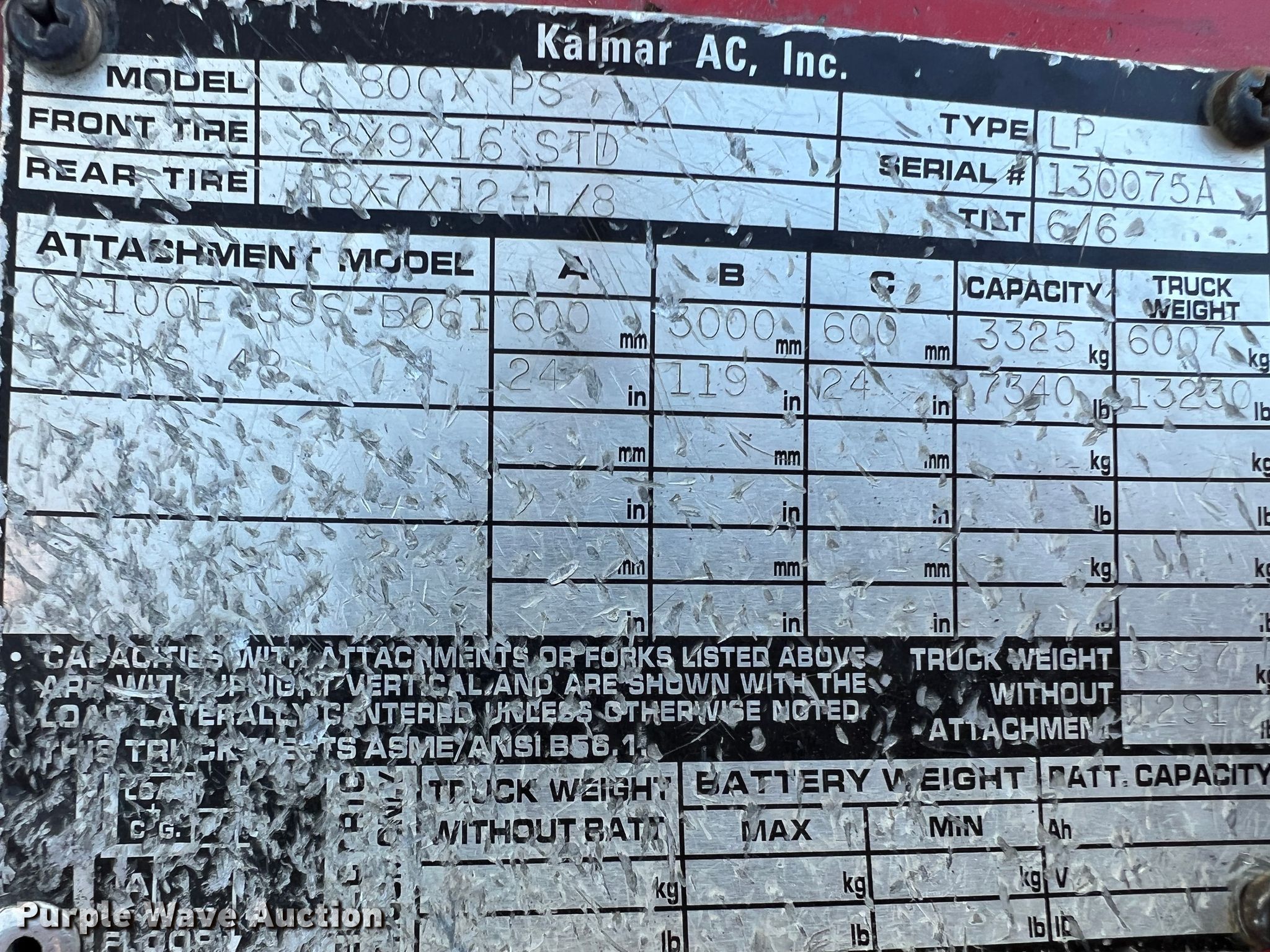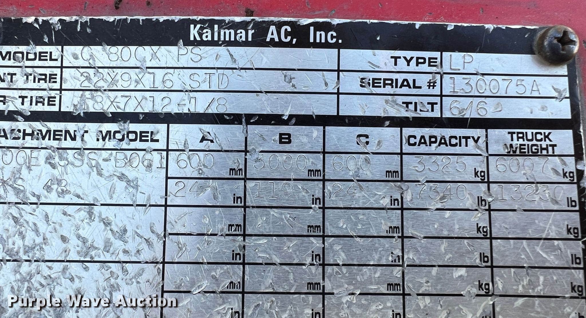 Kalmar AC C80CXPS forklift. Hours: 13,080 on meter, Serial: 130075A, Unit #: QW014. Engine Nissan, Cylinders: 6, Fuel type: LPG LP bottle: Not included. Transmission Powershift. Features Maximum lift capacity: 7,340 lbs, Maximum lift height: 119", Mast stages: 3, Side shift, Mast tilt, Fork length: 47". Tires Size: 22x8x16, Solid, Non marking. Notes Non-operational transmission. Quaker Windows & Doors. 504 S Hwy 63. Freeburg, MO 65035
