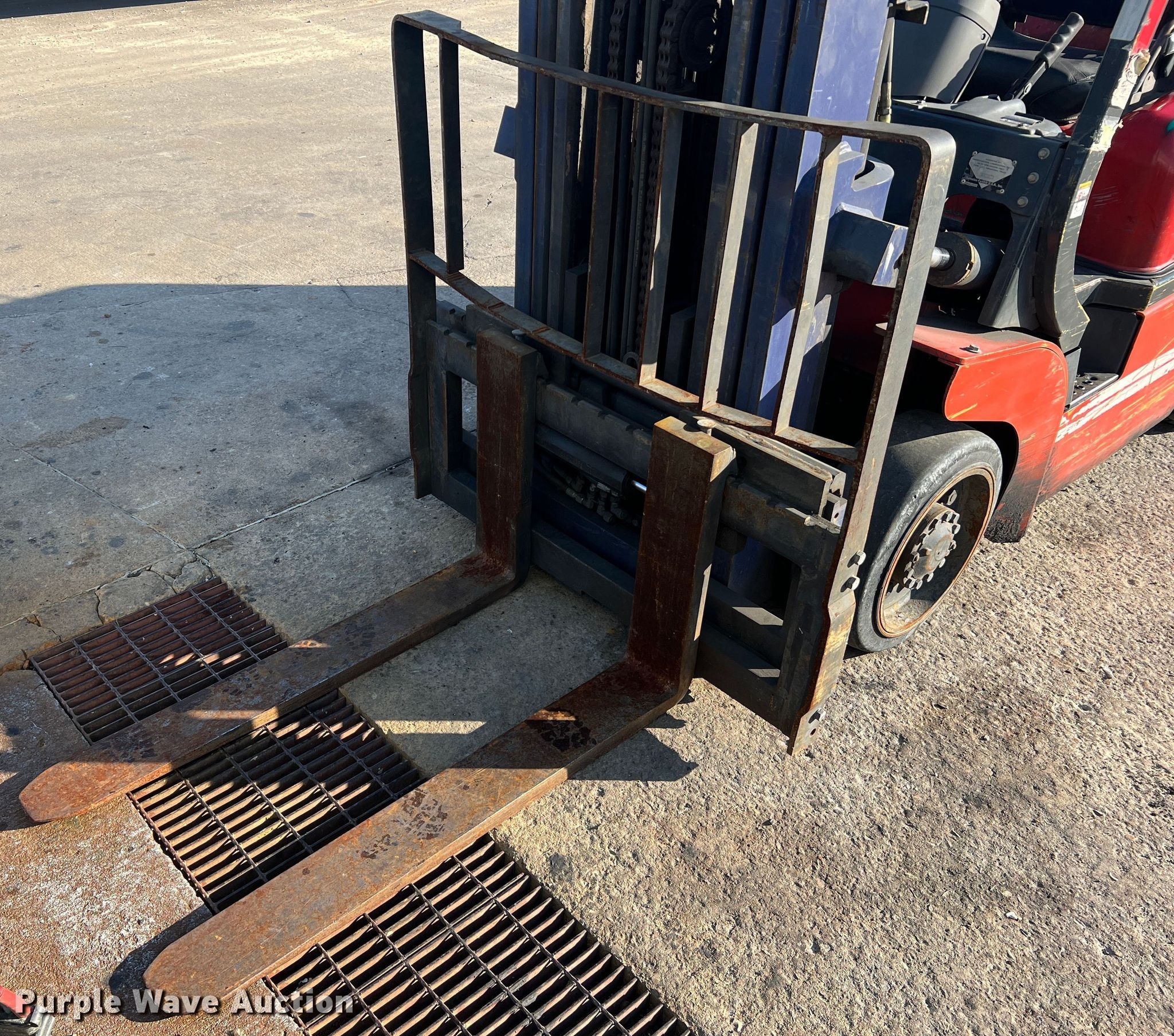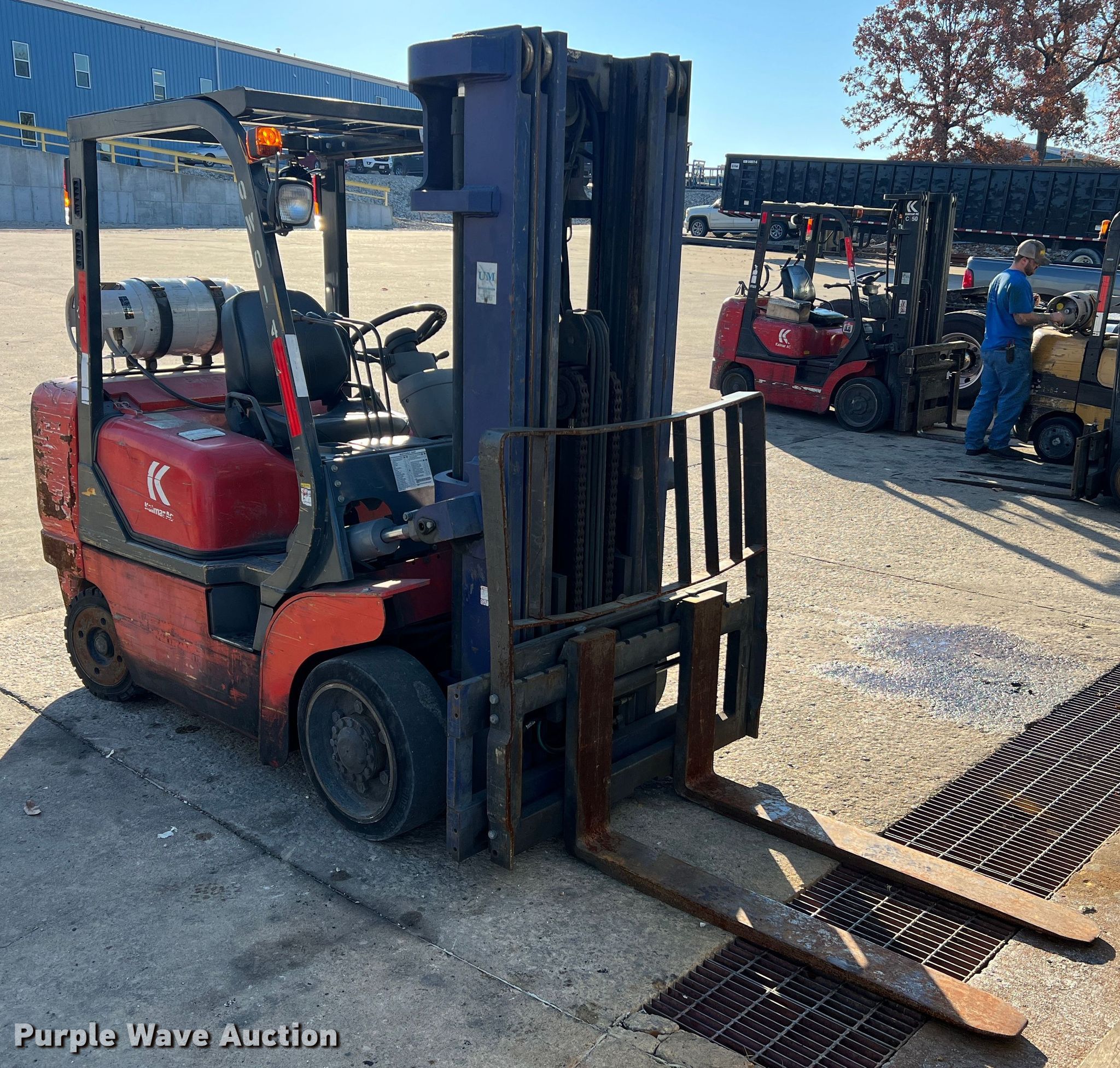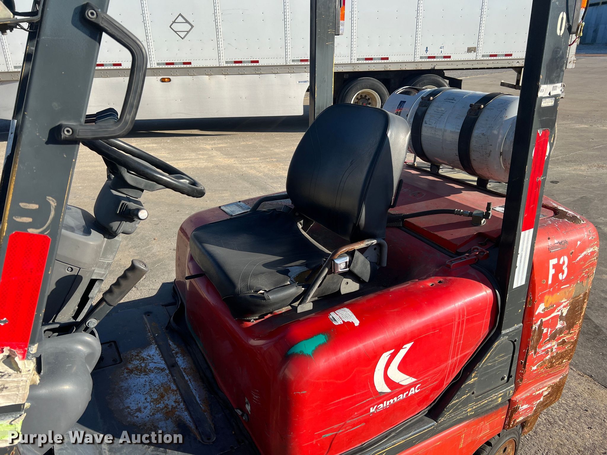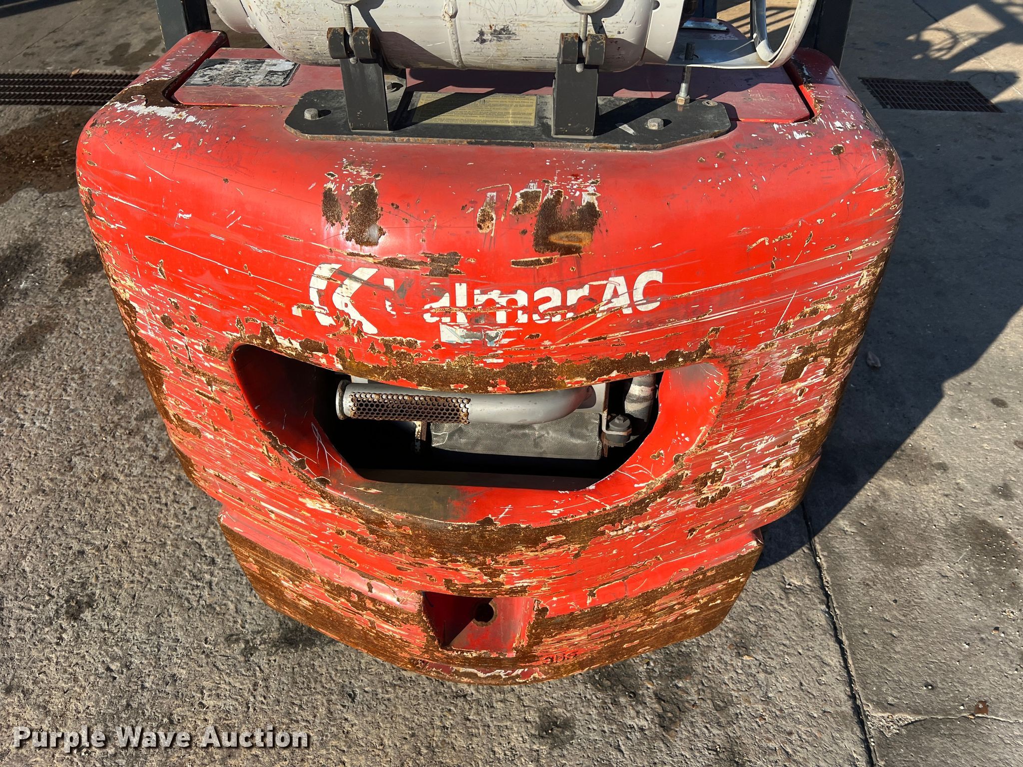 Kalmar AC C80CXPS forklift. Hours: 13,080 on meter, Serial: 130075A, Unit #: QW014. Engine Nissan, Cylinders: 6, Fuel type: LPG LP bottle: Not included. Transmission Powershift. Features Maximum lift capacity: 7,340 lbs, Maximum lift height: 119", Mast stages: 3, Side shift, Mast tilt, Fork length: 47". Tires Size: 22x8x16, Solid, Non marking. Notes Non-operational transmission. Quaker Windows & Doors. 504 S Hwy 63. Freeburg, MO 65035