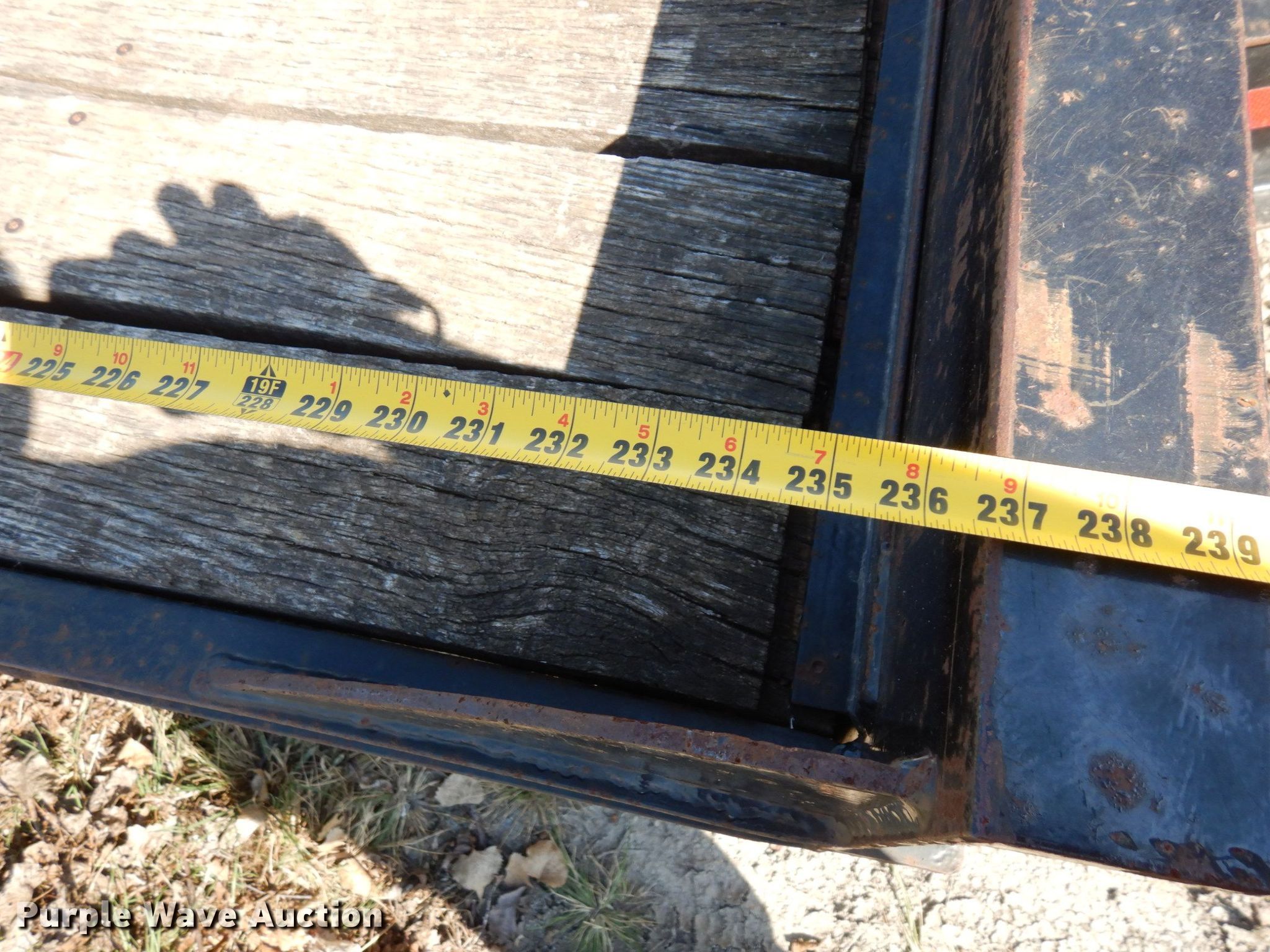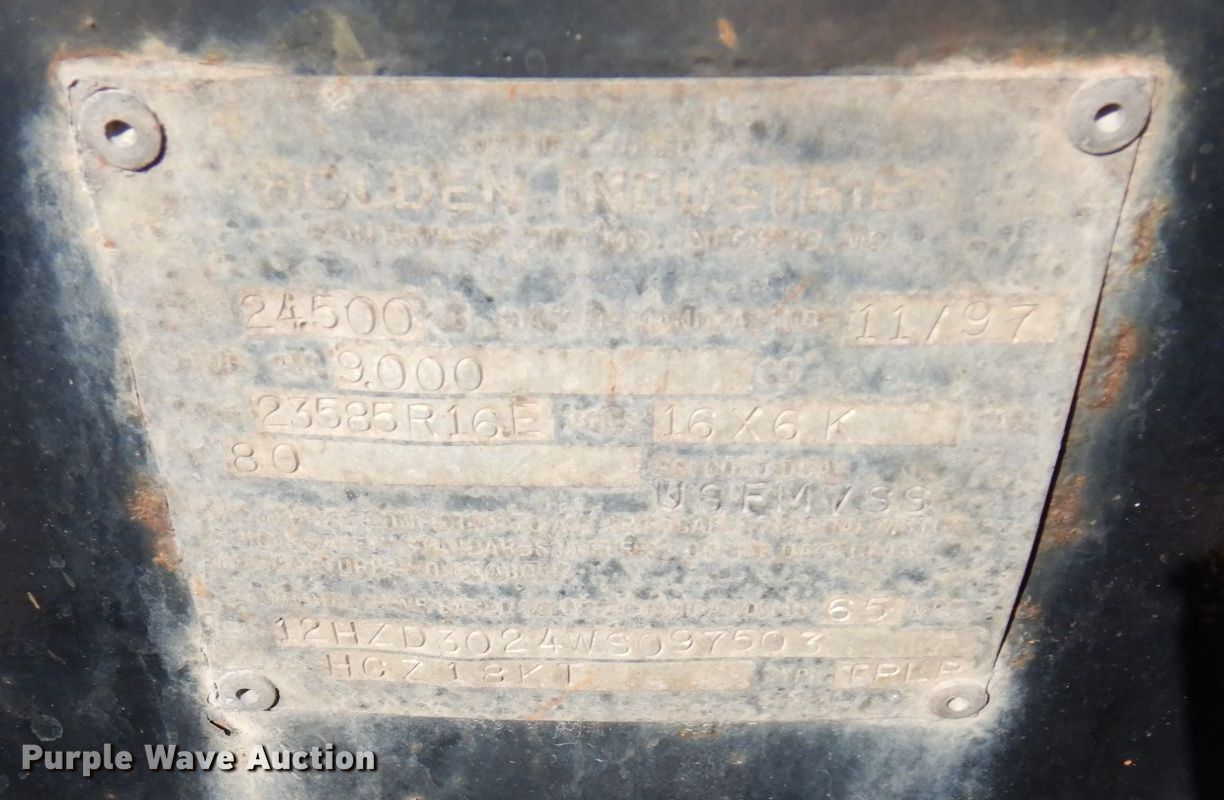 1998 Holden equipment trailer. Dimensions. Overall: 30' 6" L x 102" W, Deck: 19' 8" L, Deck height: 3', Tail length: 5' 3", Ramps: Manual Length: 5'. Features Deck type: Wood. Chassis Hitch: Pintle, Landing gear: Single, Suspension: Spring, Brakes: Electric, Axles: Tandem, GVWR: 24,500 lbs. Tires Steel wheels, Size: 235/85R16. Minnesota title. Title distribution may be delayed up to 14 days from verification of funds. Maple Crest Landscape. 2425 Hwy 55. Medina, MN 55340