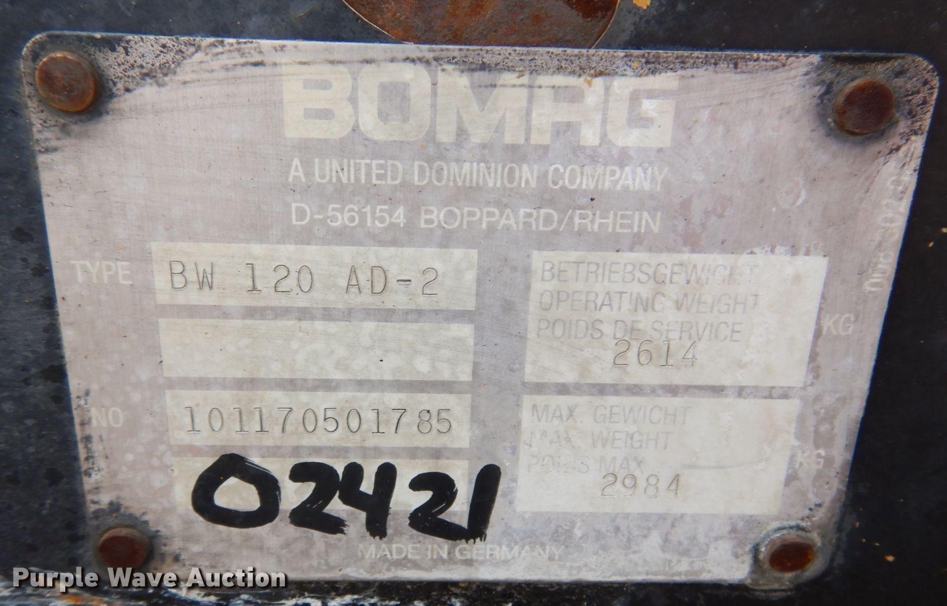 Purple Wave is selling a used Double Drum Roller Compactor in Illinois. This item is a 1995 Bomag BW120AD-2 double drum roller with the following: Hours: 1,548 on meter, Serial: 101170501785
