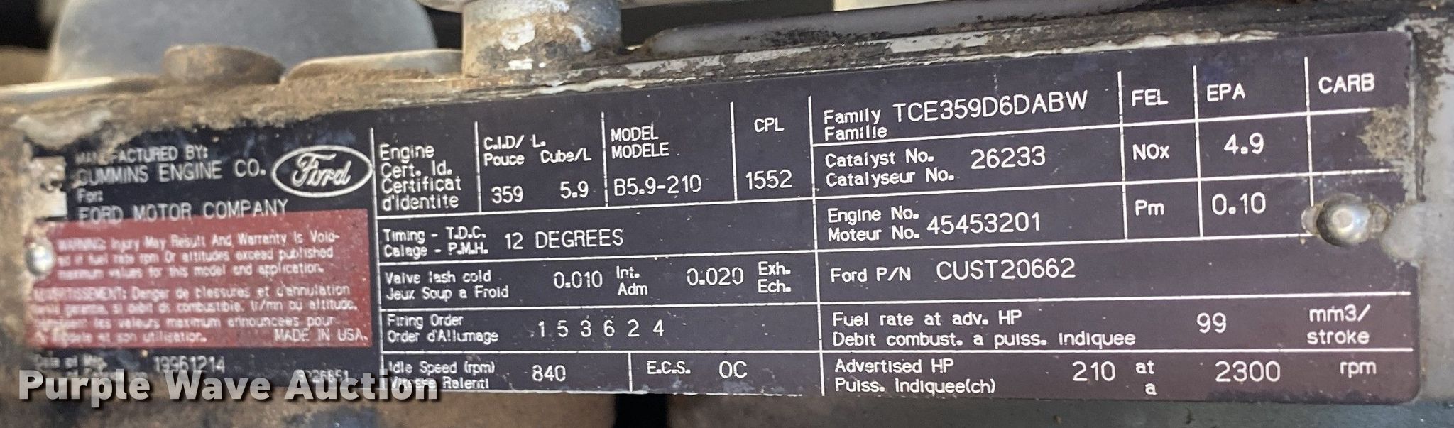 1997 Ford F800 crane truck. Miles: 90,120 on odometer, VIN: 1FDXF80C0VVA39358. Engine Cummins B Series, Serial: 45453201, Displacement: 5.9L, Cylinders: 6, Fuel type: Diesel, HP: 210. Transmission Manual, Speed: 6. Chassis Axles: Single, Suspension: Spring, Brakes: Air, PTO, GVWR: 33,000 lbs FAWR: 12,000 lbs, RAWR: 21,000 lbs, Wheelbase: 238". Interior AC, Heat. Features Flatbed Reading R-20-N, Serial: 450498, 20' 6" L x 96" W, Crane USTC 1500 JBT Serial: 400003853, Boom Telescopic, Boom length: 71', Sections: 3, Maximum lift capacity: 30,000 lbs, Boom controls Ground, Crane block Sheaves: 2.. Tires Size: 11R22.5. Oklahoma title. 15600 N 145th E. AVE. Collinsville, OK 74021