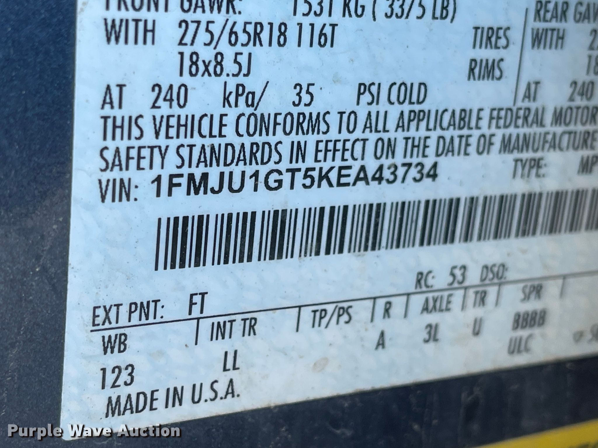 - VIN: 1FMJU1GT5KEA43734