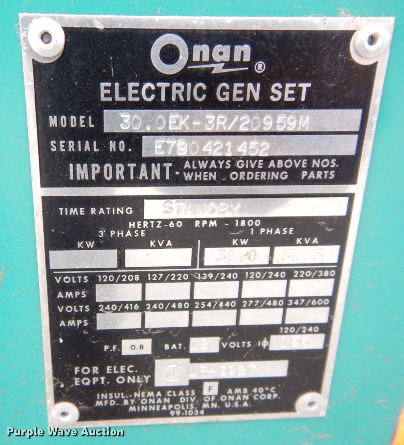 Purple Wave is selling a used Generator Set in Kansas. This item is a Onan 30.0EK-3R/20959M generator with the following: Hours: 873 on meter, Serial: E790421452