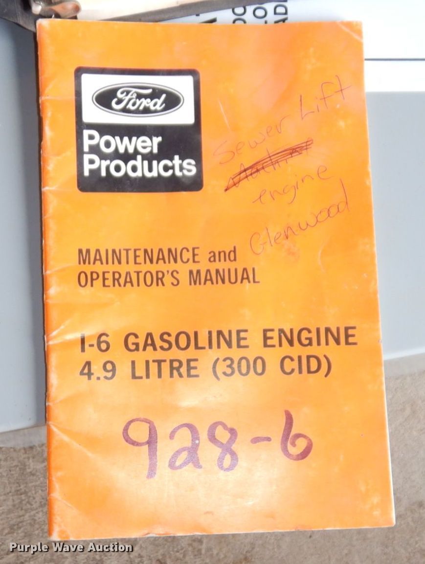 Onan 30.0EK-3R/20959M generator. Hours: 873 on meter, Serial: E790421452. Engine Ford, Displacement: 4.9L, Cylinders: 6, Fuel type: Gas, LPG. Features Generator kVA: 37.5, kW: 30, Phase: Single, Backup start, Electric start, Skid mounted. Notes No fuel tanks. City of Wellsville. 730 South Main Street. Wellsville, KS 66092