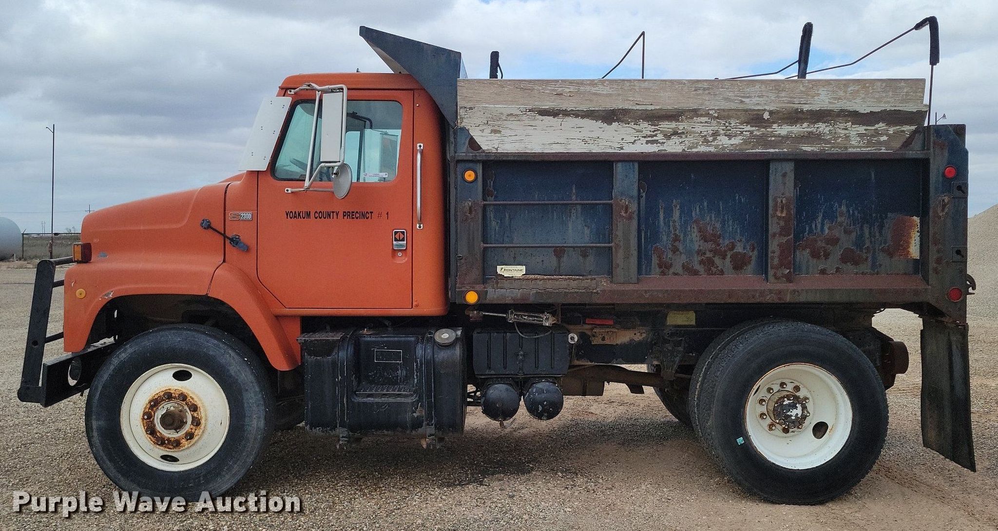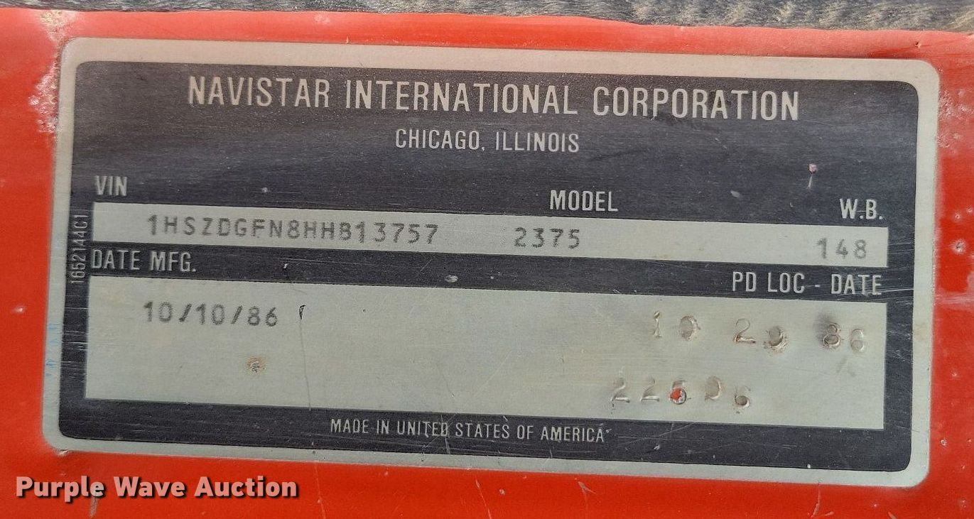 1987 International S2375 dump truck. Miles: 576,590 on odometer, VIN: 1HSZDGFN8HHB13757. Engine Cummins LTA10, Displacement: 10.0L, Cylinders: 6, Fuel type: Diesel. Transmission Manual, Plus 2. Chassis Axles: Single, Suspension: Spring, Brakes: Air, PTO, Wheelbase: 148". Interior Heat. Features Dump bed 10' L x 8' W, Side height: 35", Side board height: 17", Bed type: Steel, Ram: Single , End gate: Air operated. Tires Size: 11R24.5. Notes Windshield chipped or cracked, End gate missing. Texas title. Title distribution may be delayed up to 14 days from verification of funds. Yoakum County, TX. 2543 State Hwy 214. Denver City, TX 79323