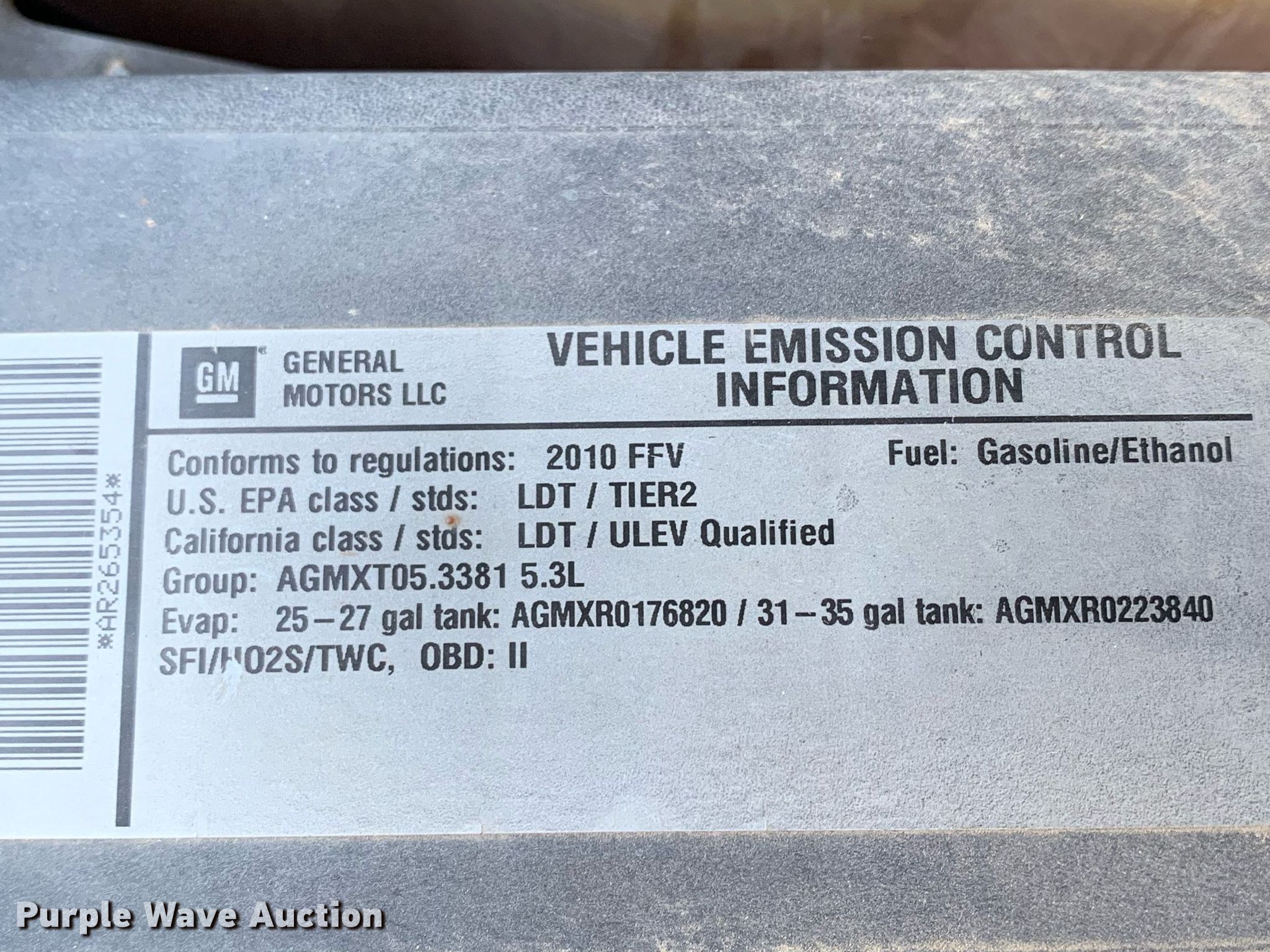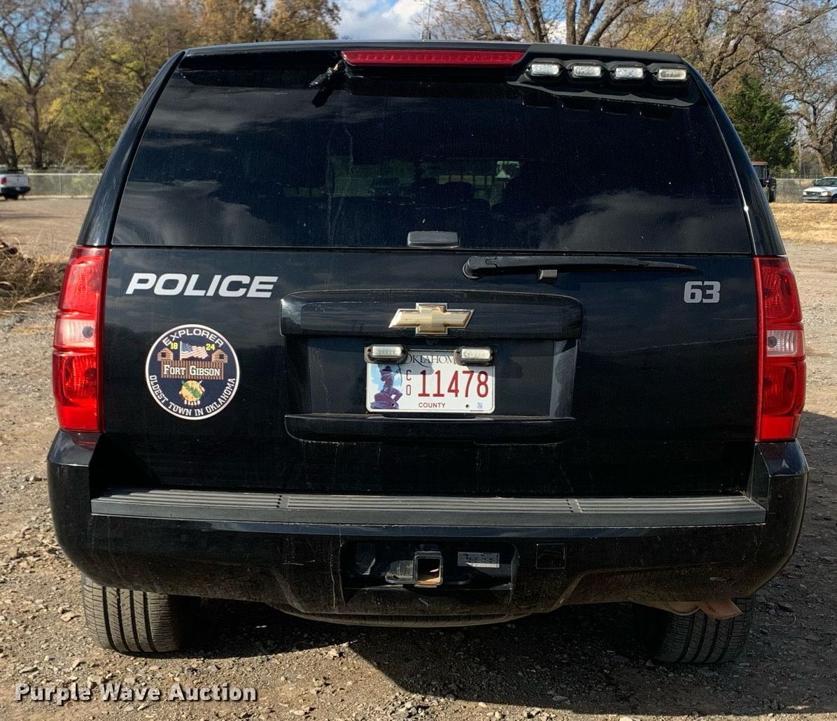 2010 Chevrolet Tahoe SUV. Miles: Unknown, VIN: 1GNUKAE00AR265354. Engine Displacement: 5.3L V8 OHV, Cylinders: 8, Fuel type: Gas. Transmission Automatic, Four wheel drive. Interior AC, Heat, Seat: Power driver, Power passenger, Power windows, Power locks, Cruise control. Tires Size: P265/60R17. Notes Dash warning indicator: TPMS. Oklahoma title. Town of Fort Gibson. 200 West Poplar Street. Fort Gibson, OK 74434