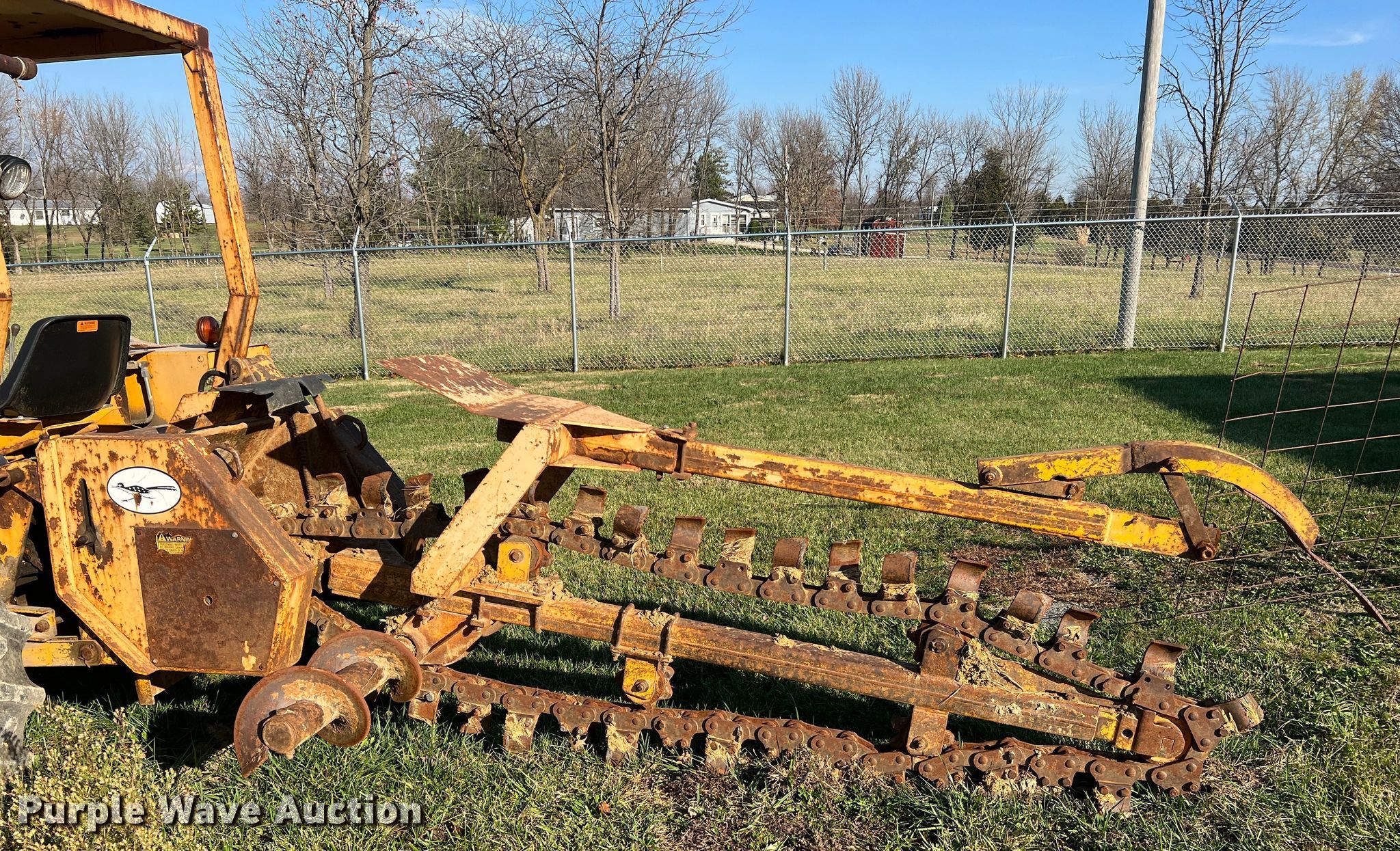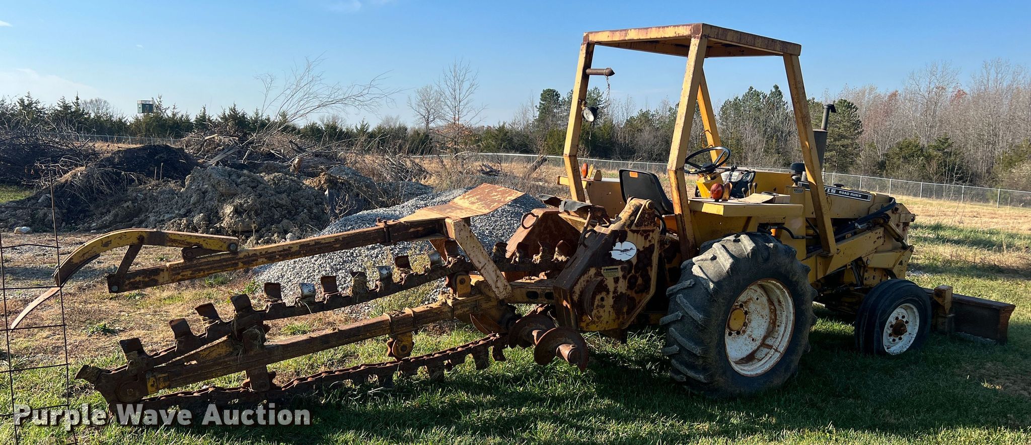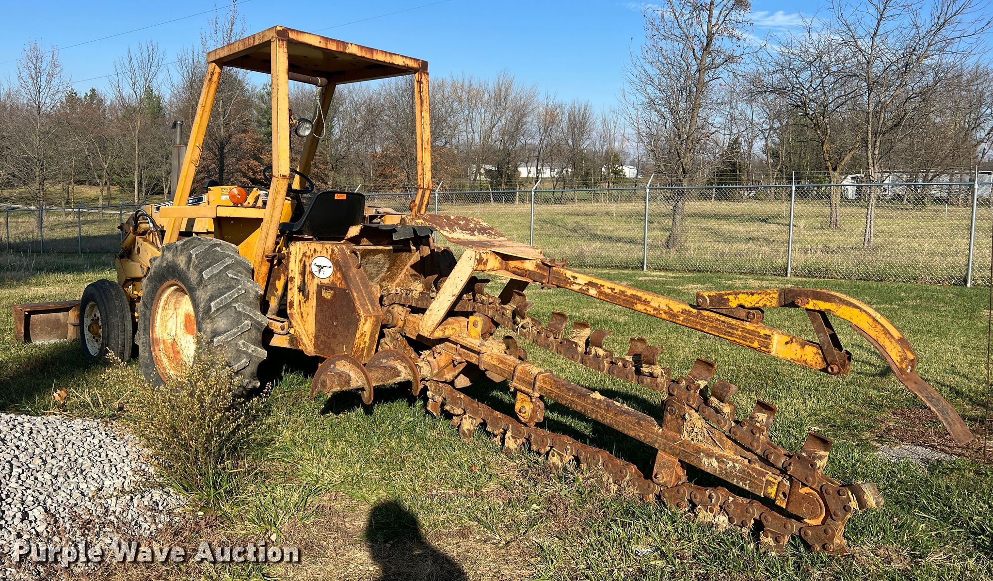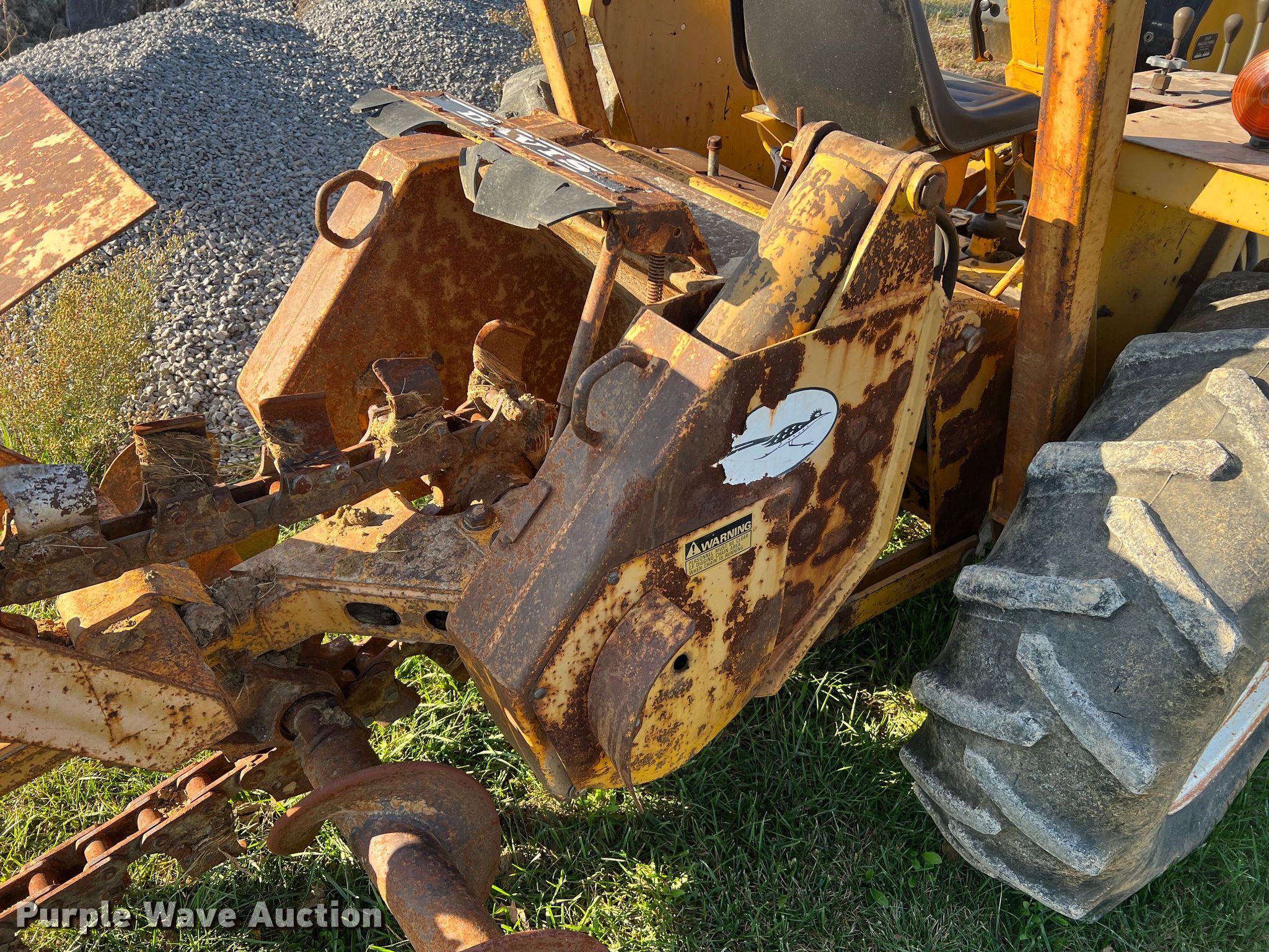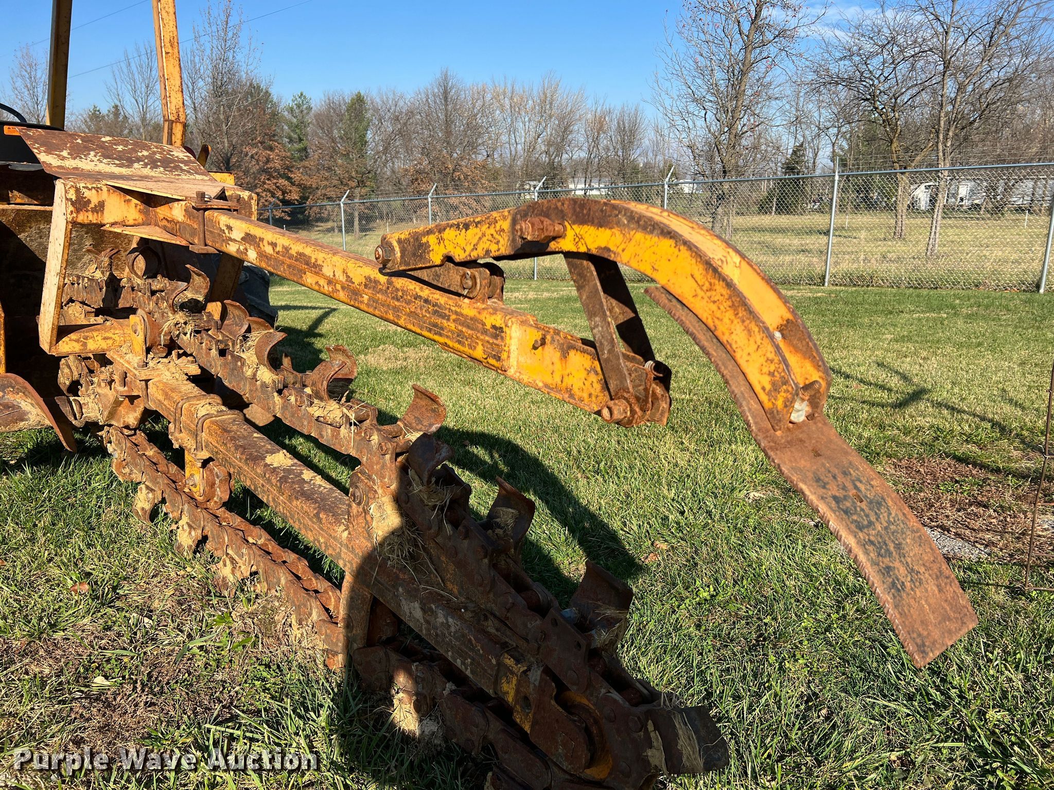 Davis Road Run'r trencher. Hours: 1,399 on meter, Serial: R623685. Engine Cylinders: 4, Fuel type: Diesel. Transmission Manual, 4F - 4R. Operators station Canopy. Features Trencher Estimated dig depth: 99", Cutting width: 7", Teeth: Dirt, Manual crumber, Backhoe Model: RD100, Serial: Q1540134, Bucket width: 20", Backfill blade Width: 83". Tires Front: 7.50-16, Rear: 14.0-24. Notes Front tires flat, Non-operational unit. 10821 North Highway Vv. Columbia, MO 65202