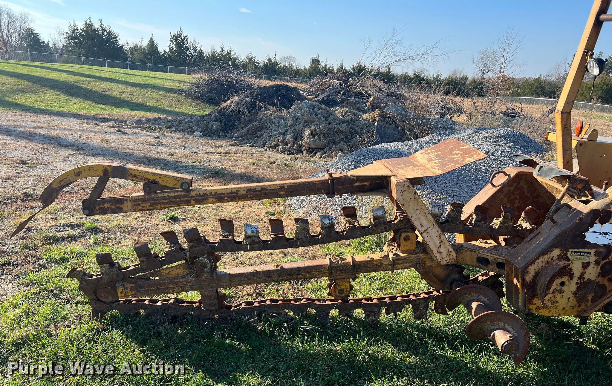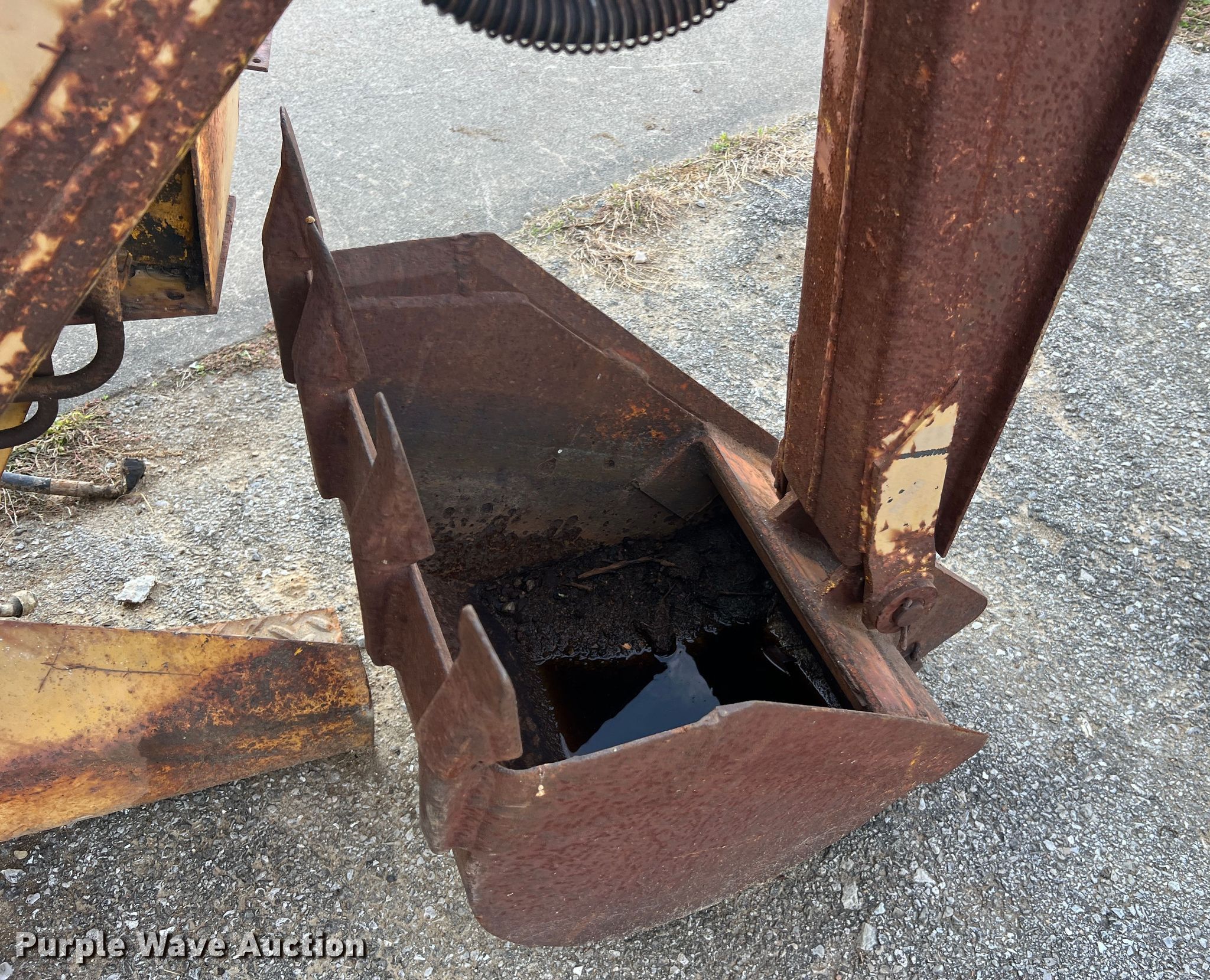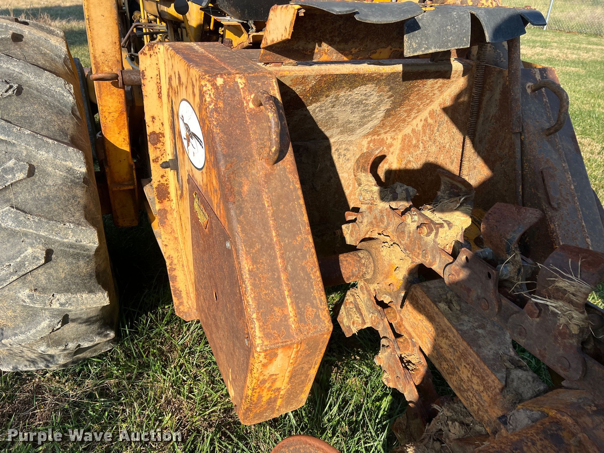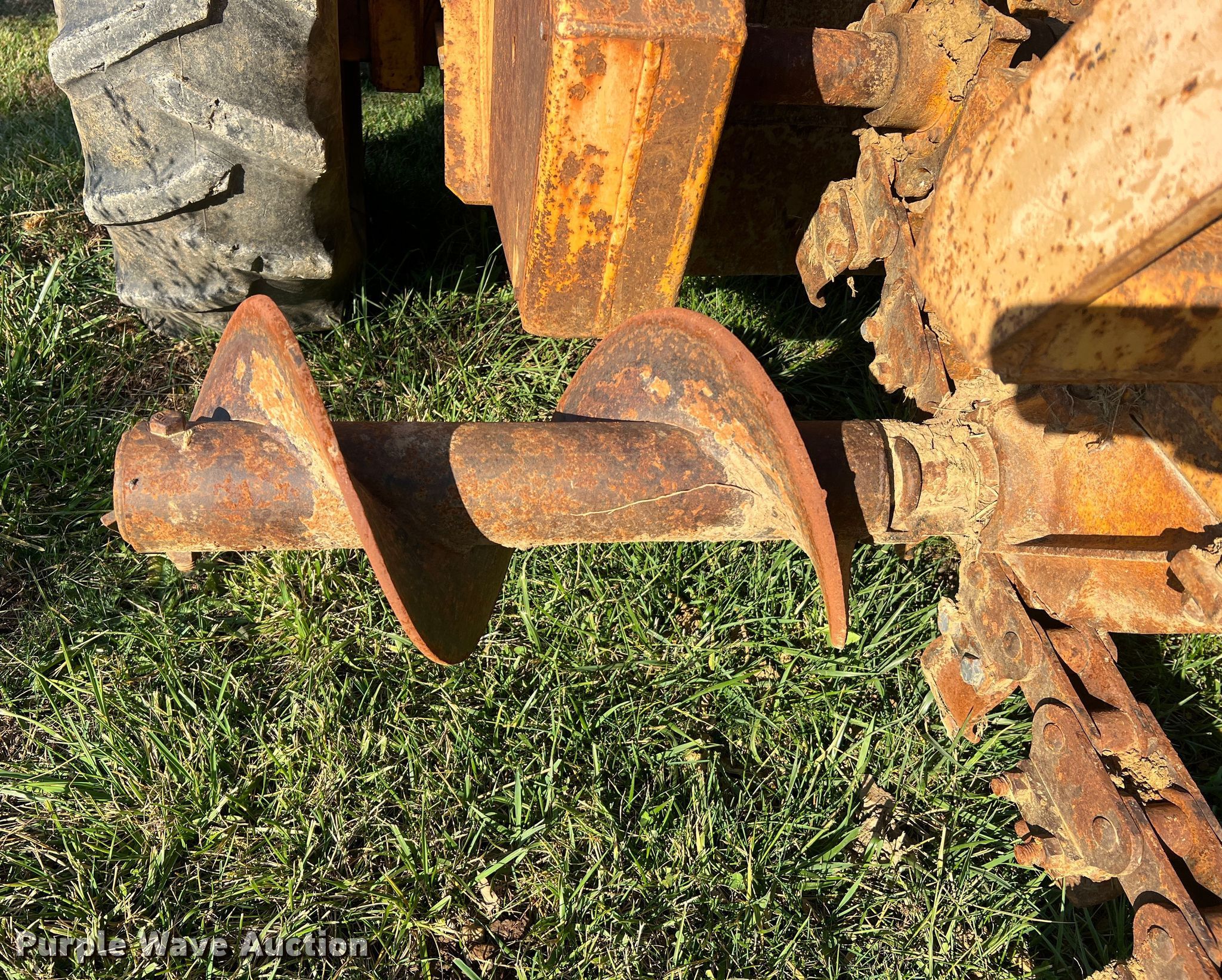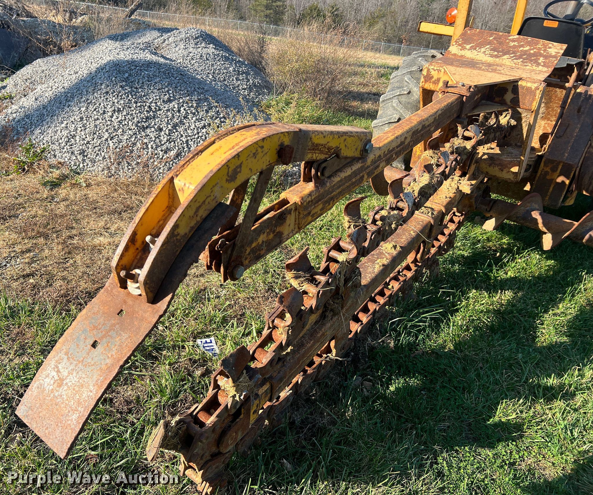 Davis Road Run'r trencher. Hours: 1,399 on meter, Serial: R623685. Engine Cylinders: 4, Fuel type: Diesel. Transmission Manual, 4F - 4R. Operators station Canopy. Features Trencher Estimated dig depth: 99", Cutting width: 7", Teeth: Dirt, Manual crumber, Backhoe Model: RD100, Serial: Q1540134, Bucket width: 20", Backfill blade Width: 83". Tires Front: 7.50-16, Rear: 14.0-24. Notes Front tires flat, Non-operational unit. 10821 North Highway Vv. Columbia, MO 65202