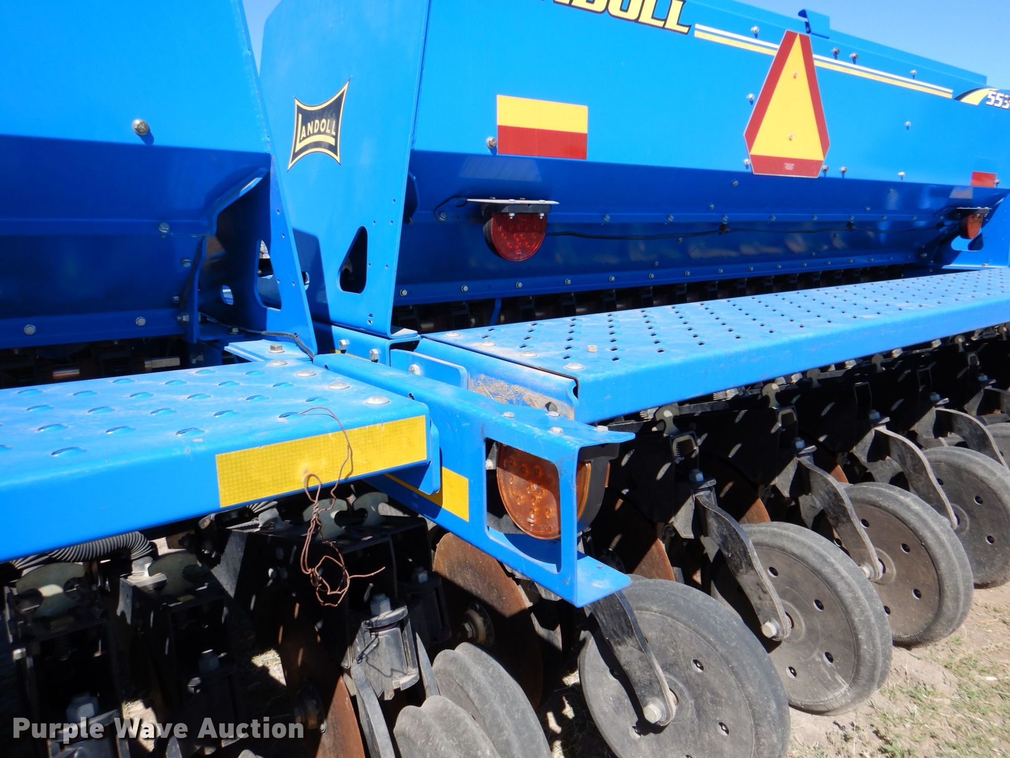 2014 Landoll 5531 grain drill. Width: 40', Row units: 64, Row spacing: 7.5", Serial: 55H1400906. Features Frame Hydraulic fold Front fold, Seed delivery Bulk fill system, Row units Meter drive: Ground, Down pressure: Pneumatic, Disk openers: Double, Closing system: Single Type: Rubber, Electronics Monitor Loup.. Tires Transport tire size: 380/55R16 Quantity: 4, Drive/ outside tire size: 11L-15SL Quantity: 4. Notes Tractor not included. Stinson & Stinson Inc.. 2220 County Rd 467. Hondo, TX 78861