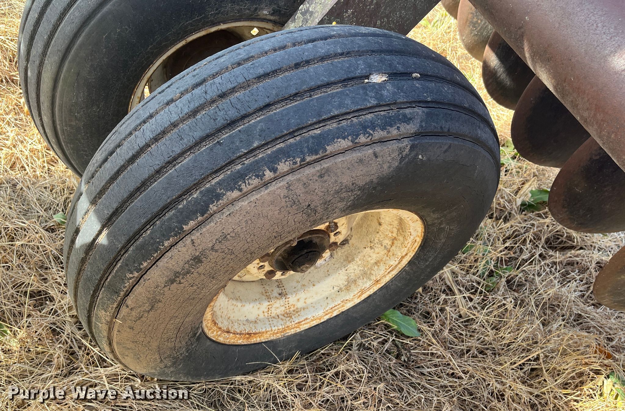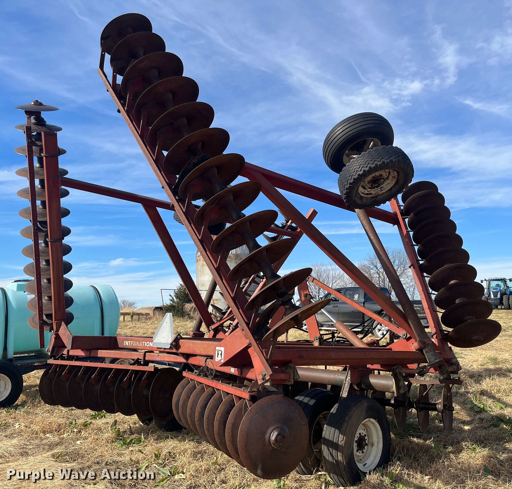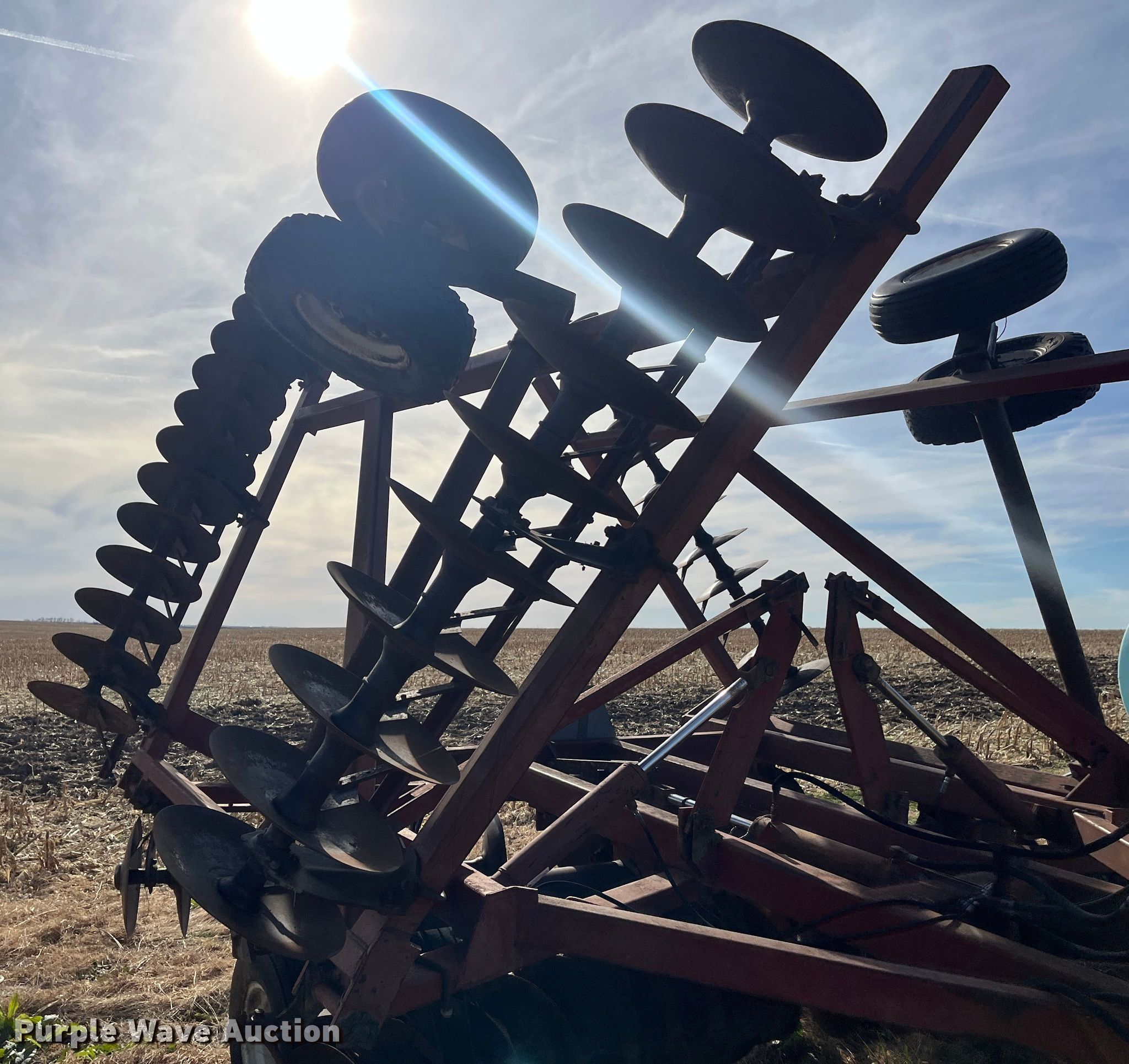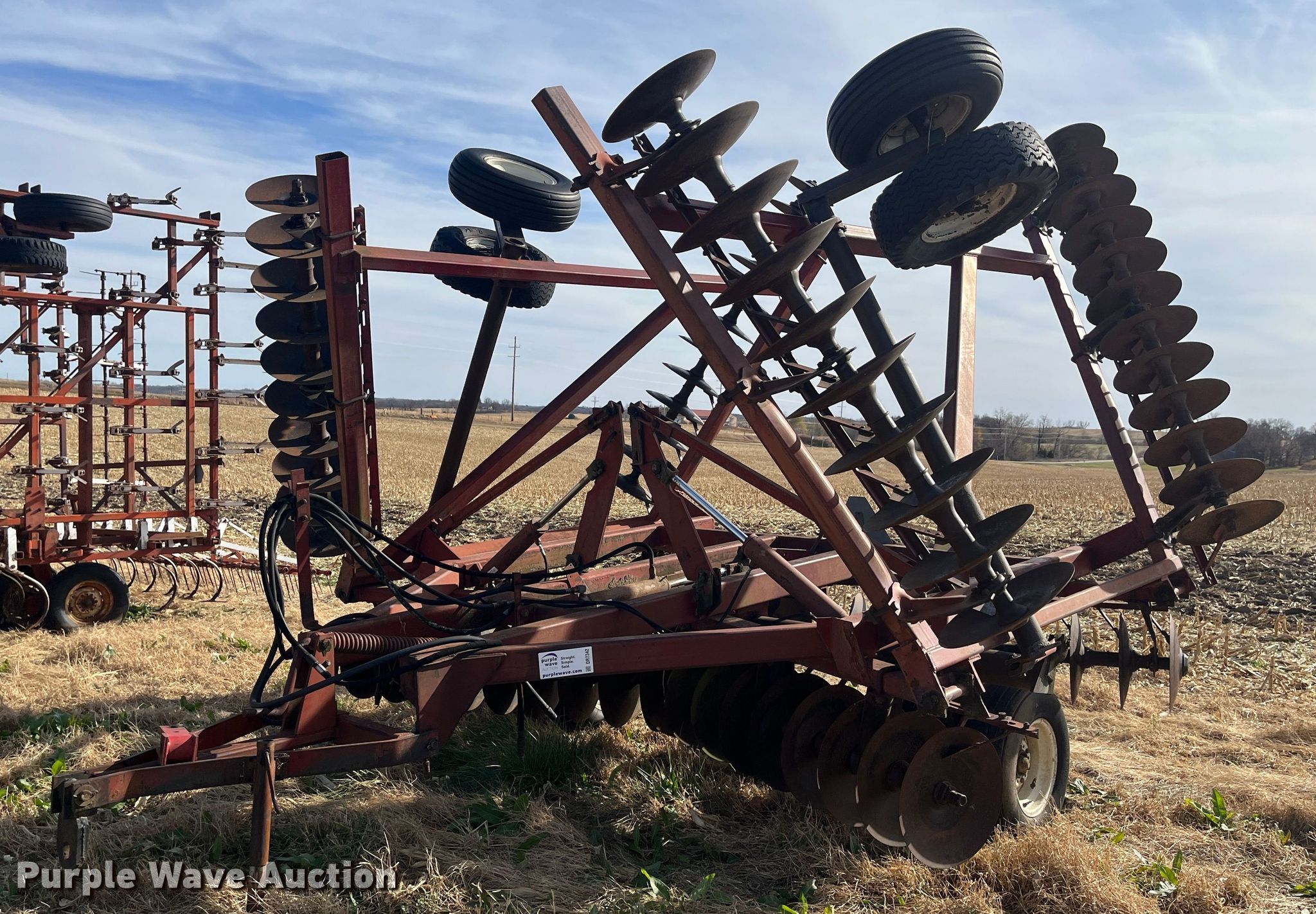 International 490 double off-set disk. Overall width: 28', Serial: 0470000U002289. Features Front blades Diameter: 20", Spacing: 9", Rear blades Diameter: 20", Spacing: 9", Disk scrapers, Operation Hydraulic lift, Hydraulic fold. Tires Tire size: 10.00-15. Bendena, KS 66008