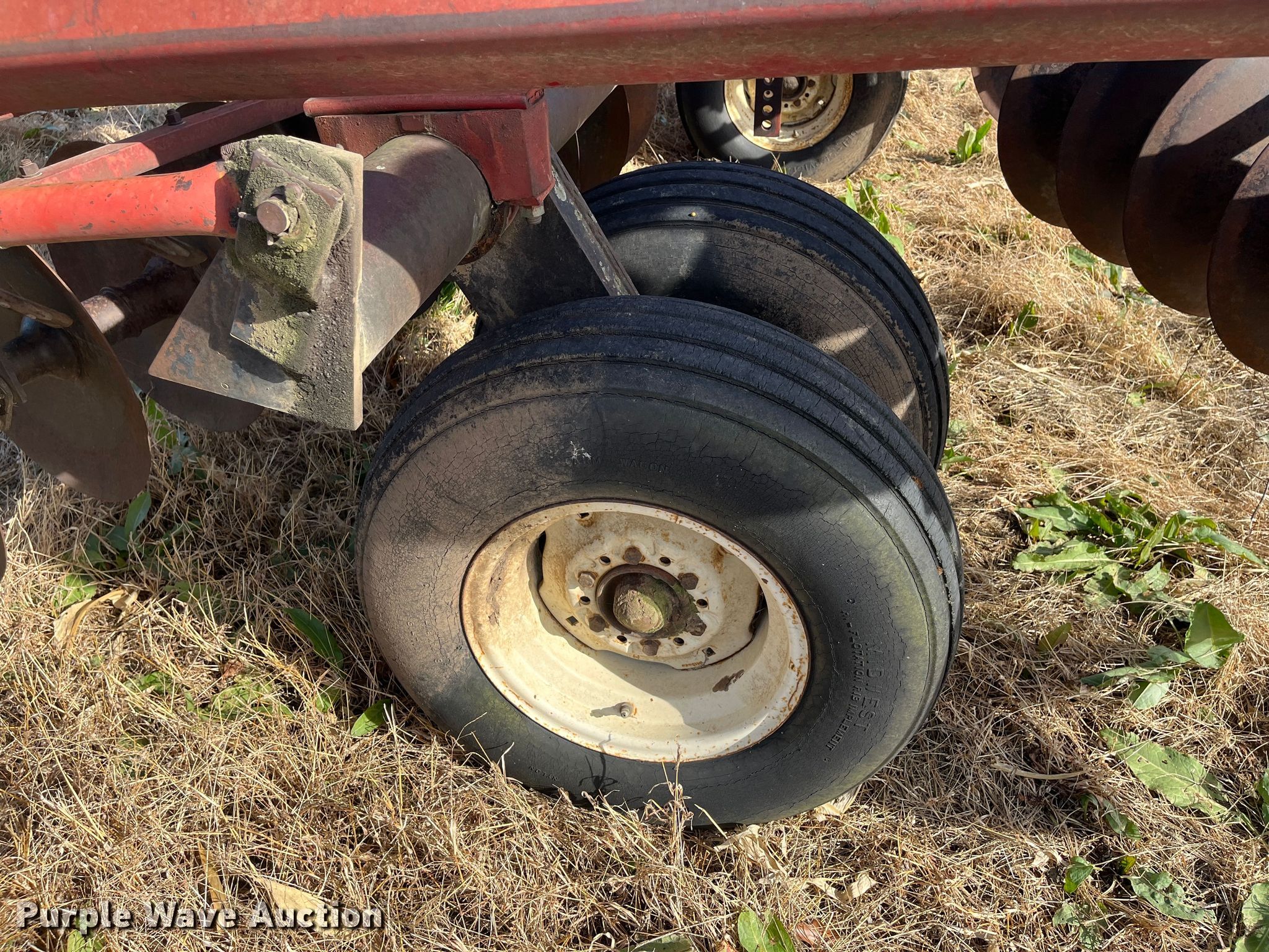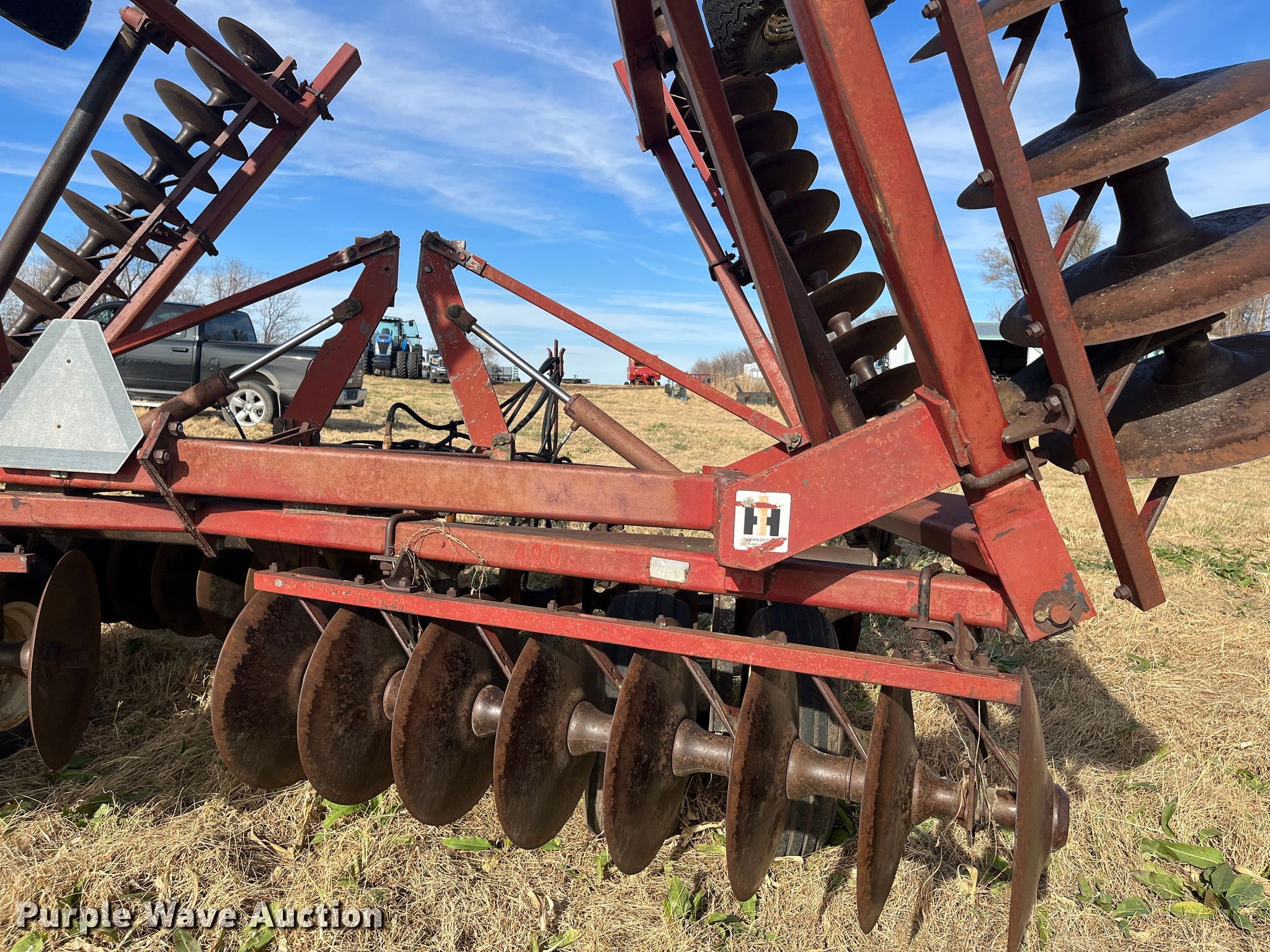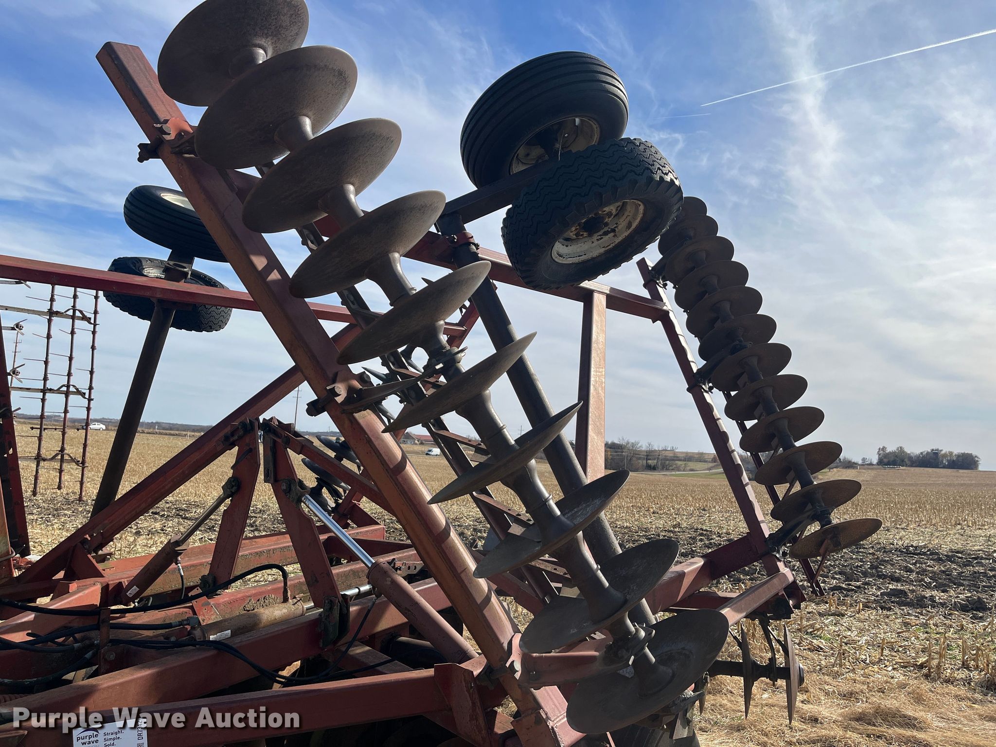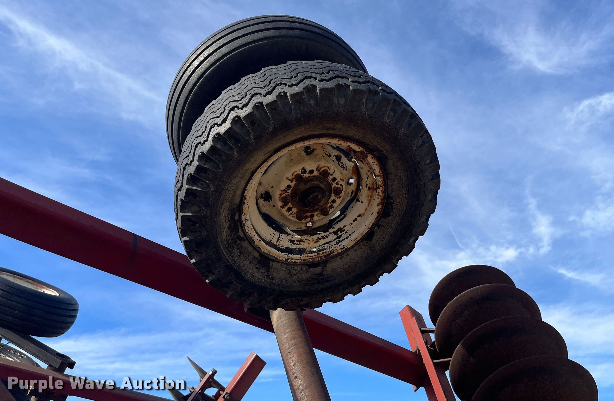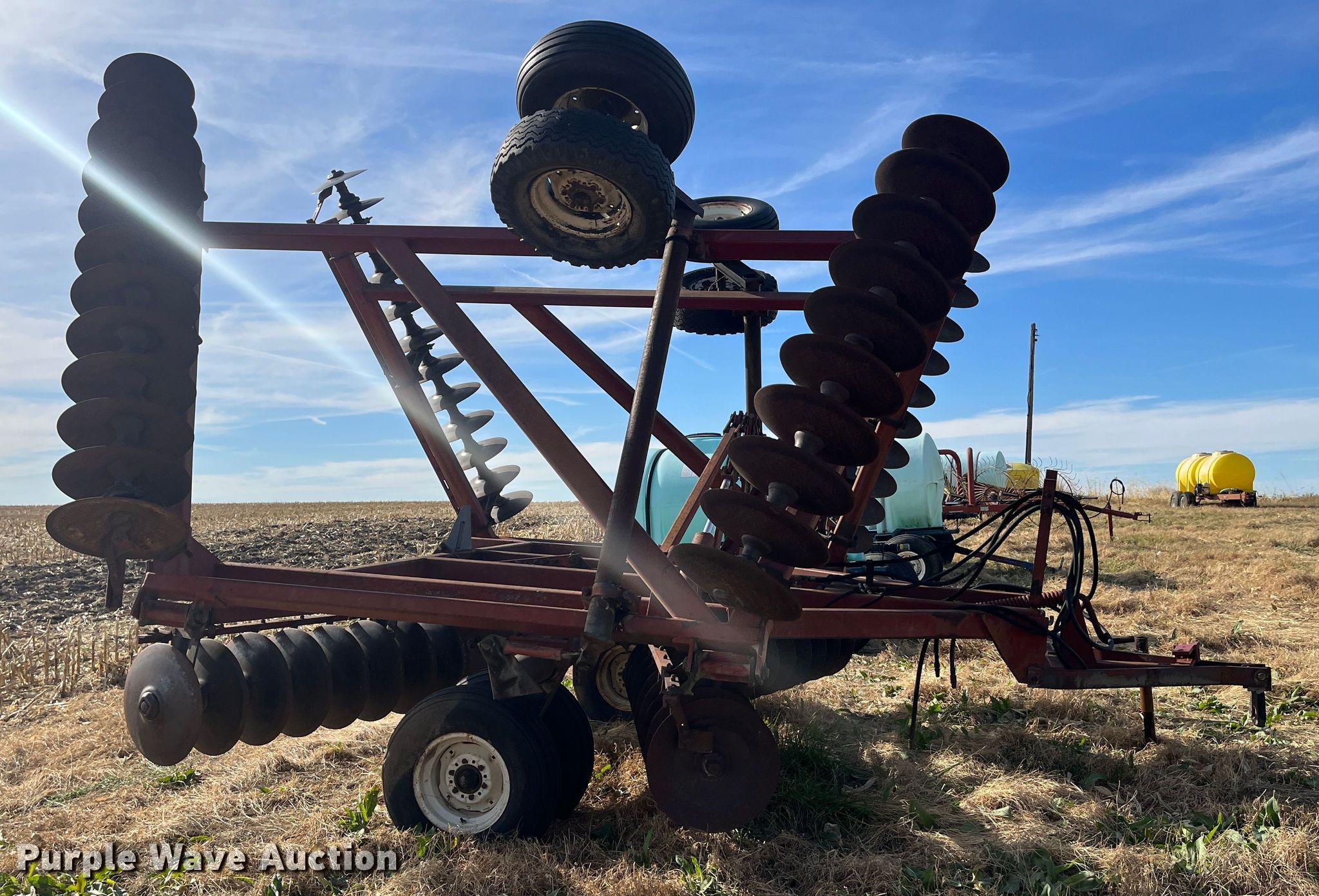 International 490 double off-set disk. Overall width: 28', Serial: 0470000U002289. Features Front blades Diameter: 20", Spacing: 9", Rear blades Diameter: 20", Spacing: 9", Disk scrapers, Operation Hydraulic lift, Hydraulic fold. Tires Tire size: 10.00-15. Bendena, KS 66008