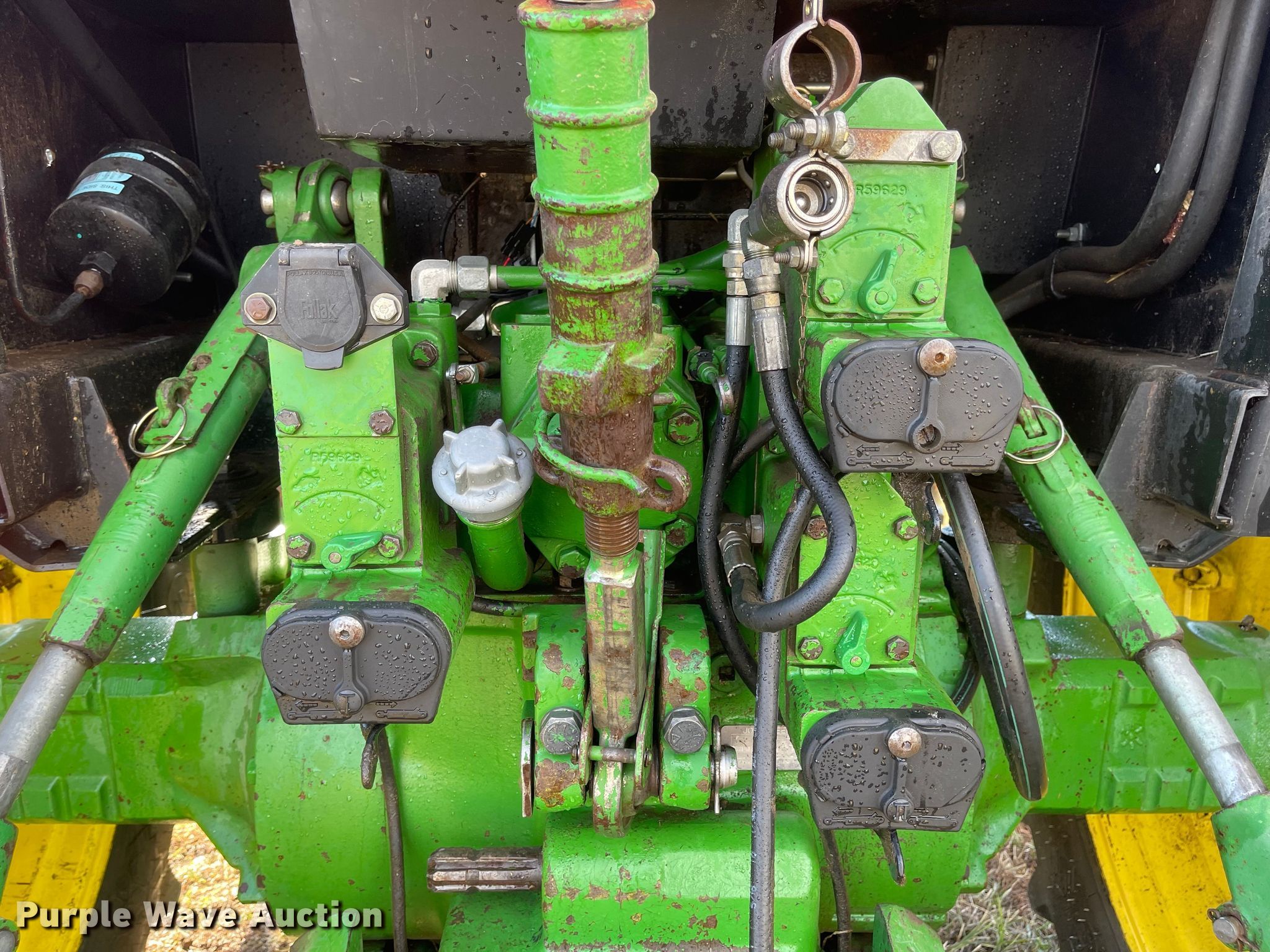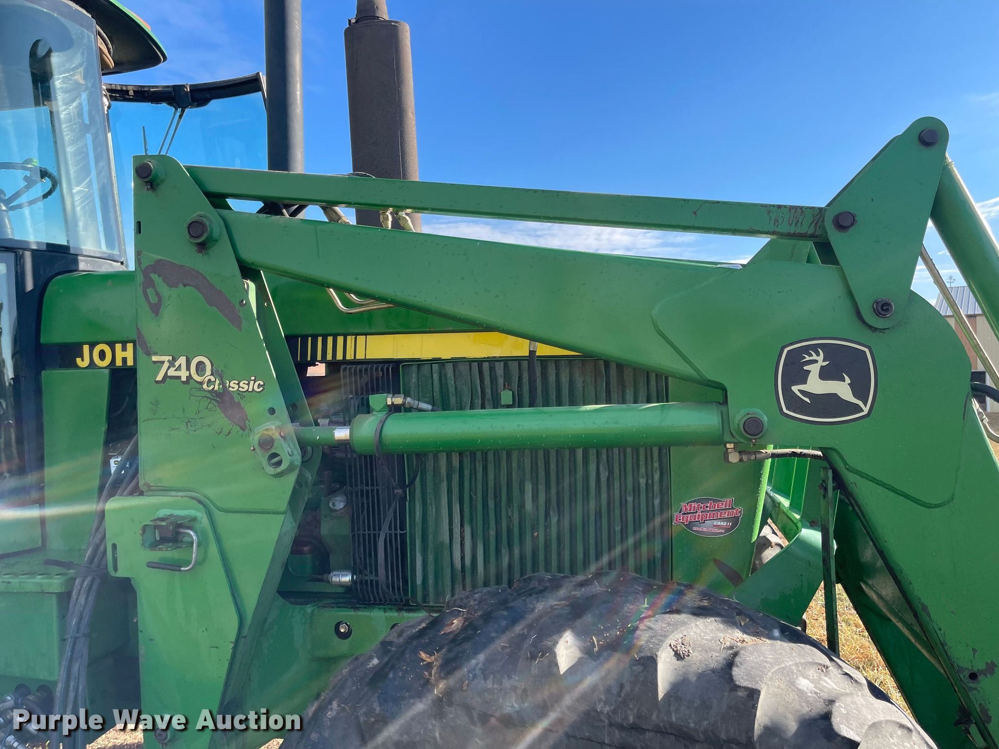 1990 John Deere 4455 MFWD tractor. Hours: 8,717 on meter, Serial: RW4455P009135. Engine John Deere, Displacement: 7.6L, Cylinders: 6, Fuel type: Diesel. Transmission Powershift, 15F - 4R. Operators station AC, Heat. Features PTO: 1000, Three point Top link, Seven pin outlet, Hydraulic remote sets Rear: 3, Loader John Deere 740 Classic, Self-leveling, Controls: Joystick, Bucket Width: 98".. Tires Front: 380/85R30, Rear: 480/80R42. Blue Rapids, KS 66411