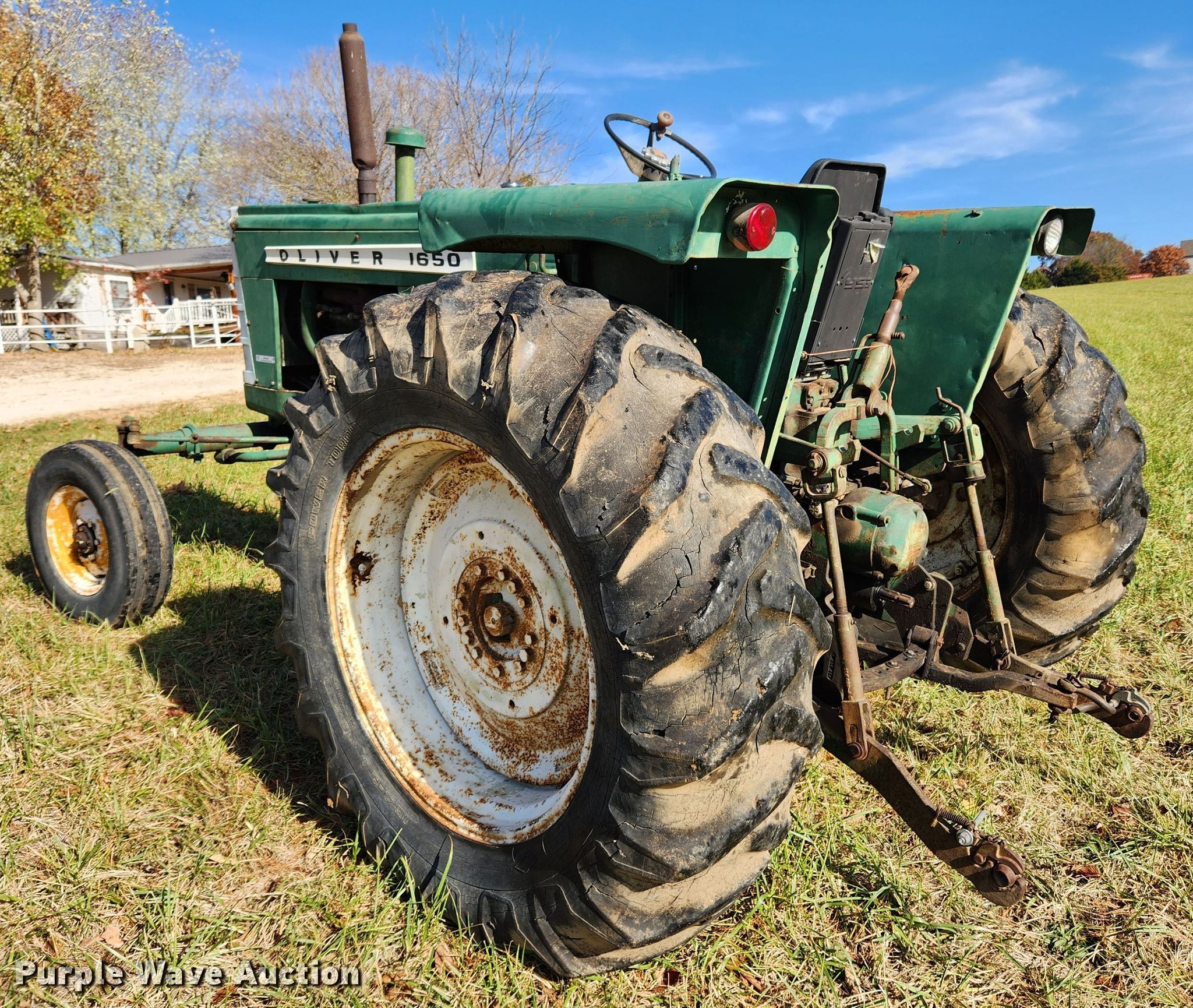 1967 Oliver 1650 tractor. Hours: 4,048 on meter, Serial: 184475-452. Engine Displacement: 4.3L, Cylinders: 6, Fuel type: Gas. Transmission Powershift, 12F - 4R. Features PTO: 540, Three point Top link, Hydraulic remote sets Rear: 2. Tires Front: 7.50-16, Rear: 18.4-34. Notes (2) additional 18.4-34 tires. Joe & Sharon Reed. Saint Clair, MO 63077