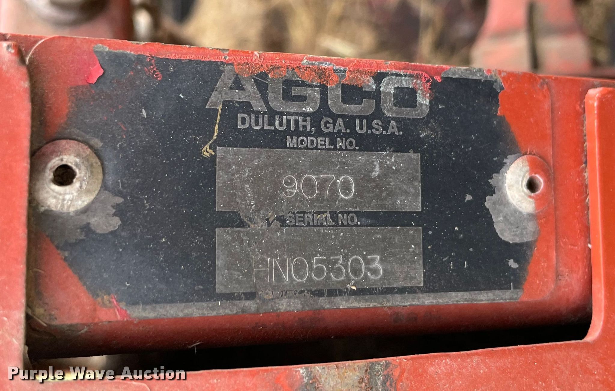 2002 Hesston 8550S windrower. Hours: Unknown, Serial: HL46209, Claim# 2-809748. Engine Cylinders: 6, Fuel type: Diesel. Transmission Hydrostatic. Operators station AC, Heat. Features Electronics Monitor, Head Disc, Hesston 9070, Serial: HN05303, Width: 15', Conditioners: Steel/ steel. Tires Front: 23.1-26, Rear: 32x11.50-15. Notes Fire damage, Non-operational unit. Insurance salvage unit. Oklahoma Farm Bureau Insurance. 11596 Northeast Keeney Road. Elgin, OK 73538