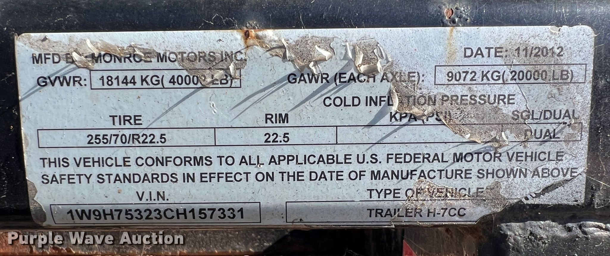 Purple Wave is selling a used Car Carrier in Oklahoma. This item is a 2013 Wally-Mo H-7CC car carrier with the following: VIN: 1W9H75323CH157331