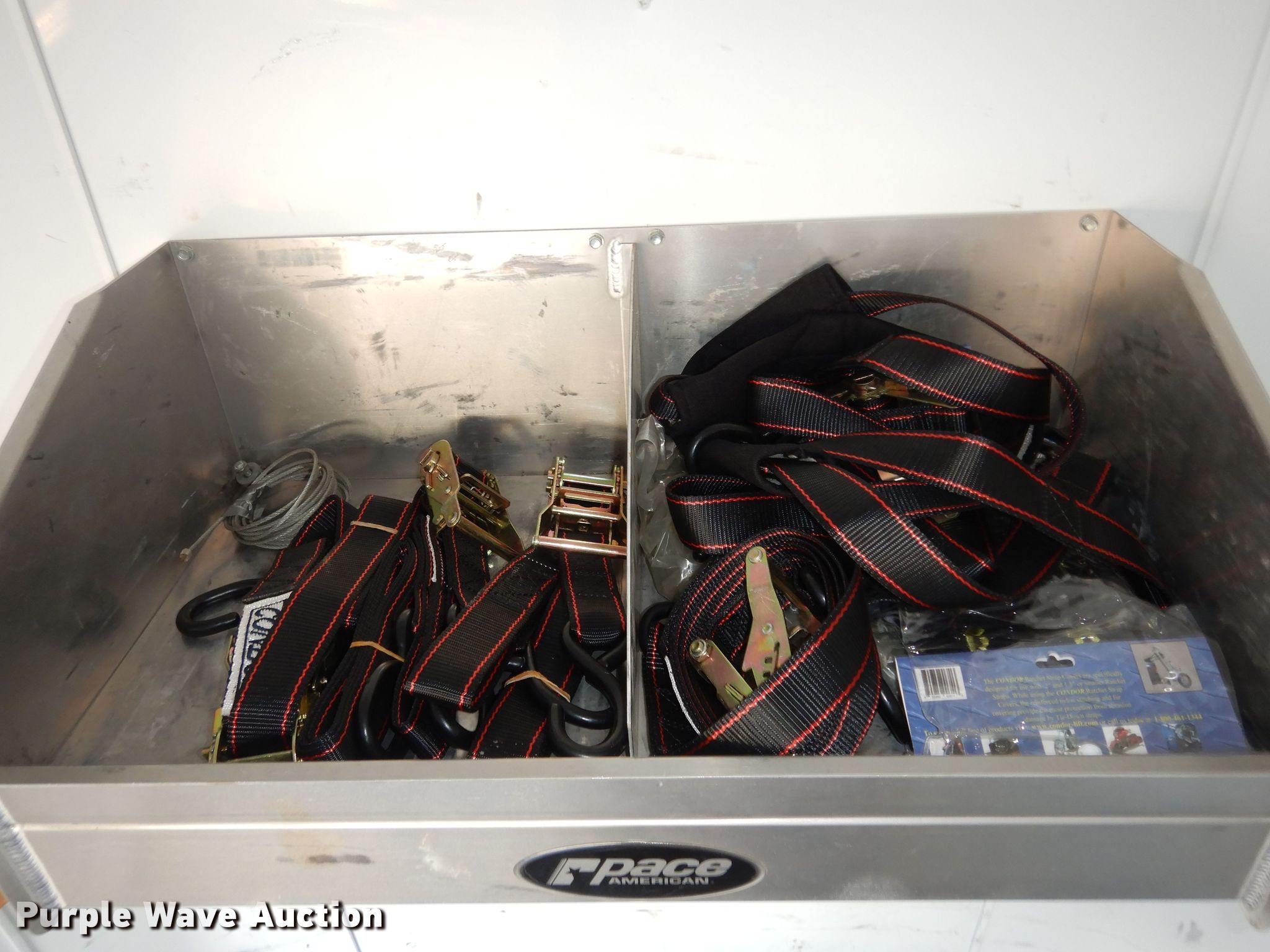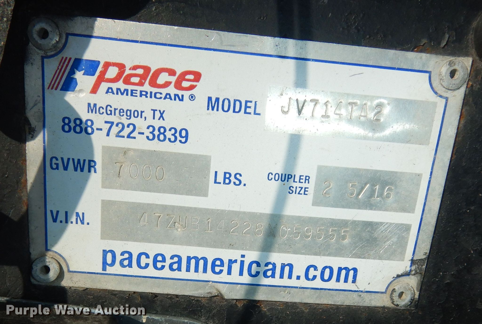 2008 Pace American JV714TA2 enclosed cargo trailer. VIN: 47ZUB14228X059555. Dimensions Overall: 15' 9" L x 8' 6" W, Body: 14' L x 7' W. Chassis Ball hitch: 2 5/16", Landing gear: Single, Suspension: Spring, Axles: Tandem, GVWR: 7,000 lbs. Tires Size: 205/75R15. Notes Contents included, Locks not included. View repairs. Kansas title. 825 Levee Dr.. Manhattan, KS 66502