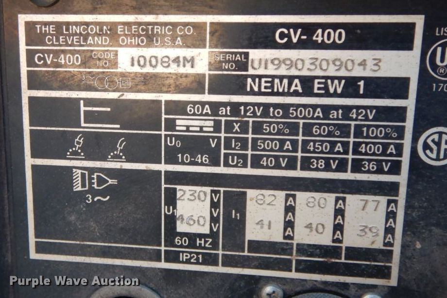 Purple Wave is selling a used Welder (Manual) in Kansas. This item is a Lincoln CV-400 welder with the following: Serial: U1990309043