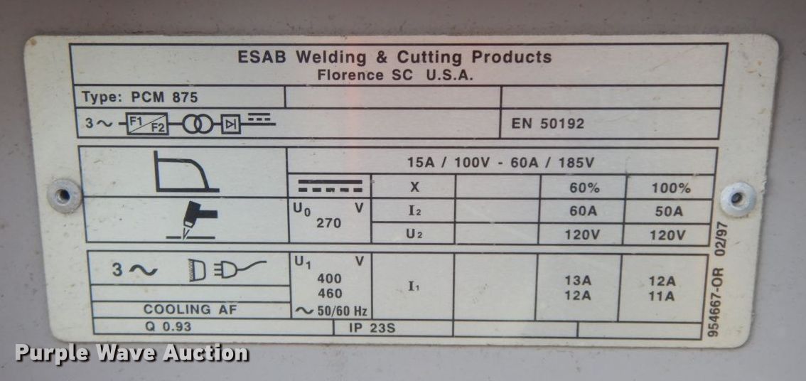 Purple Wave is selling a used Hand Held Plasma Cutter in Kansas. This item is a Esab PCM-875 plasma cutter with the following: Serial: PD-J348083