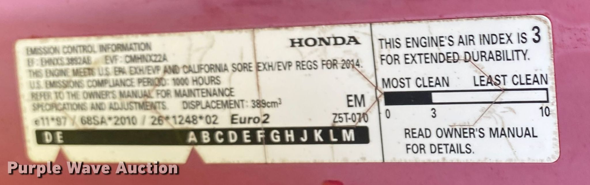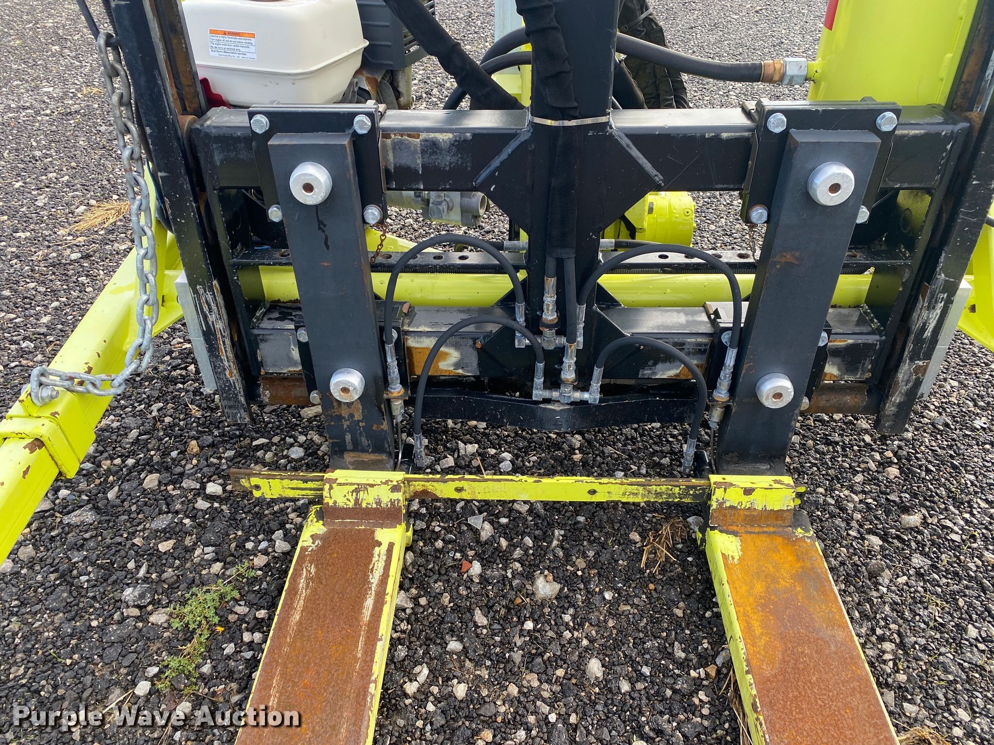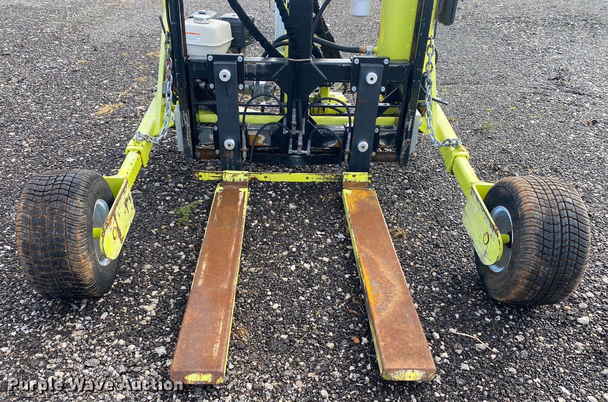 2014 Donkey Burro B13-3K forklift. Serial: JG. Engine Honda GX390, Displacement: 389 cc, Cylinders: 1, Fuel type: Gas, HP: 11, kW: 8. Transmission Hydrostatic. Features Maximum lift capacity: 3,000 lbs, Maximum lift height: 65", Mast stages: 1, Mast tilt, Fork length: 50". Tires Size: 215.60-8. 15600 N 145th E. AVE. Collinsville, OK 74021