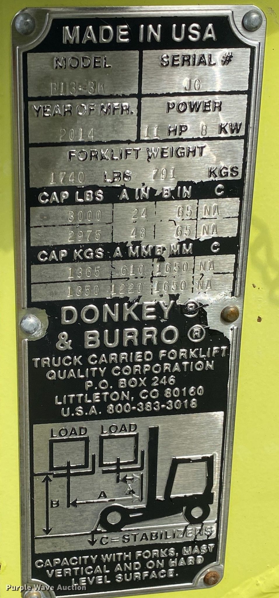 Purple Wave is selling a used Truck Mounted Forklift in Oklahoma. This item is a 2014 Donkey Burro B13-3K forklift with the following: Serial: JG