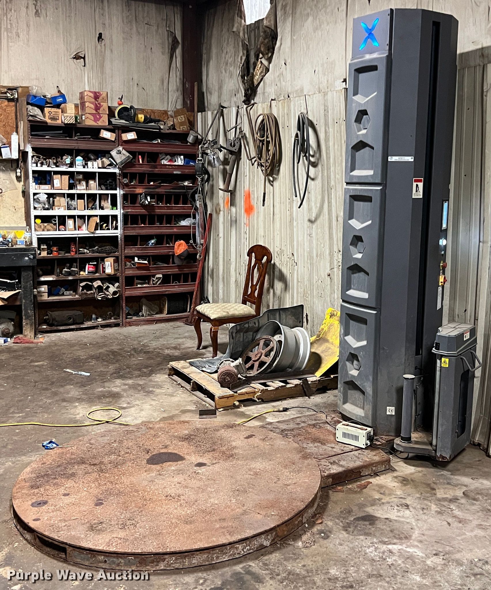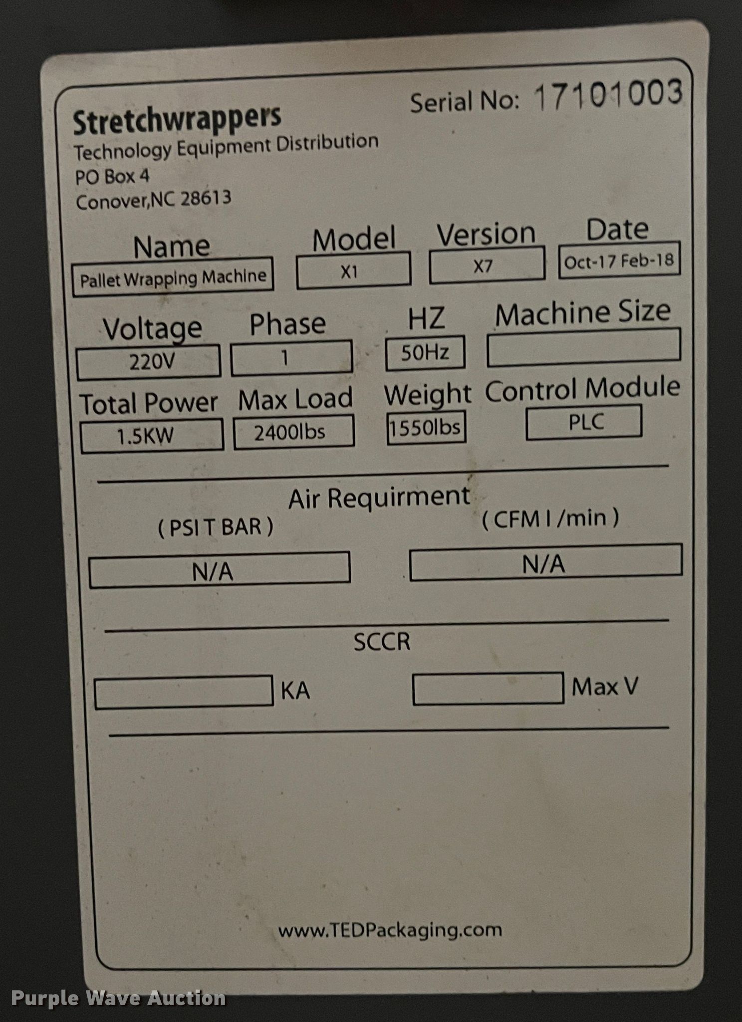 Purple Wave is selling a used Tools in Oklahoma. This item is a Stretchwrappers X1 shrink wrapping machine with the following: 2400 lbs max load, Single phase, Serial: 17101003