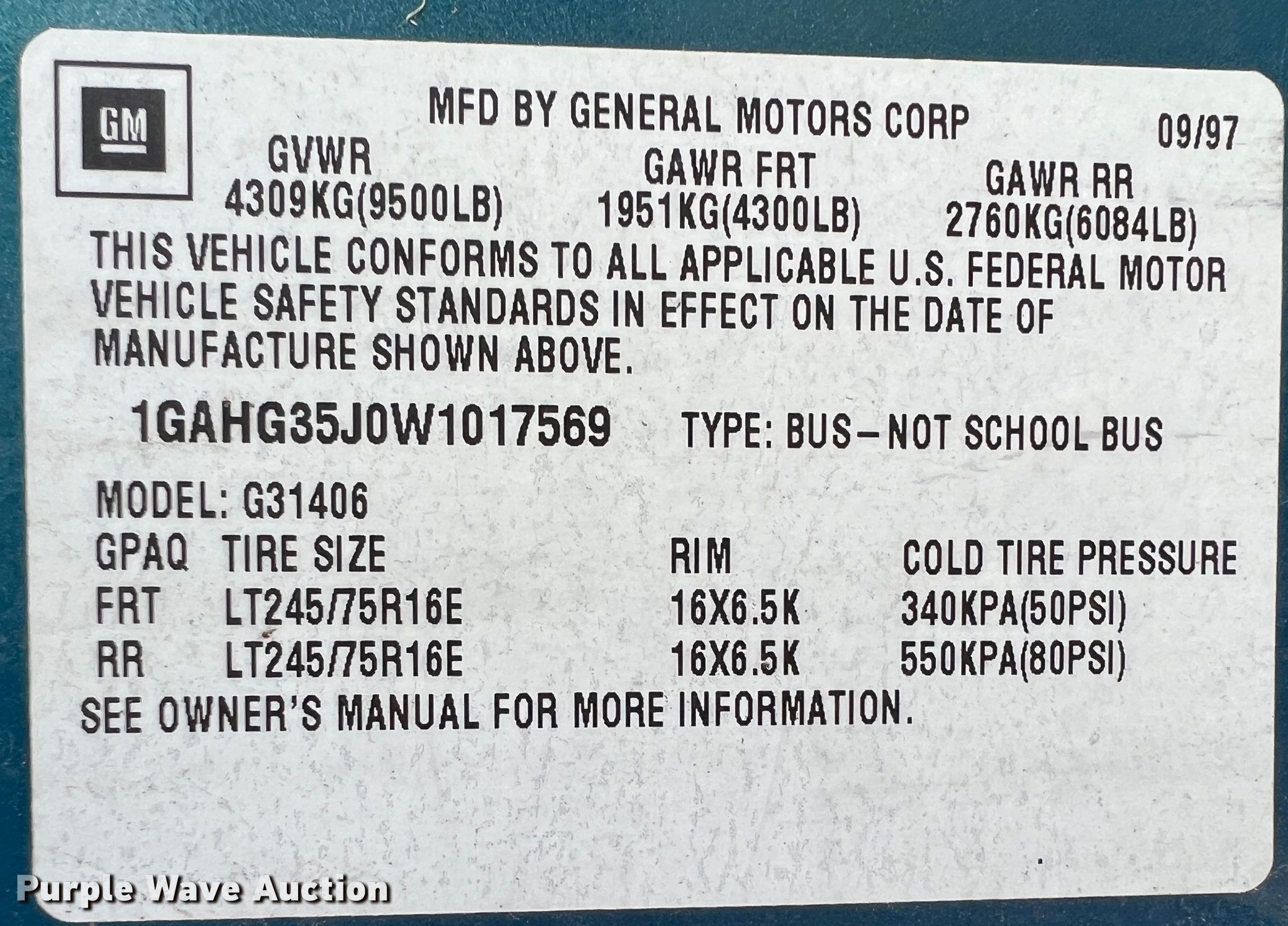 Purple Wave is selling a used Passenger Vehicle in Oklahoma. This item is a 1998 Chevrolet Express G3500 van with the following: Miles: 128,950 on odometer, VIN: 1GAHG35J0W1017569