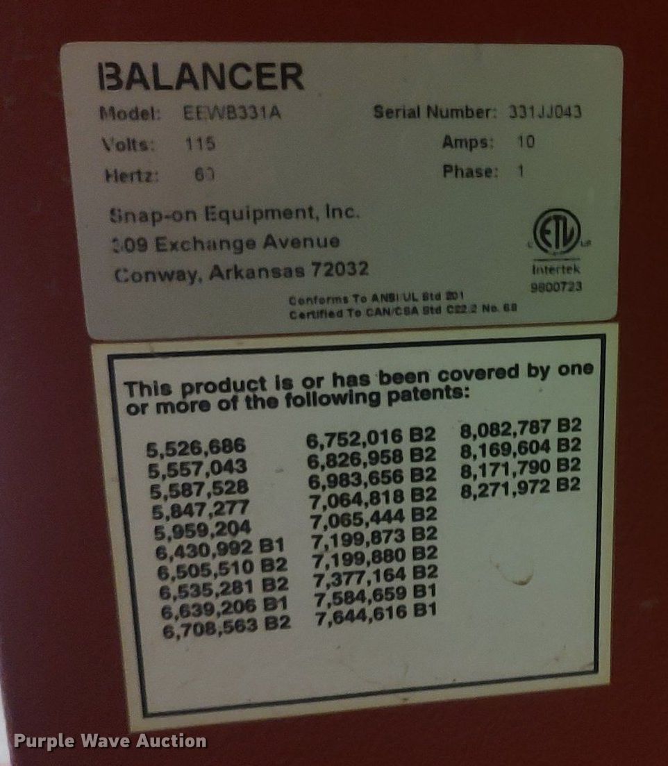 Purple Wave is selling a used Tools in Kansas. This item is a Snap On EEWB331A tire balancer with the following: Serial: 331JJ043, 115V, 10 amps, Single phase