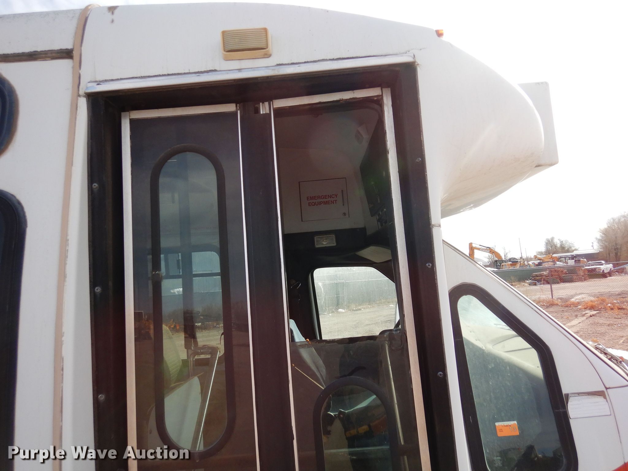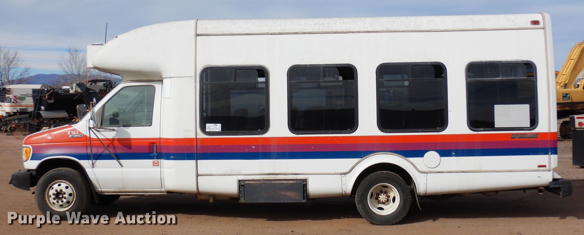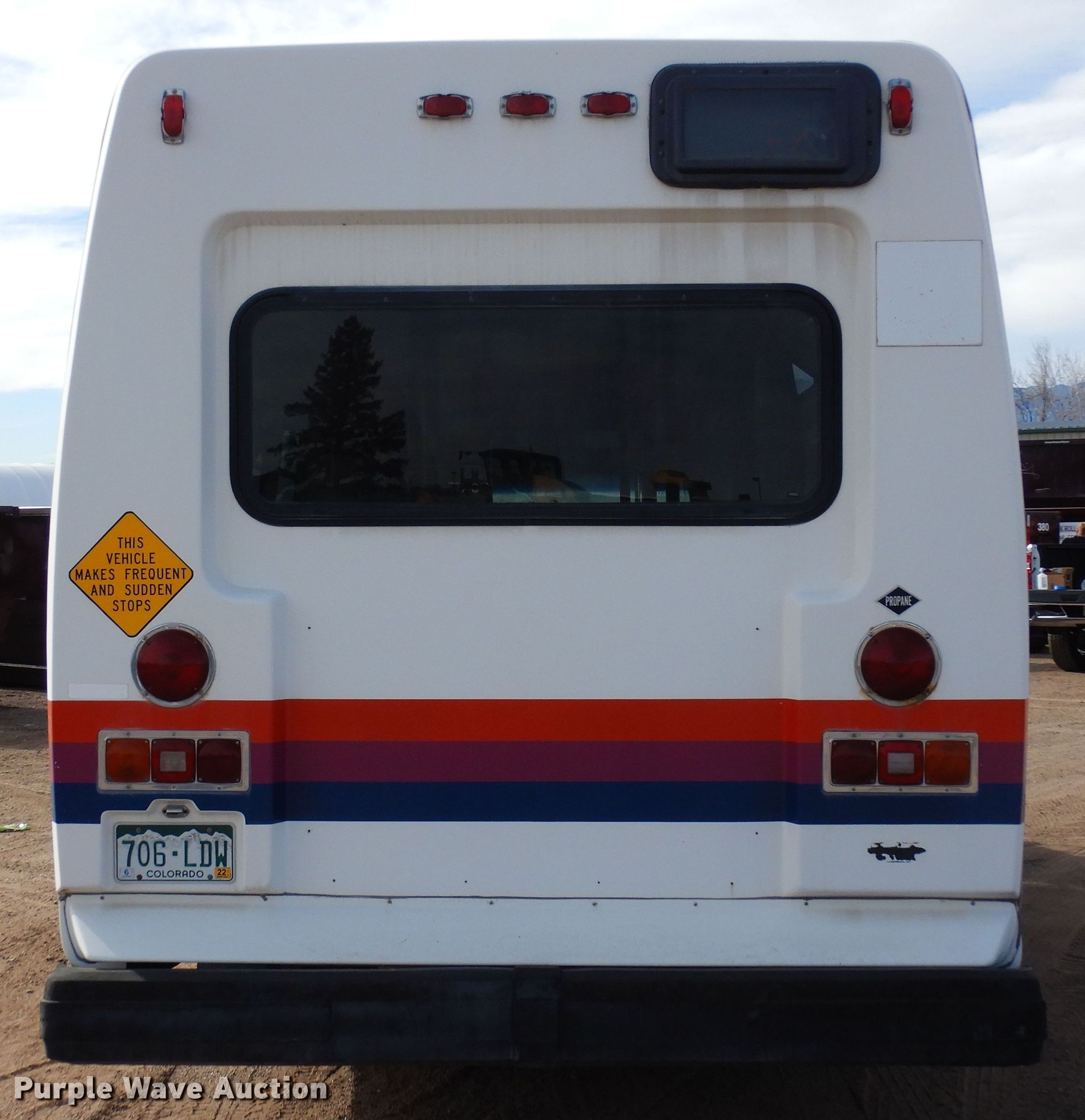 1994 Ford E350 shuttle bus. Miles: 215,160 on odometer, VIN: 1FDKE30G2RHB83775. Engine Ford, Displacement: 7.5L V8 OHV, Cylinders: 8, Fuel type: LPG. Transmission Automatic. Chassis Axles: Single, Suspension: Spring, Brakes: Hydraulic. Interior AC, Heat, Cruise control, Auxiliary controls, Passengers: 14, Wheelchair lift. Tires Front: LT245/75R16, Rear: LT225/75R16. Notes Glass missing. Colorado title. Title distribution may be delayed up to 14 days from verification of funds. Trax Construction. 5575 East Bijou Street. Colorado Springs, CO 80916