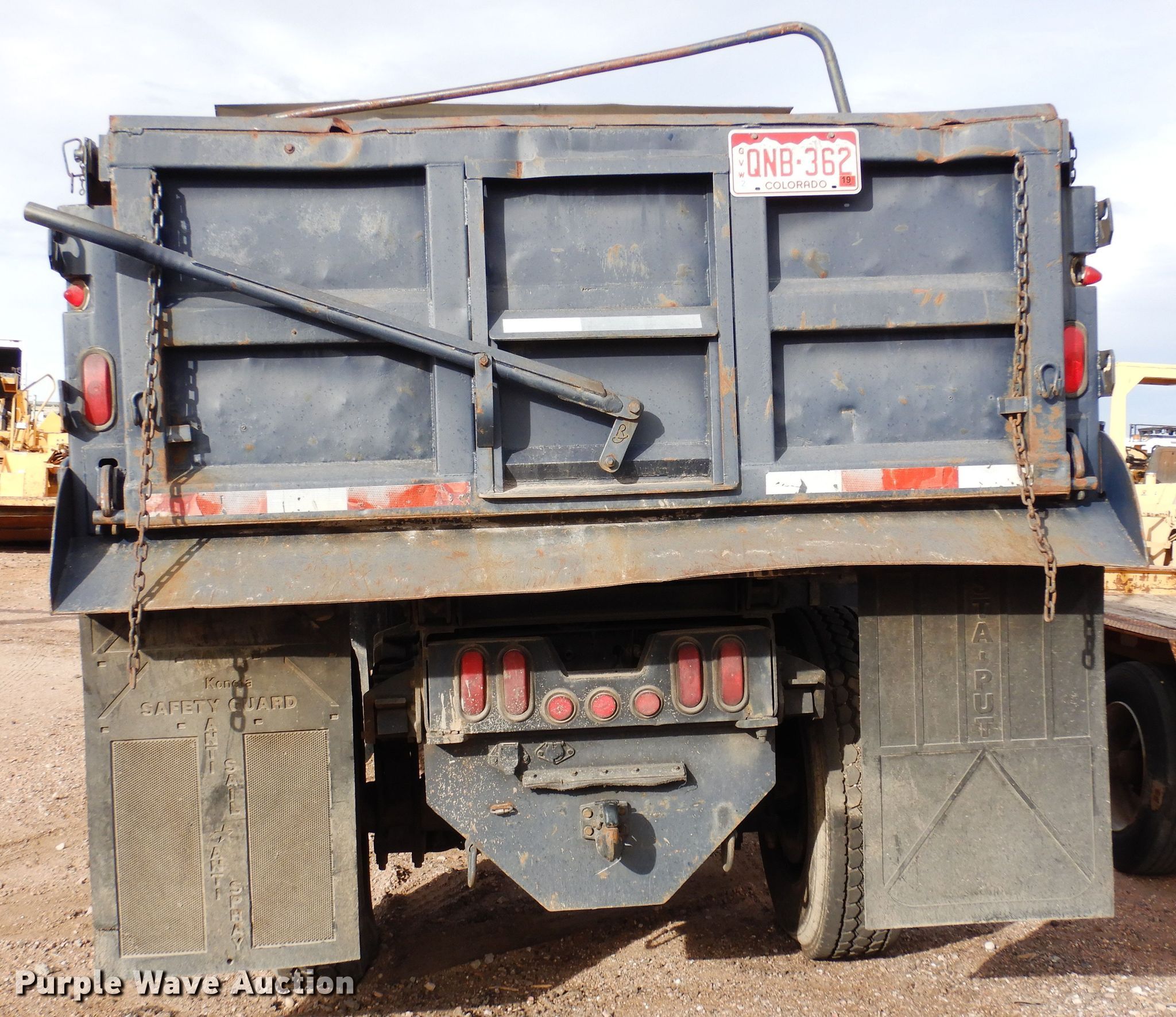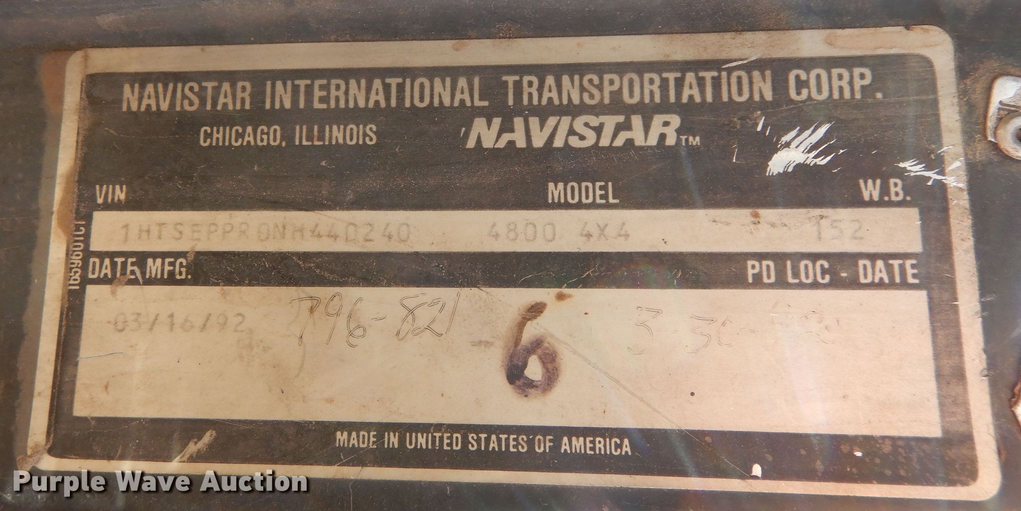 1992 International 4800 dump truck. Miles: 326,240 on odometer, Hours: 9,666 on meter, VIN: 1HTSEPPR0NH440240. Engine International DT466, Displacement: 7.6L, Cylinders: 6, Fuel type: Diesel. Transmission Eaton Fuller Roadranger, Speed: 10. Chassis Four wheel drive, Axles: Single, Suspension: Spring, Brakes: Air, PTO, GVWR: 35,000 lbs FAWR: 12,000 lbs, RAWR: 23,000 lbs, Wheelbase: 152". Interior Heat. Features Dump bed 10' 10" L x 96" W, Side height: 38", Side board height: 8", Bed type: Steel, End gate: Manual. Tires Size: 11R22.5. Notes Non-operational engine, Front drive shaft missing, Tires and wheels missing, Non-operational unit. Colorado title. Title distribution may be delayed up to 14 days from verification of funds. Trax Construction. 5575 East Bijou Street. Colorado Springs, CO 80916