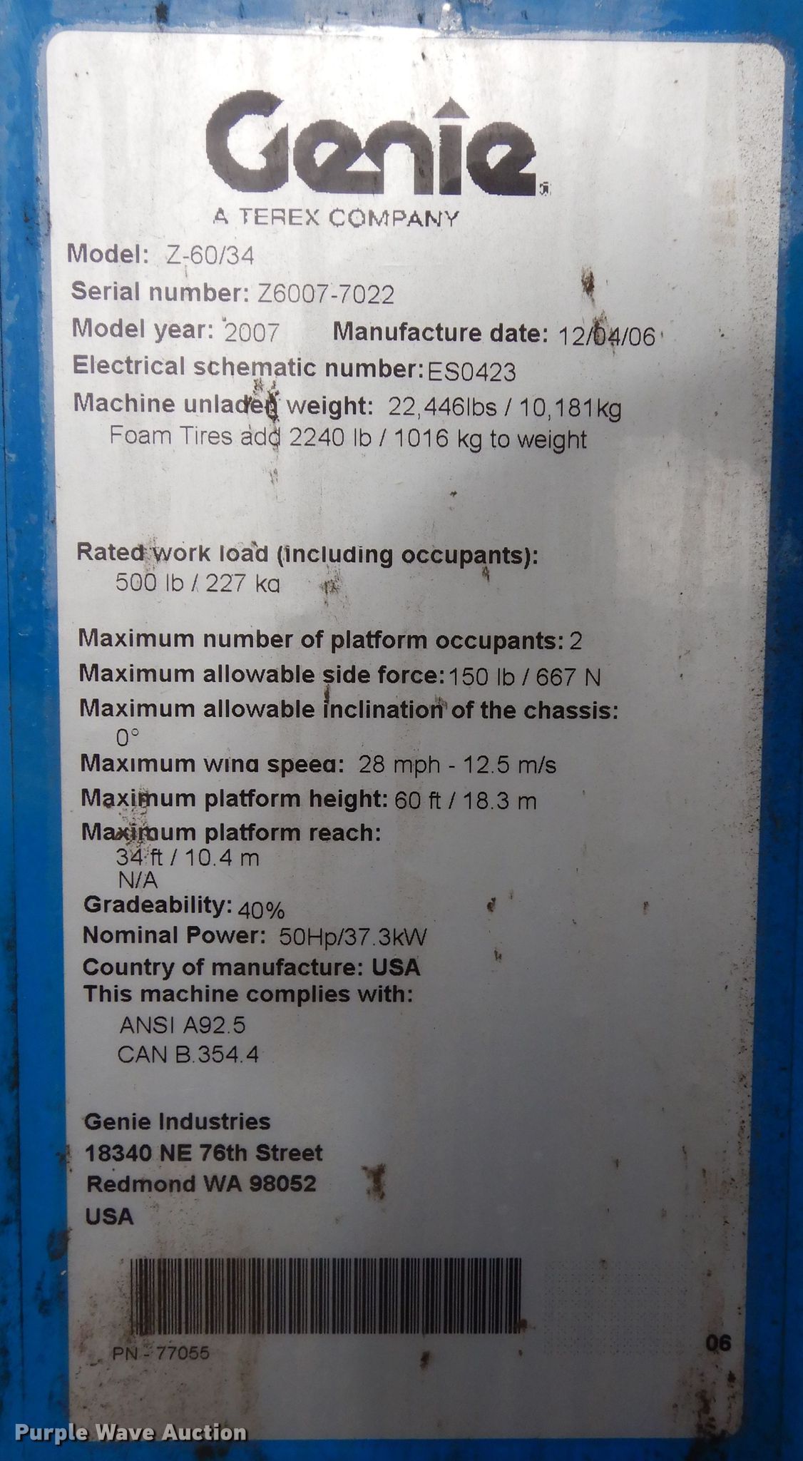 Purple Wave is selling a used Boom Lift in Kansas. This item is a 2007 Genie Z60/34 boom lift with the following: Hours: 796 on meter, Serial: Z6007-7022, Unit #: 684175